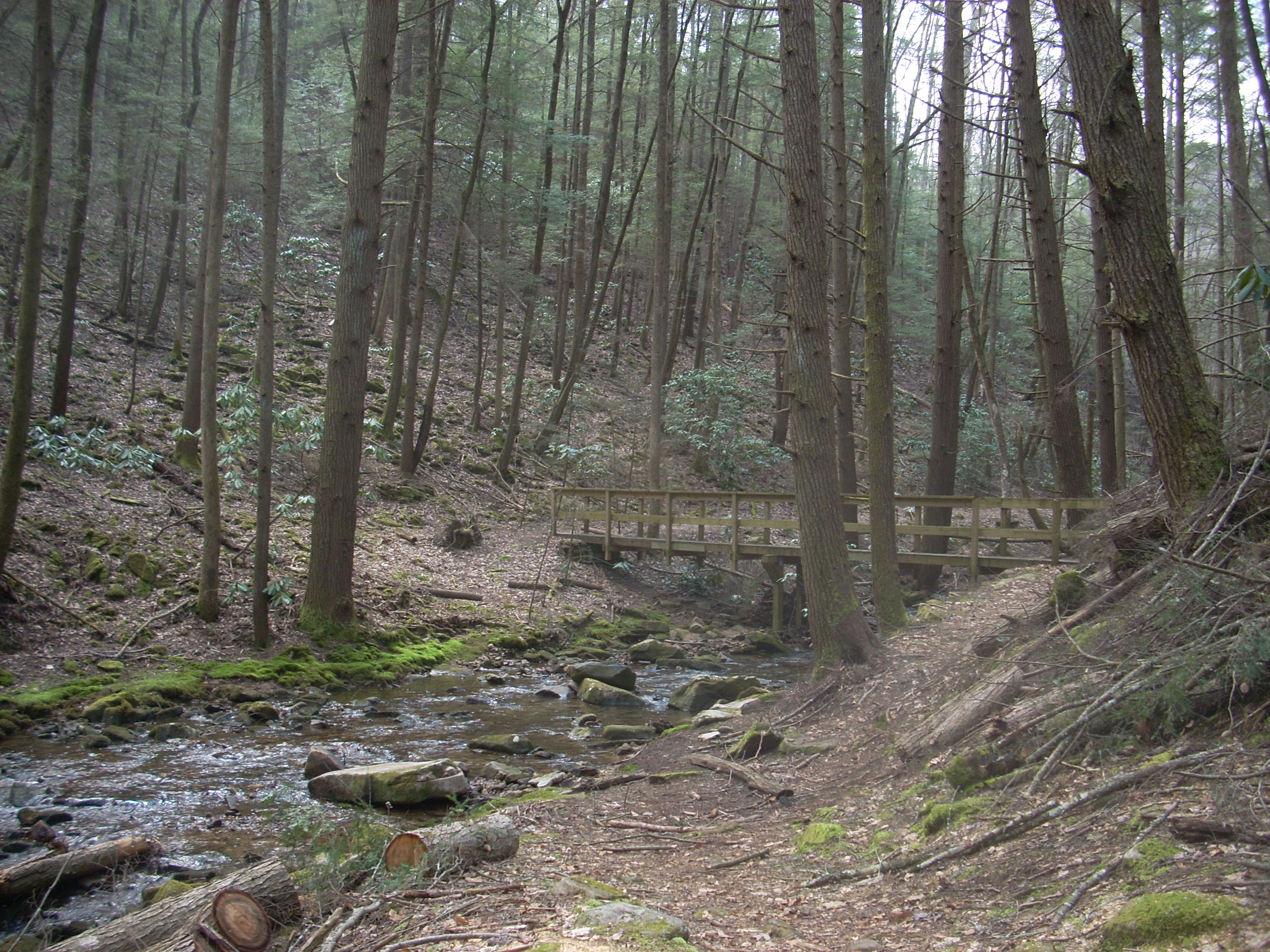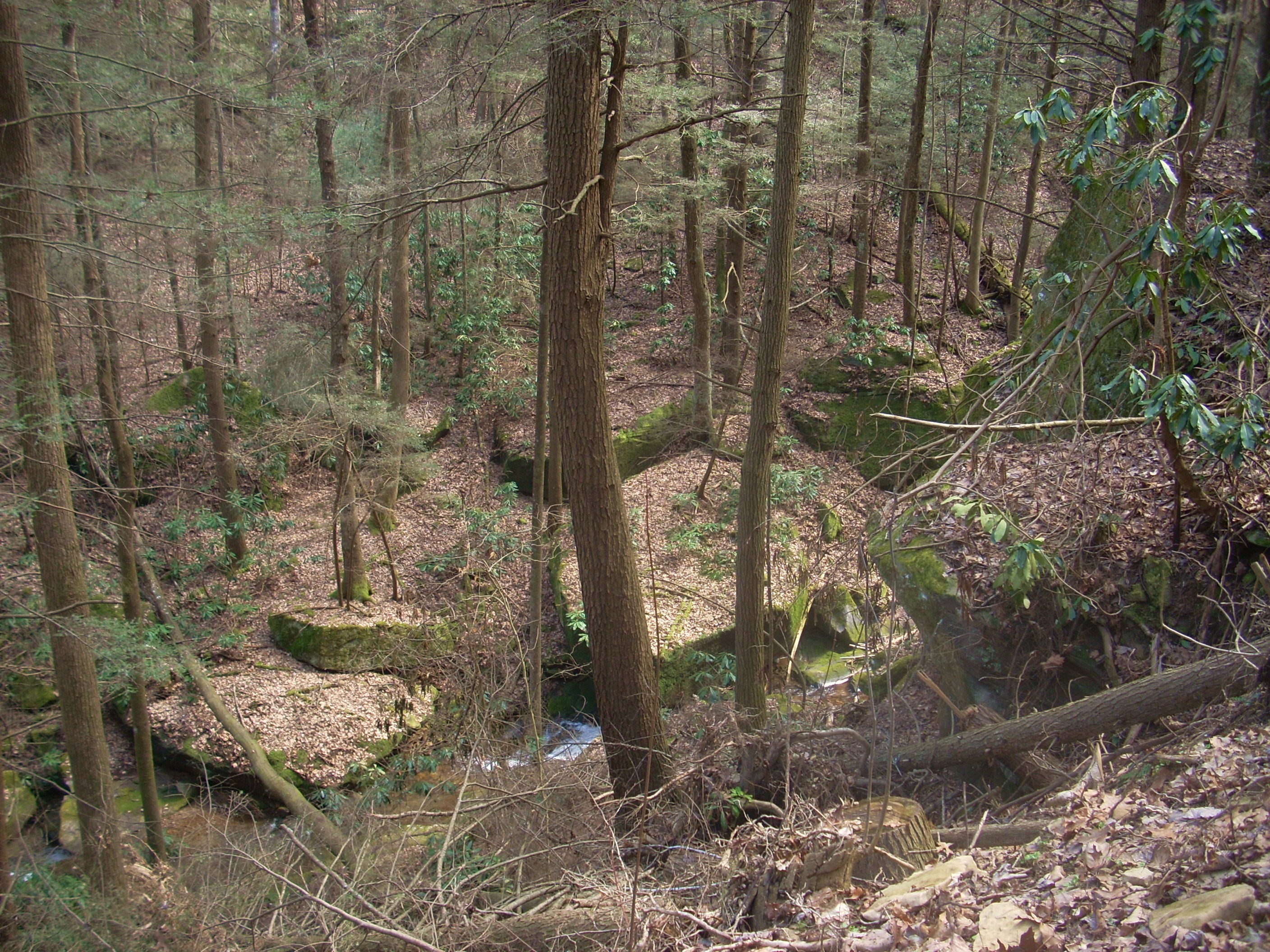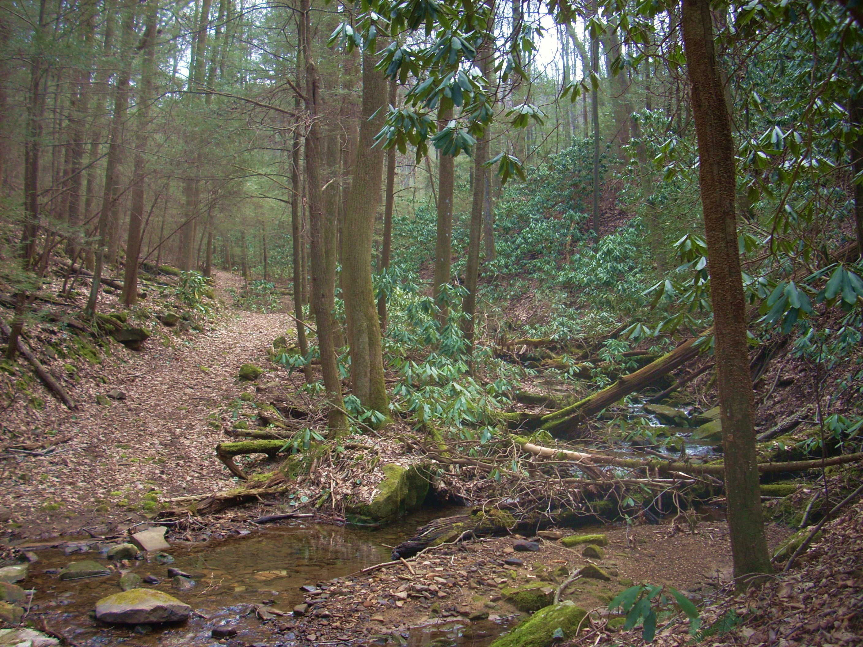 At any rate, the trail itself is pretty easy to follow from here. In fact, the whole thing is wide enough to have the feel of being an old mining or logging road. Also interesting (to me, anyway) was the game of “peek-a-boo” I was playing with Sugar Run. For one stretch it would be right beside me and then I’d seemingly turn a corner and it would be hundreds of feet below. Still other times I’d cross right over it.