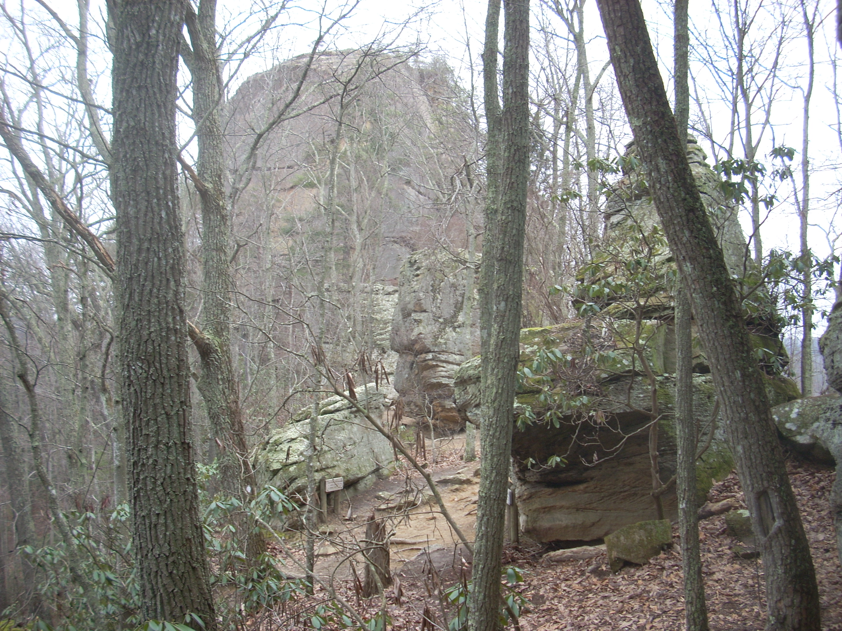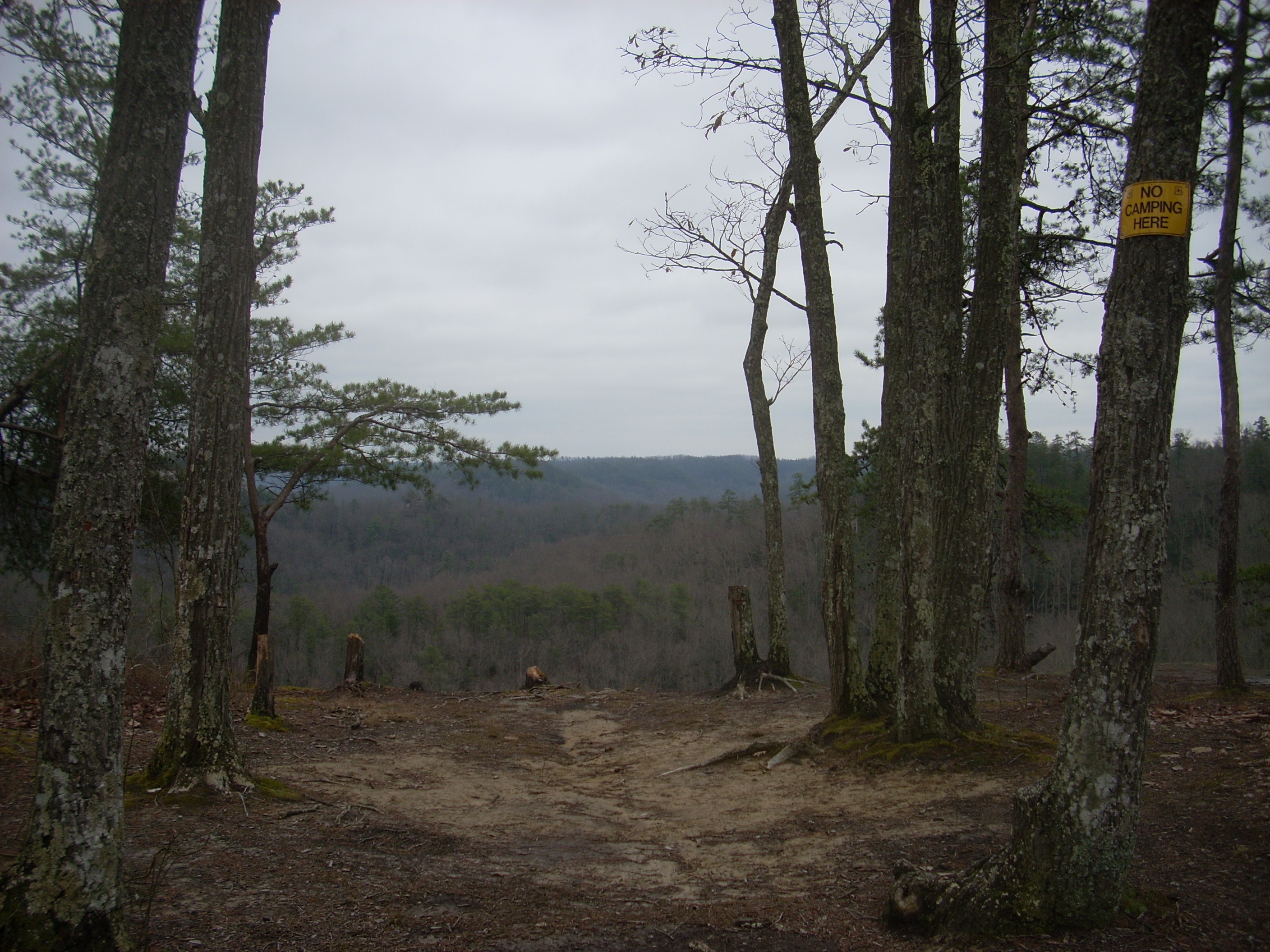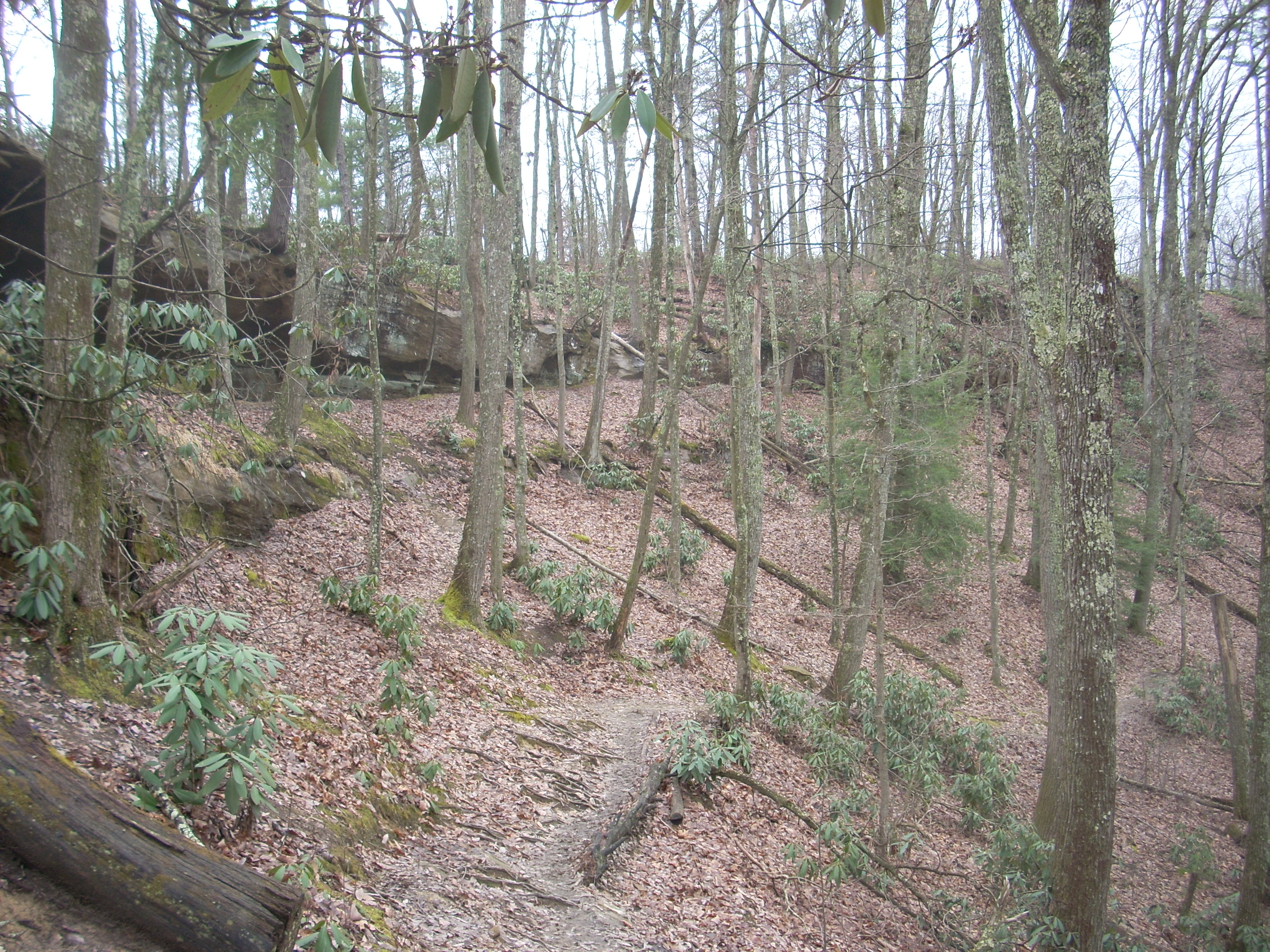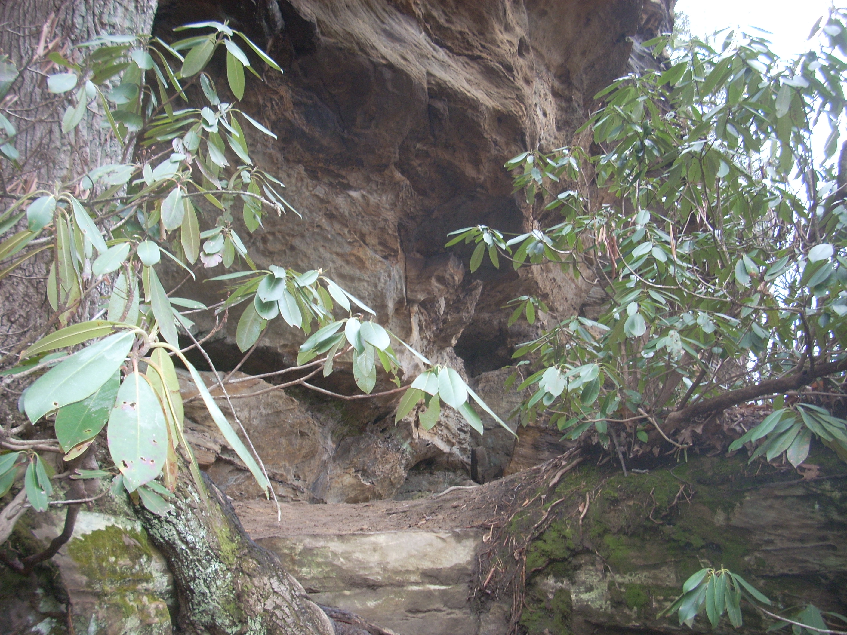 As I departed, the Auxier Trail led me down into the valley below the ridgeline I’d previously been traversing, and at one point of the descent there was a rock ledge/overhang which would have made an awesome camping spot. I got the picture below as I gazed upon this at about neck level.