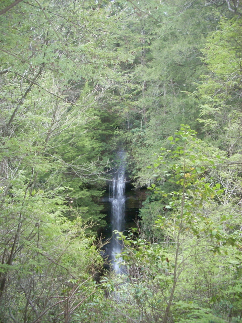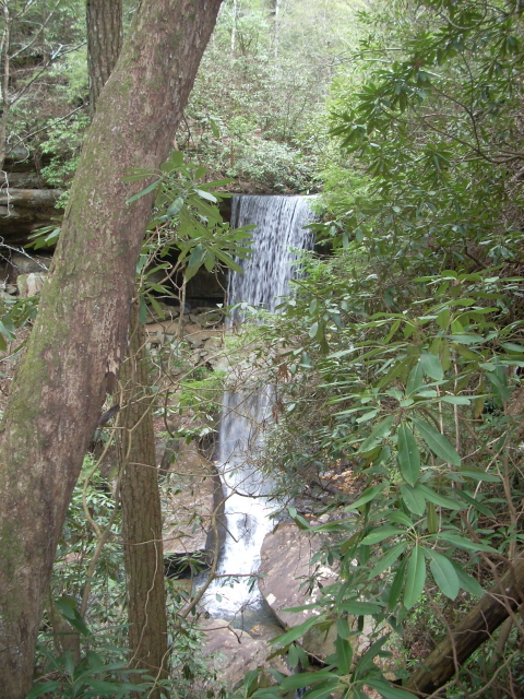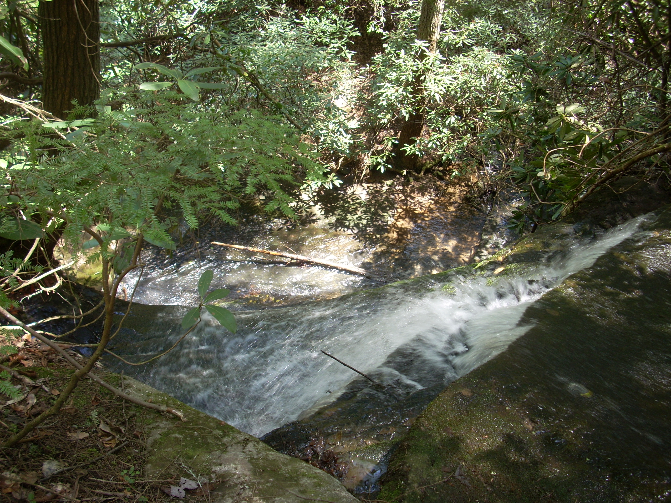 At any rate, about a mile into the hike you’ll see a couple waterfalls. The first occurs a few feet away from the path after you cross one of the tributary streams. This picture was taken looking down at it…