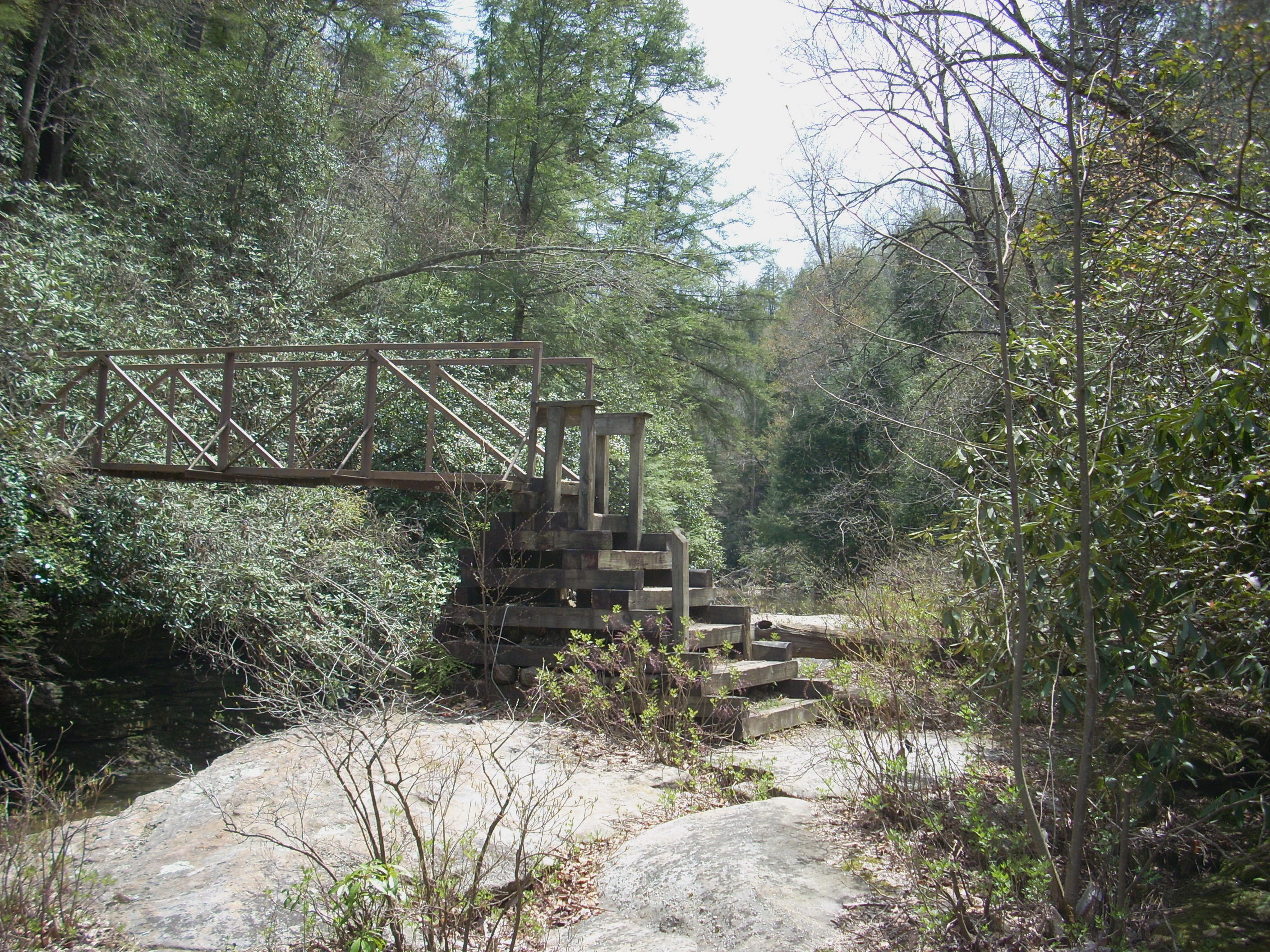 The path will presently wind you down and around this rock to emerge at the convergence of Pounder Branch and Cane Creek. At this point you’ll cross over 2 bridges in rapid succession. This is a pretty congested area in terms of water flow – and not just because of these 2 branches. Van Hook Branch must also enter very near this point (although I couldn’t tell exactly where) and the 3 of these streams will flow on to the Rockcastle River. All of this, of course, makes this a great location to stop and enjoy. It’s really fun crossing over these bridges too! The one over Cane Creek, in particular, is different in construction from other bridges I’ve seen. They put up what looks almost like a pyramid of steps on one side to give it enough of a rise to make for a level spot to put the planks across. Quite clever!
