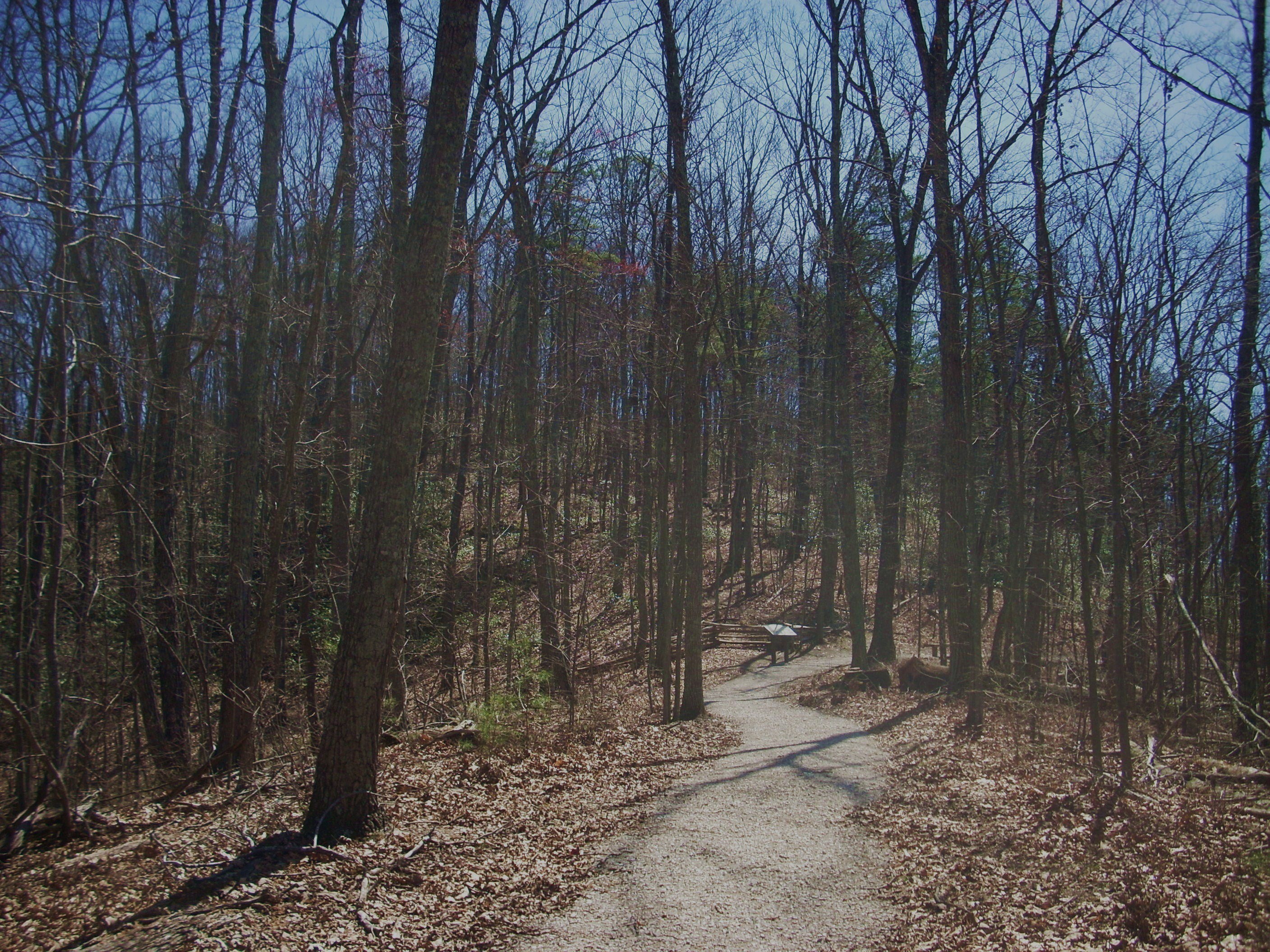 If you look to the left of the canopy you’ll spot the beginning of the longest path in the preserve, a well-maintained gravel route that will take you up to the top of Hoosier Knob where most of the fighting took place. A trail sign indicates that this path is ¾ mile long, but please keep in mind that that’s only one way. This is an out-and-back hike which will effectively double that distance. In fact, this one felt even longer than that to me. I’d go into this one with the mind-set that it’s about a 2 miler just for the benefit of budgeting your time.
