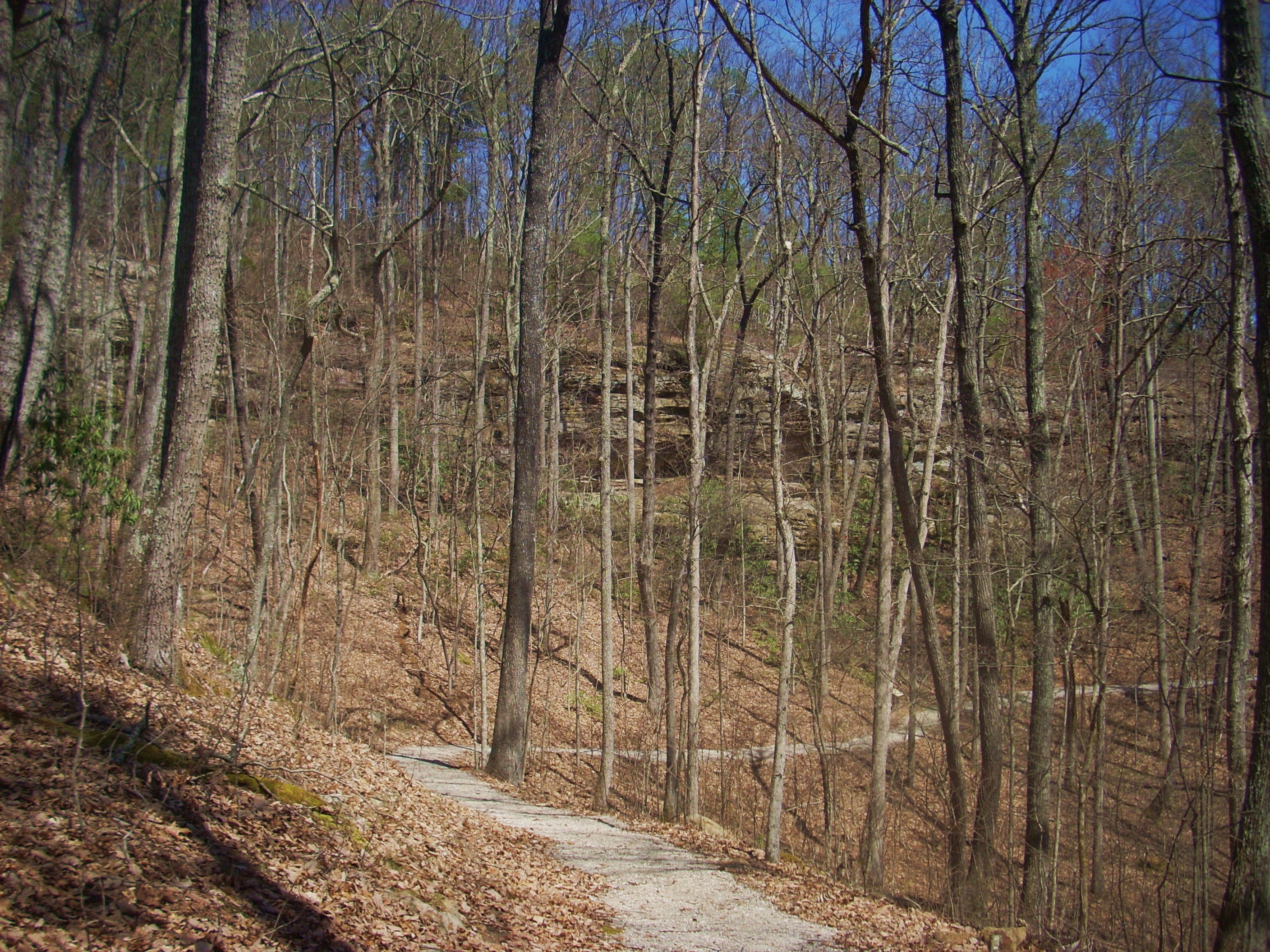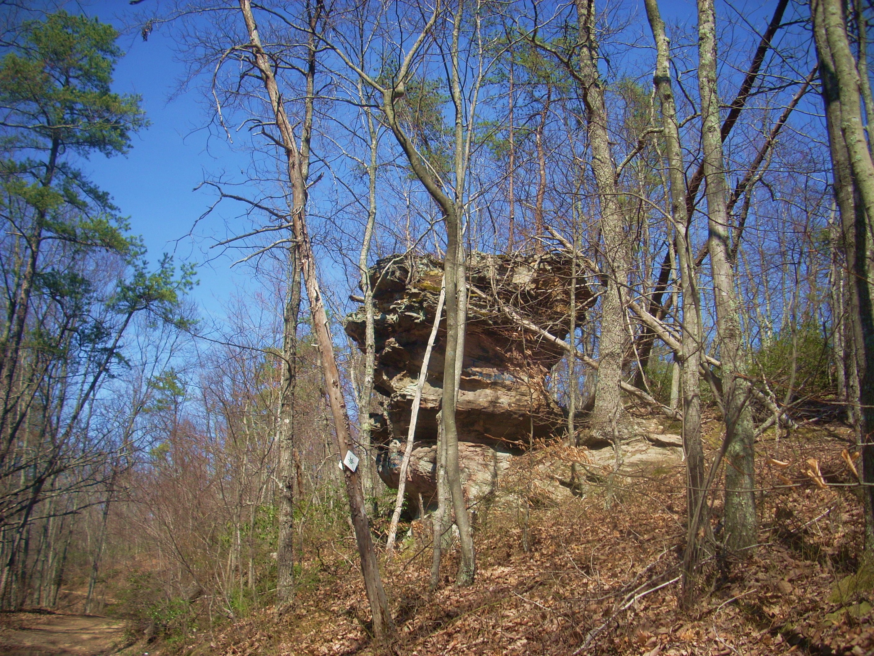 At the end of the question mark you’ll have rounded over to the eastern side of the knob which, prior to full foliage, offers a nice view of a wall of rock that you’ll arc around to your right…