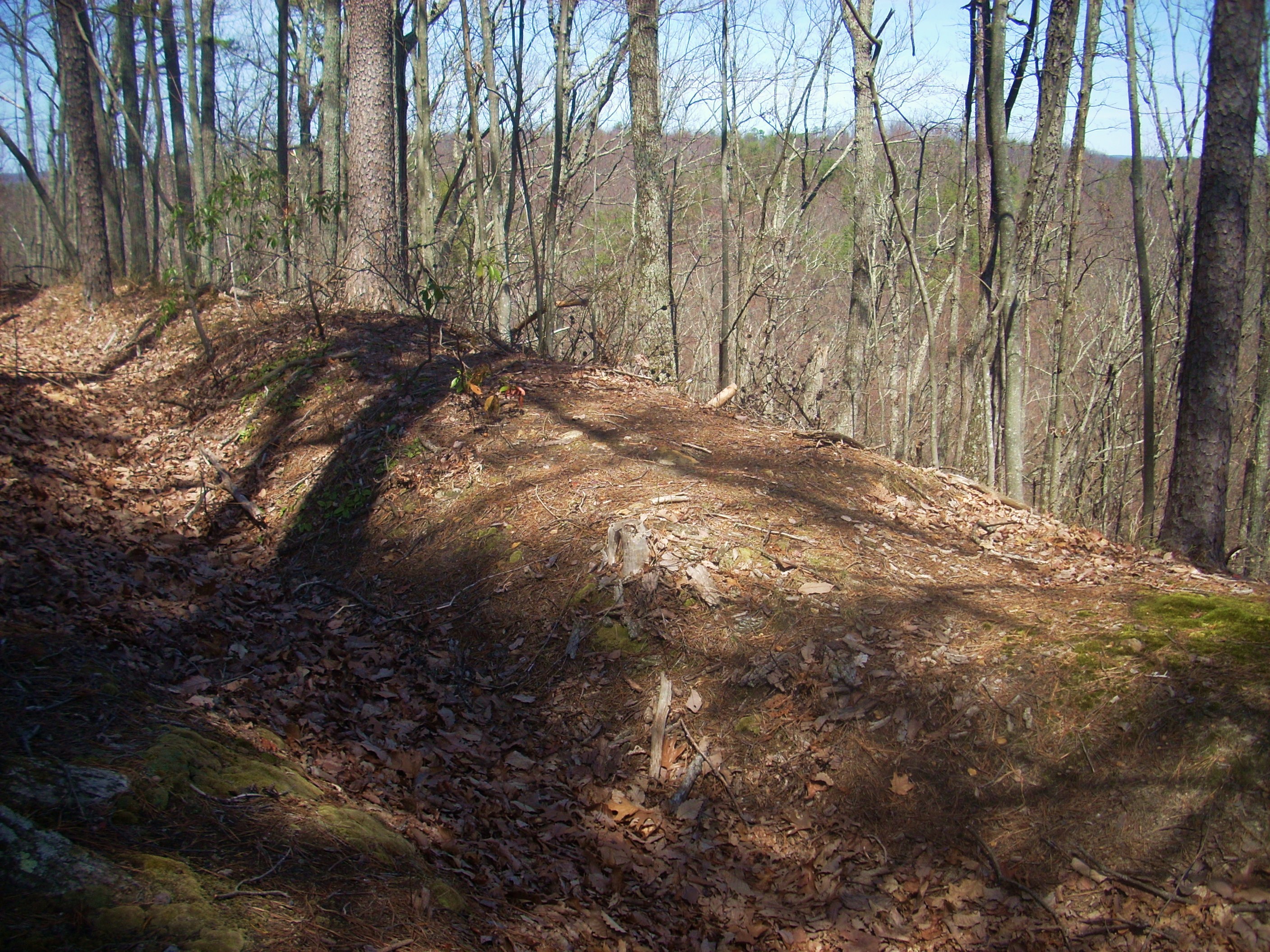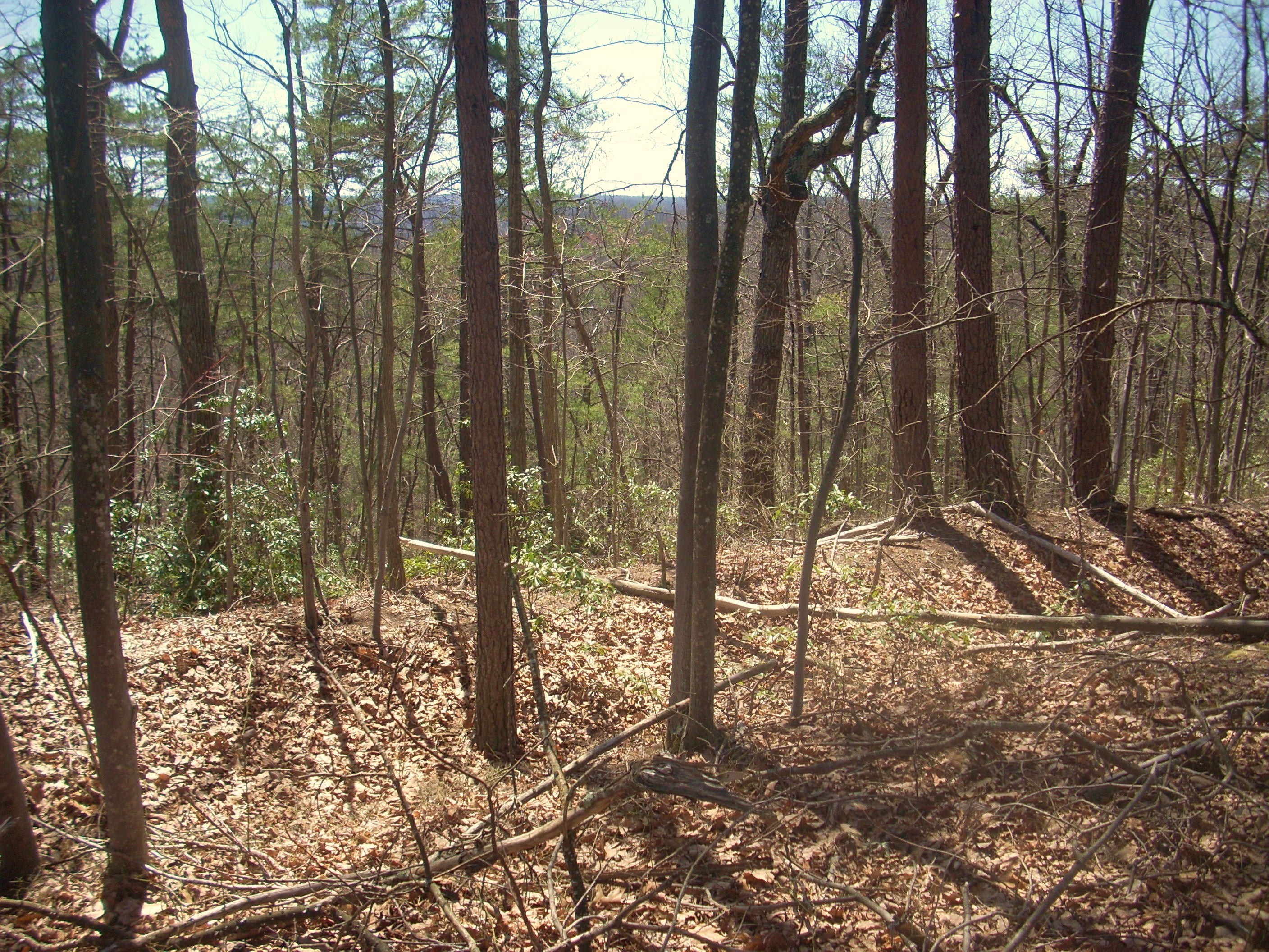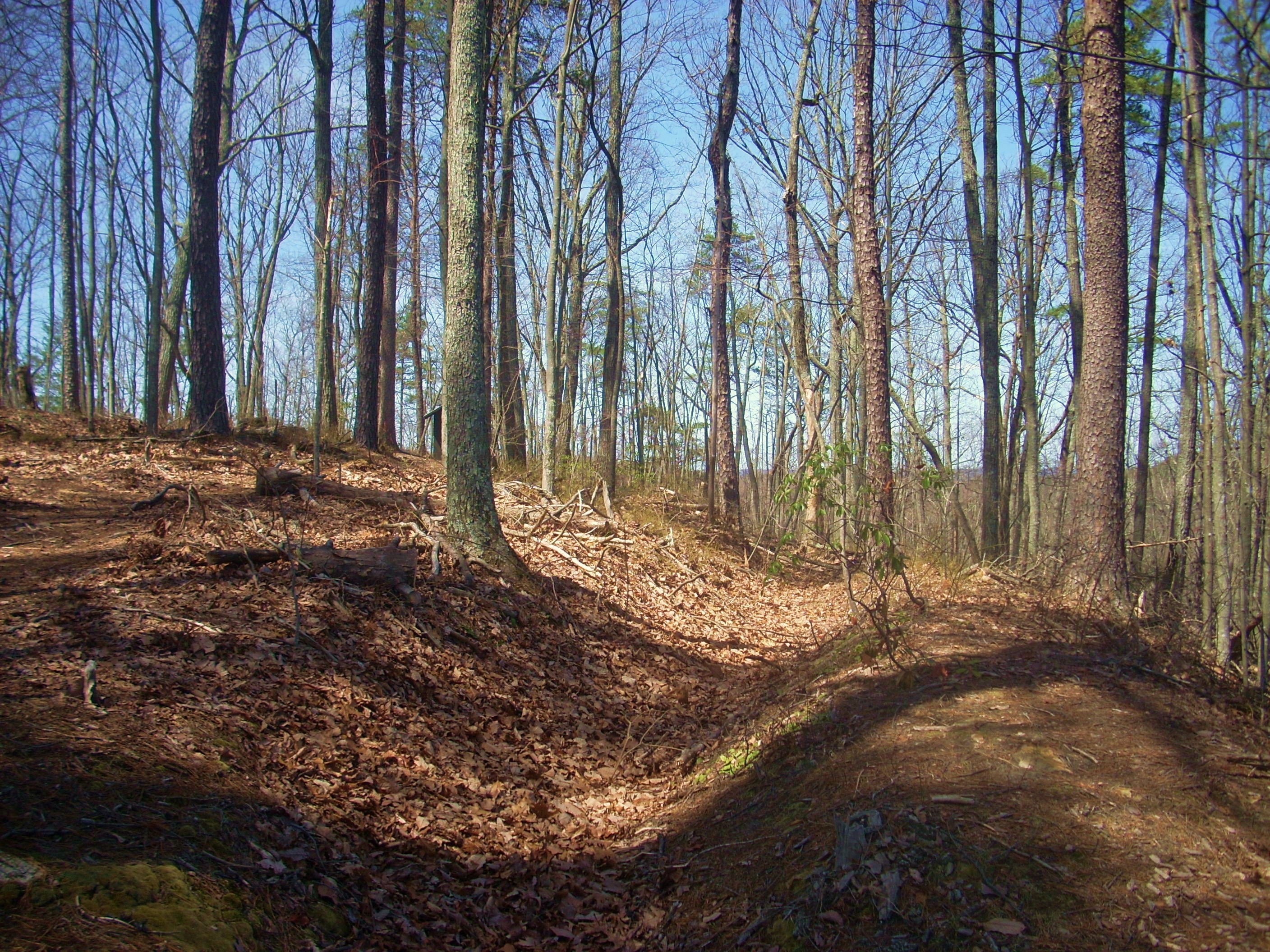 Then, in making a final left curve you’ll be on an ascent up to the top of the hill. Nice vistas will partially open up to you through the trees in here, but when you get to the battle site you’re apt to be as amazed as I was by how well preserved it is. You can actually still see the trenches they dug! Sure, they aren’t as deep as they used to be with foliage debris having filled them in over time (they were apparently dug to be near shoulder-deep with some additional height being added by logs) but they’re still clearly visible.