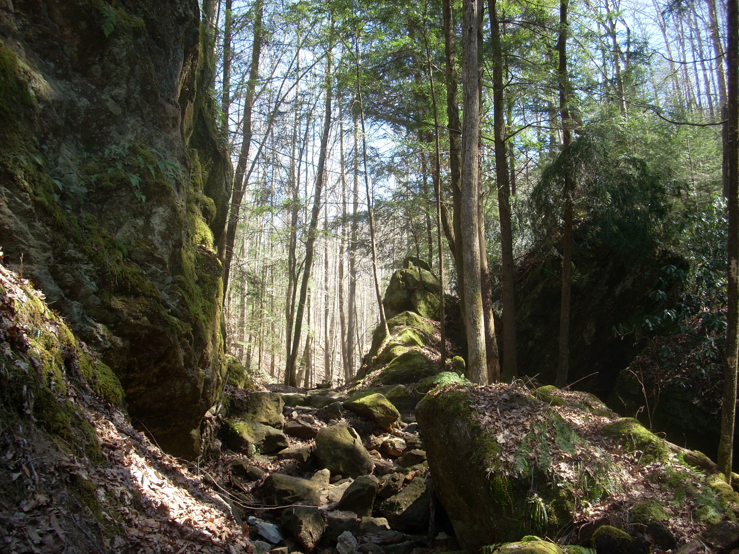 Soon I heard the most horrible noise! You’ll eventually level out for a while, you see, and as you look up along the top of the ridge you’ll spot a guard rail – KY15. The sound of an automobile seemed somewhat incongruous after all the peace and tranquility of the hike. Keep your eyes peeled in here as the path will veer off sharply to the right to begin an ascent up to the road on a series of switchbacks. Then, once you've reached the top you’ll be looking directly down Tunnel Ridge Road. This is the one that escorts you into the heart of the Red River Gorge Geological Area.