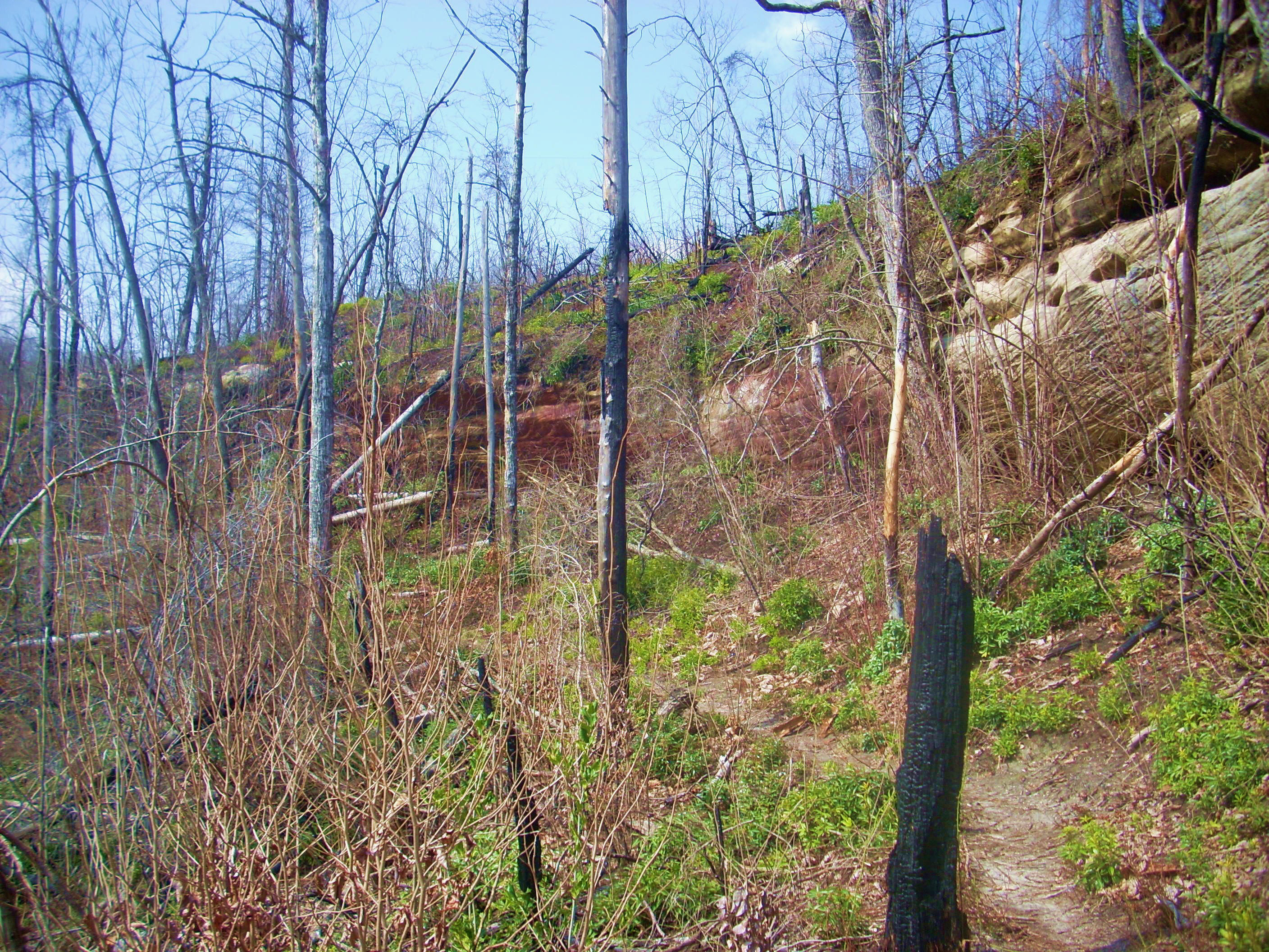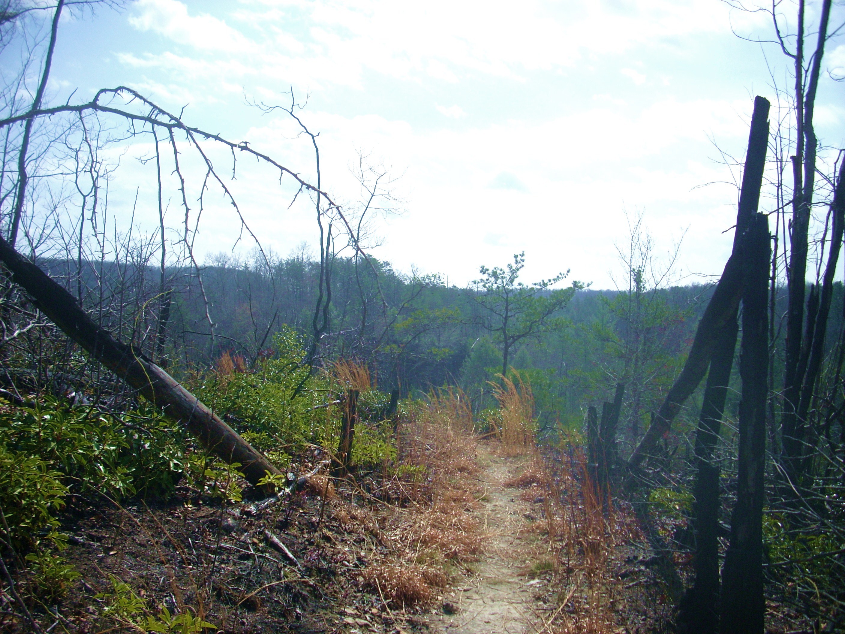 Let me also just mention here (so as not to bore the reader with constant scene-shift descriptions) that from this point to Pinnacle Overlook the scenery will again be in constant flux. You’ll always be hugging the edge of the ridgeline, but at the higher and more open points you’re again apt to get the feeling that you’re walking amongst eagles’ nests on the sandy path. These areas are also so open to the elements that many of the trees have been charred by lightning strikes (No wonder they say not to walk along a ridge top in a thunderstorm!).
