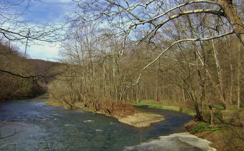As you start there will be a couple paths that will merge with you from the right. Don’t worry about them – they simply come in from other campground locations above. Keep heading straight as you enjoy the sights and sounds of the river and its little riffles. As I walked in here I found that the trail bore some resemblance to a section of the Sheltowee Trace north of Cumberland Falls (the Dog Slaughter Falls section). Later, the Dogwood Trail would remind me of the Blue Bend Loop, the section south of Cumberland Falls.
