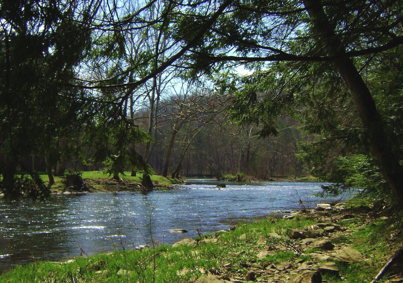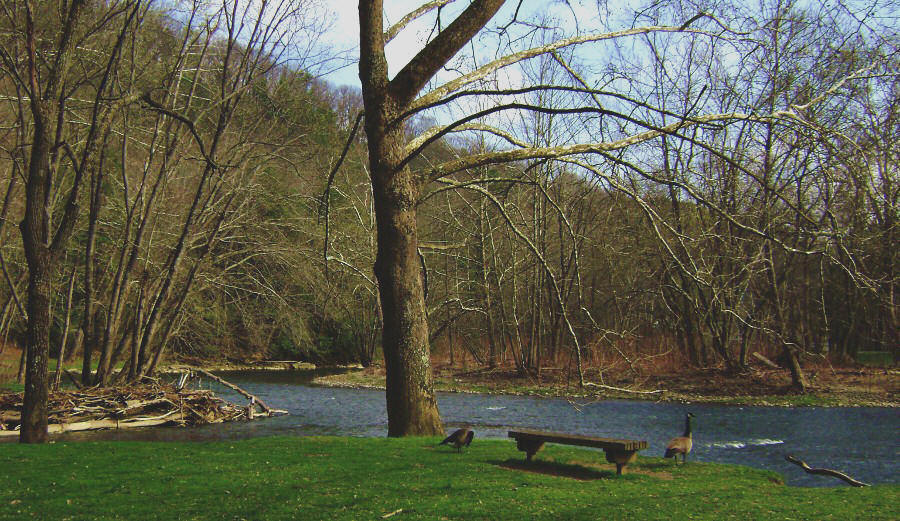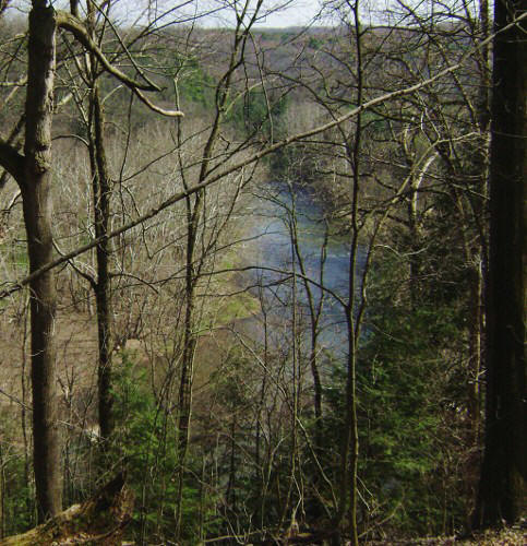 After quite a while I crossed back over the bridge to start the Dogwood Loop Trail. This one actually begins from the end of a campground lane which can be accessed on the very north side of the bridge. You’ll head east along the lane to wind up at a little circle in the back. Along the way you’ll get some more beautiful river views. In fact, in the Spring you’re likely to see large patches of purple/blue flowers (violets?) in the grass. These reminded me of the bluebonnets I’d seen in Texas.