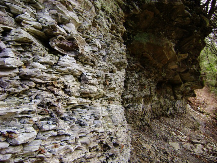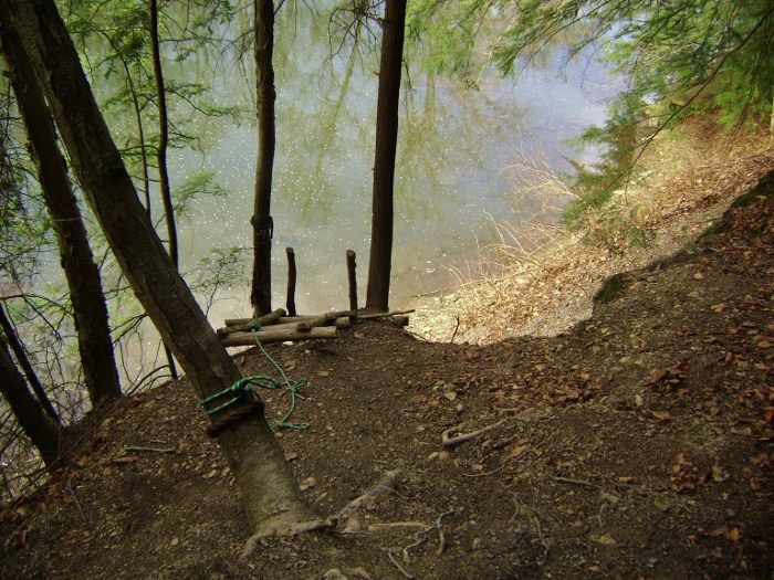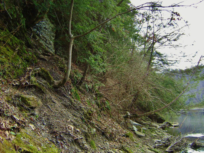 After this you’ll pass along an outstanding section of crumbling rock wall before you arrive down at the waters’ edge. Kindly note that the second picture below contains a scene you might want to remember on your return trip, lest you have the trail taper out on you like I did. When this image meets your eyes you’ll want to climb back up to the rock wall over the “U” shaped bottom of that tree just to the left of center in the picture…