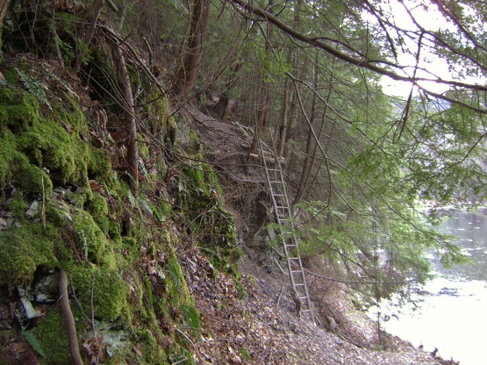 You’ll head upward again along what is surely an old road to follow above the river, which is now down on your right. In this section – at least on the ascent - I did find that I was following some blue markers. You’ll want to keep a keen eye out for them too because there are some sharp turns here. Later, once the path descends, you'll arrive back alongside the stream at a point which will seem familiar. Go left to retrace the steps you’ve already made back to your car – but watch out for that one point so that you don’t miss the ladder!