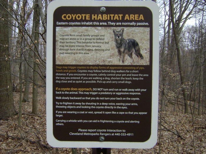 Meanwhile, there was a coyote sign along the road which was interesting. Apparently they’ve been spotted out here but they’re generally passive. The sign indicates that if one does approach the best thing to do is to walk away slowly while keeping the gaze of the animal. Then, if you keep yourself looking as large as possible it’s also supposed to help. Here’s the sign…
