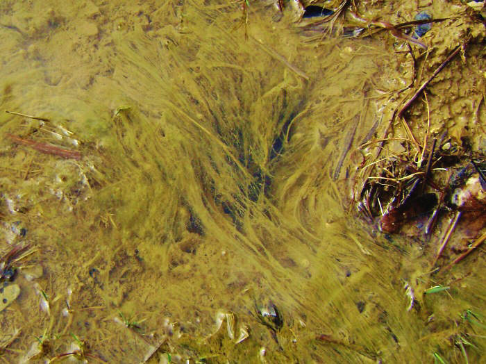 …and upon emerging you’ll be near the Meadows Picnic Area. You’ll probably want to be careful in here as the Bridle Path will cut off at a couple points - first to the left and then to the right. I’d continue to follow the brown leaf markings for the Deer Lick Cave Loop, but today when given a choice I thought that the second Bridle Trail turnoff looked more interesting. It led in an arc around a little field instead of going right through the picnic area, but in exploring this I only wound up doing was getting my feet even soggier. :) There were some interesting algae in this field, however…