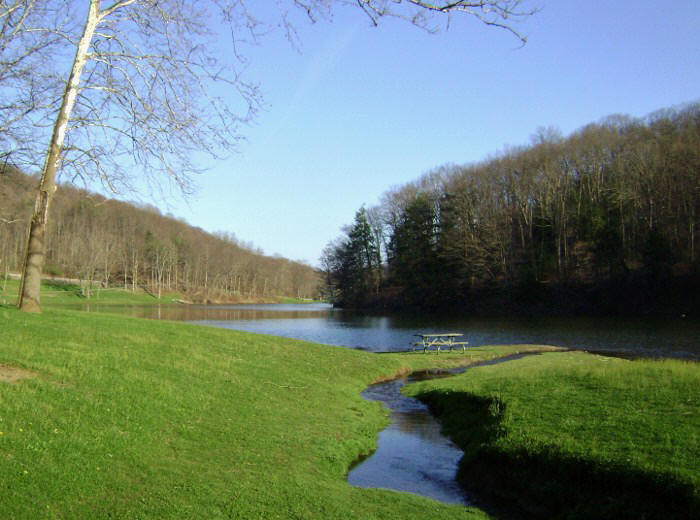 As it was, I’d soon to meet up with them at a point where a picnic table lies in the midst of a pleasant clearing (this is the same point at which the Lakeside Loop curves to the right to cross over the stream while the Trillium Trail heads left and uphill). I paused here to meet a very pleasant woman and her dogs…