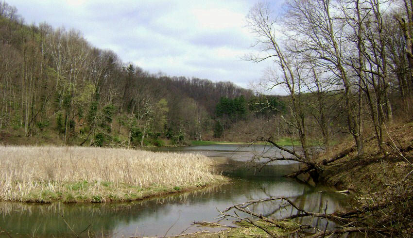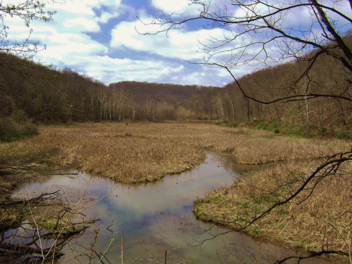 Presently you’ll pass a park picnic shelter which looks old enough to have been built by the Civilian Conservation Corp (CCC). Later you’ll be overlooking a marshy area with great views back toward the headwaters (origin waters) of the stream.