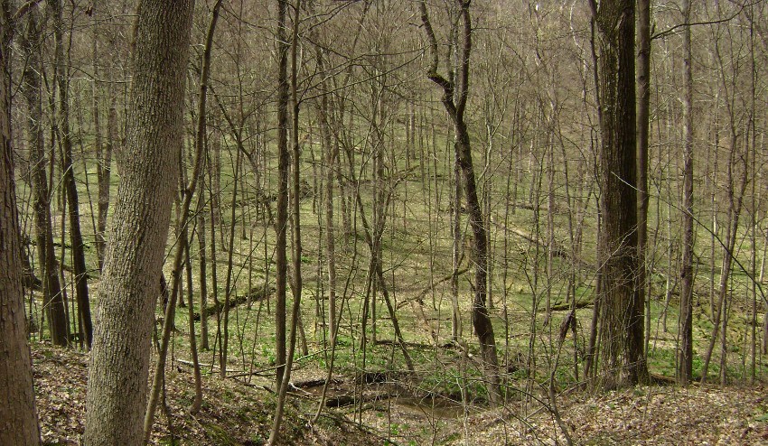 As I bid this kind woman farewell I headed uphill on the yellow-blazed Trillium Trail. There are some horse paths that come in here too, so it can be a bit confusing. As with most of the Ohio parks that I’ve visited, the horse trails out here aren’t always on the map although it does appear as if they’re marked in orange. At any rate, I kept to the right at each intersection and was OK. In this section you’ll be following an unnamed (as far as I can tell) tributary of the Town Fork of the Yellow River upstream and you'll have some nice views down into the ravine here…