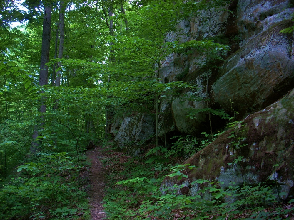 Note in the photo above that you'll soon be curving to the right and away from the river. You're heading into the "back country" as I call it, not to return to the river until the end of the hike. What's interesting from here is that there seem to be a variety of forest settings. I wish I was more familiar with the different varieties of trees, but the forest does seem to shift at various occasions from here on out. You'll see some caves and rock outcroppings too, like the ones below....