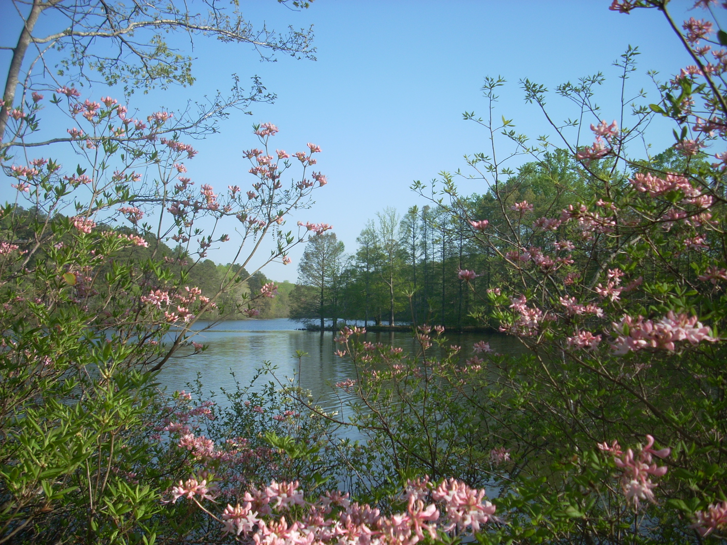 Soon crossing this little stream and reaching the back of the lake, I began to catch glimpses of the bridges I'd crossed and it was at about the ½ way point around the lake that I came to a levee. I took a right to cross over it along a dirt/gravel road, and from there the trail left the road and led back down to the lakeshore. Here was where I got what I thought were the best pictures of the lake in the midst of a great looking camping spot, a fine fishing location, and a patch of flowering trees.