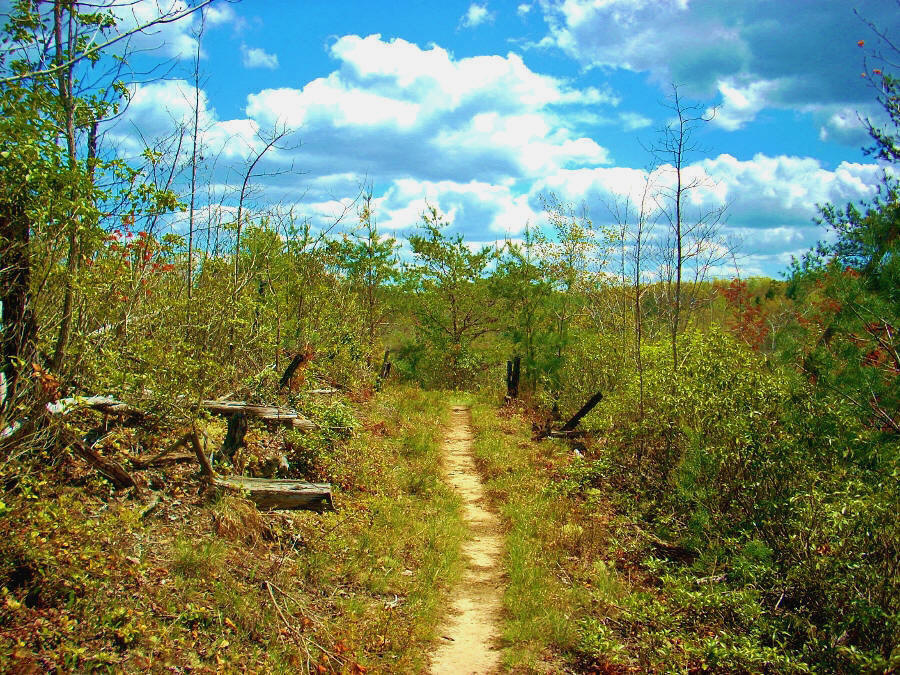 Let me also just mention here (so as not to bore the reader with constant scene-shift descriptions) that from this point to Pinnacle Overlook the scenery will again be in constant flux. You’ll always be hugging the edge of the ridgeline, but at the higher and more open points you’re apt to get the feeling that you’re walking among the nests of eagles on the sandy path. This area (several photos below) is also so open to the elements that many of the trees have been charred by lightning strikes. No wonder they say not to walk along a ridge top in a thunderstorm!