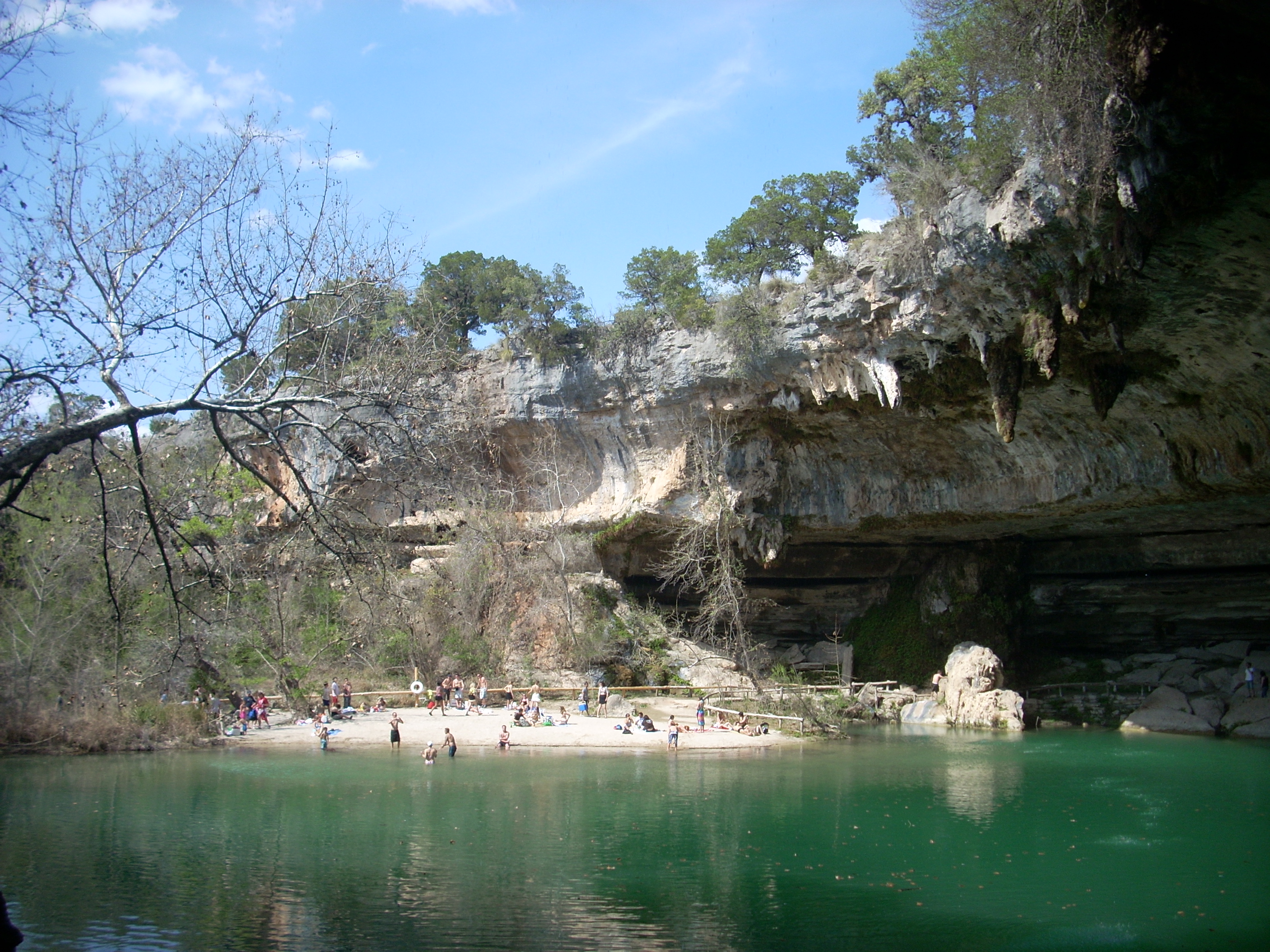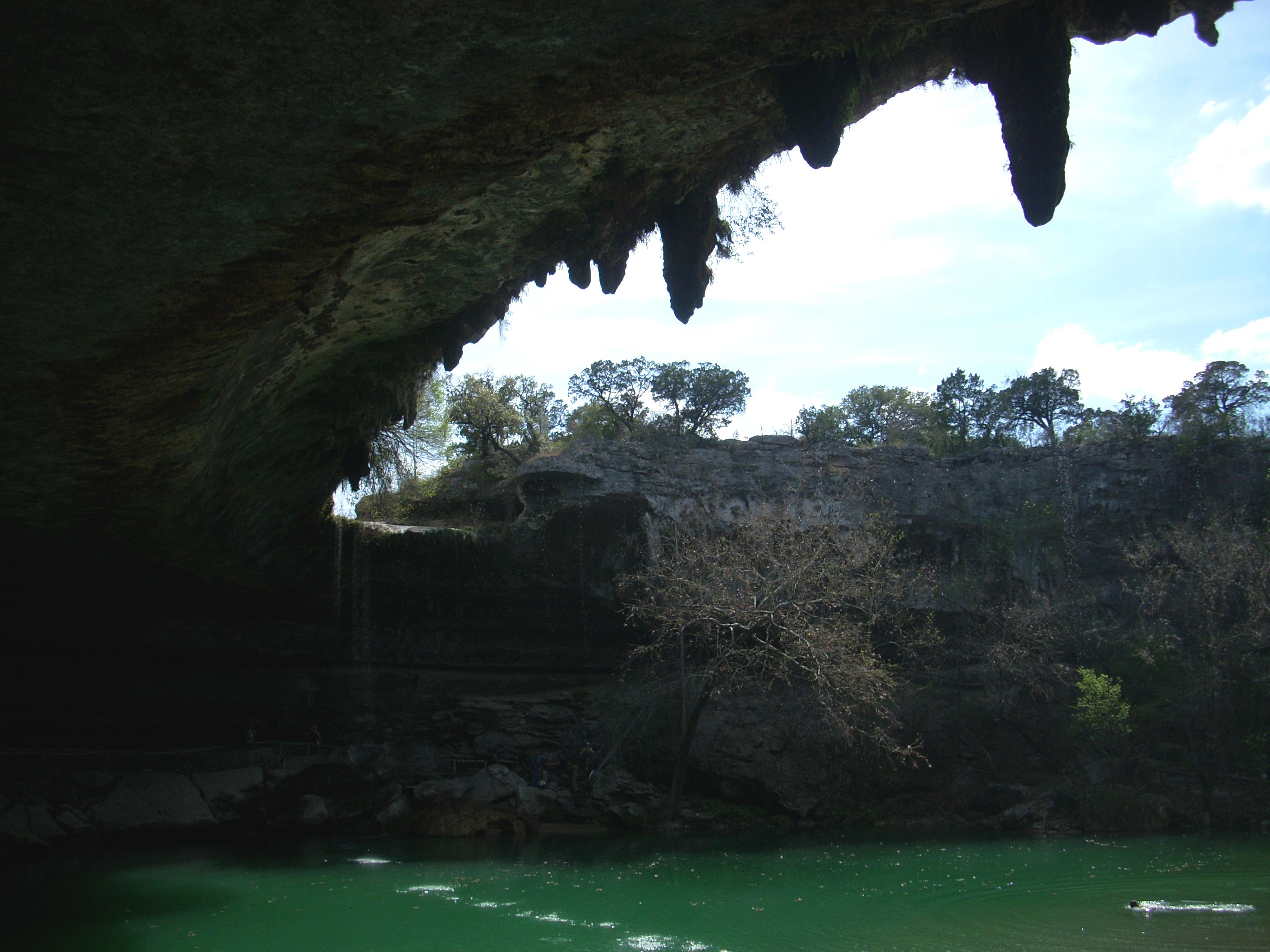 By this point you’ll have heard all the people at the pool and you’ll soon catch glimpses of the rock overhang (which often has a waterfall going over it) and the turquoise water that are hallmarks of Hamilton Pool. The first full view I had was breathtaking for me, and when we finally got there I dipped my cap in the turquoise water to cool off a bit. You can walk all the way around and under the rock overhang too. In fact, when the water is flowing you’ll be walking directly behind a waterfall! The place is absolutely amazing!