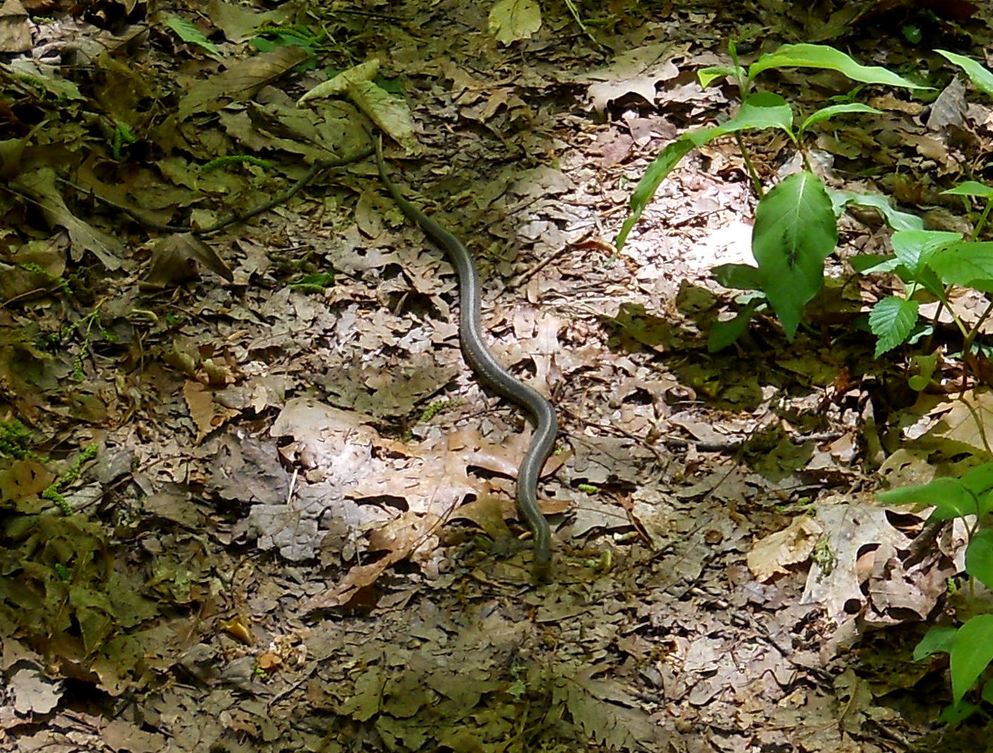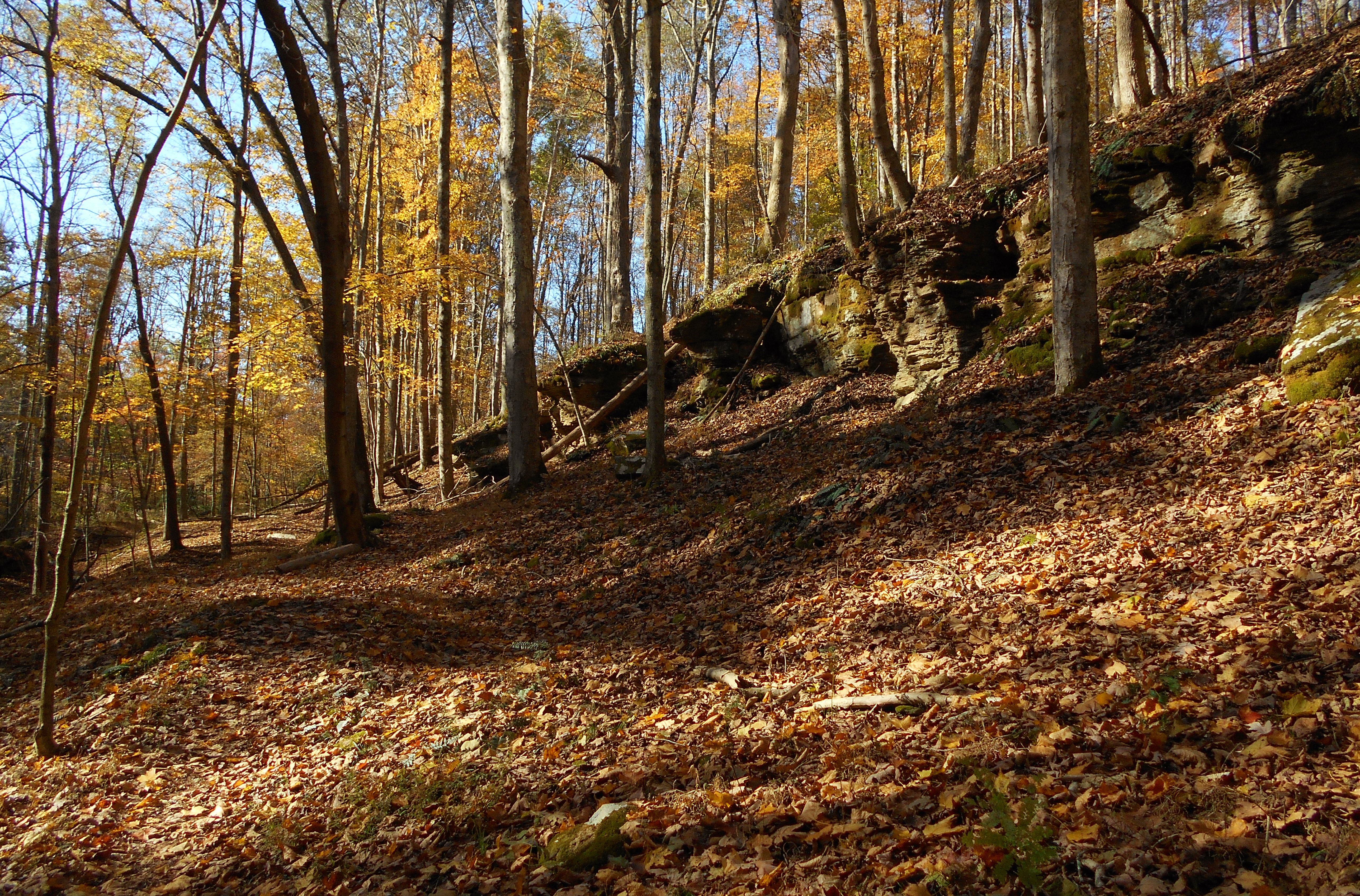 The first trail intersection is one at which you'll want to take a right. If you go straight you'll meet up with the park road where you can hook up with the Tecumseh and Medicine Man trails across the lake. I've described these in a photo-journal of the Western side of the park if interested. At the second intersection (which you'll reach after winding back into a stream and out again) you can go right to complete the Copperhead loop and return to your car or you can continue on a path called Trip to the Moon. The first option will give you a hike of a little over a mile while the second will begin you on the second leg of this trip on a 2.1 mile path.