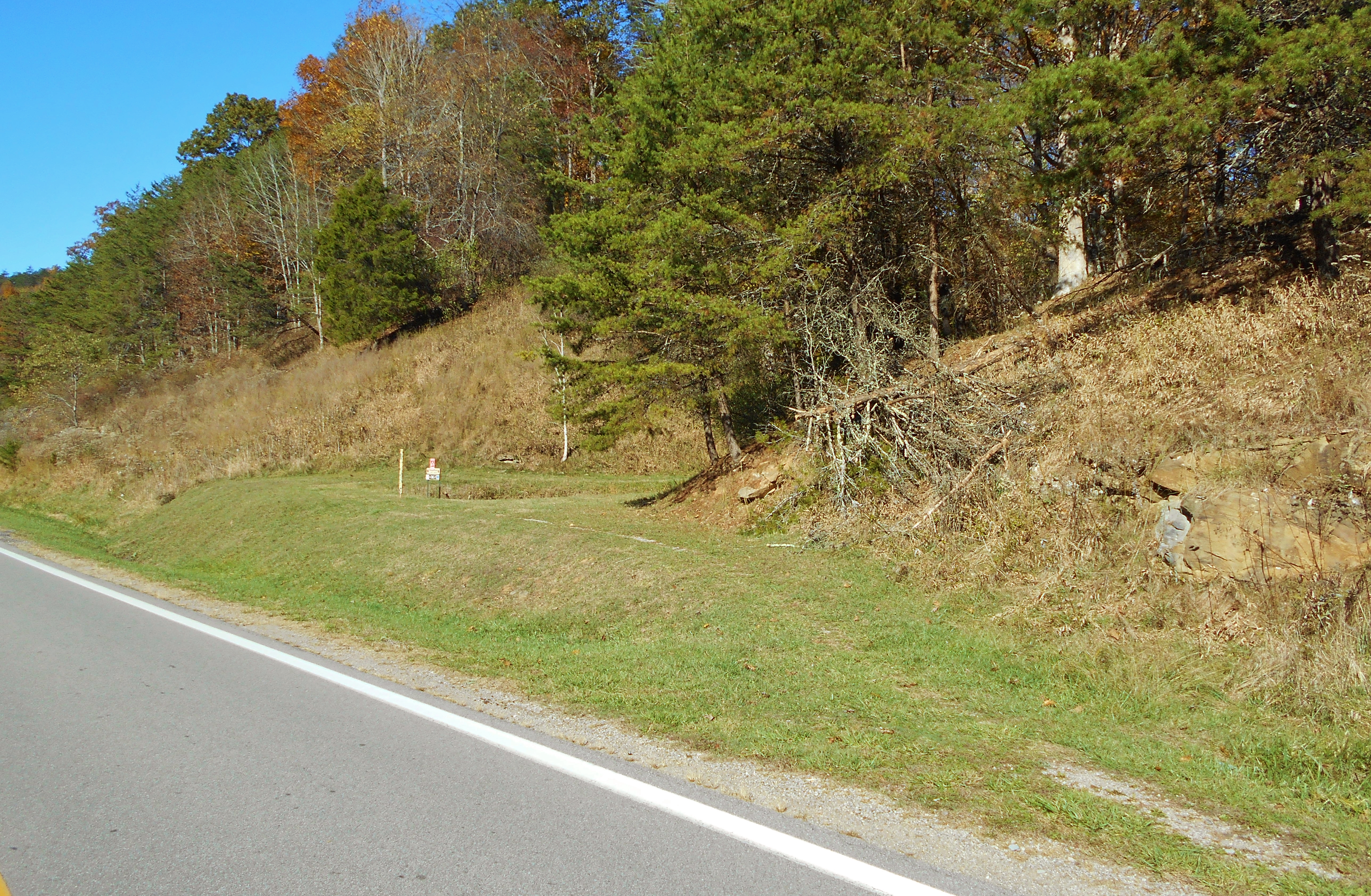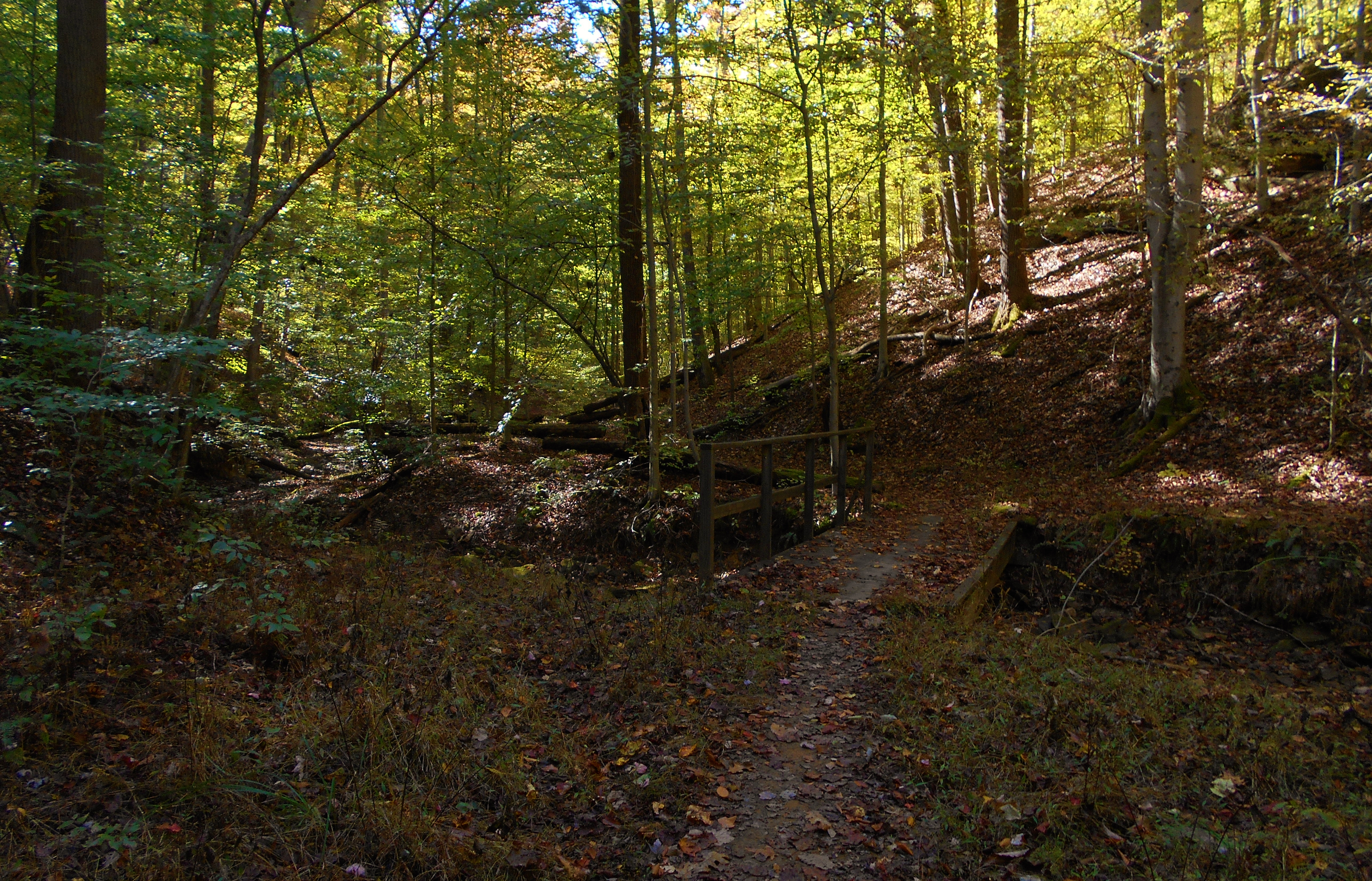 Shortly you'll come to a trail called Quick Out and you'll take this for a final ridgeline tour before arriving at the park road. You can turn right to go back to your car once you reach the road, either following alongside it or along the stream (the aforementioned Mudlick Run). I generally opt for the latter. I don't trust anyone with a steering wheel. Besides, it's nicer along the stream. There are some more pretty bridges crossing it and it makes for a nice stroll in and of itself. You'll also pass right by the park office. Note that the photo below was taken looking back in the direction I'd gone. You want to head in the other direction to get to your car.