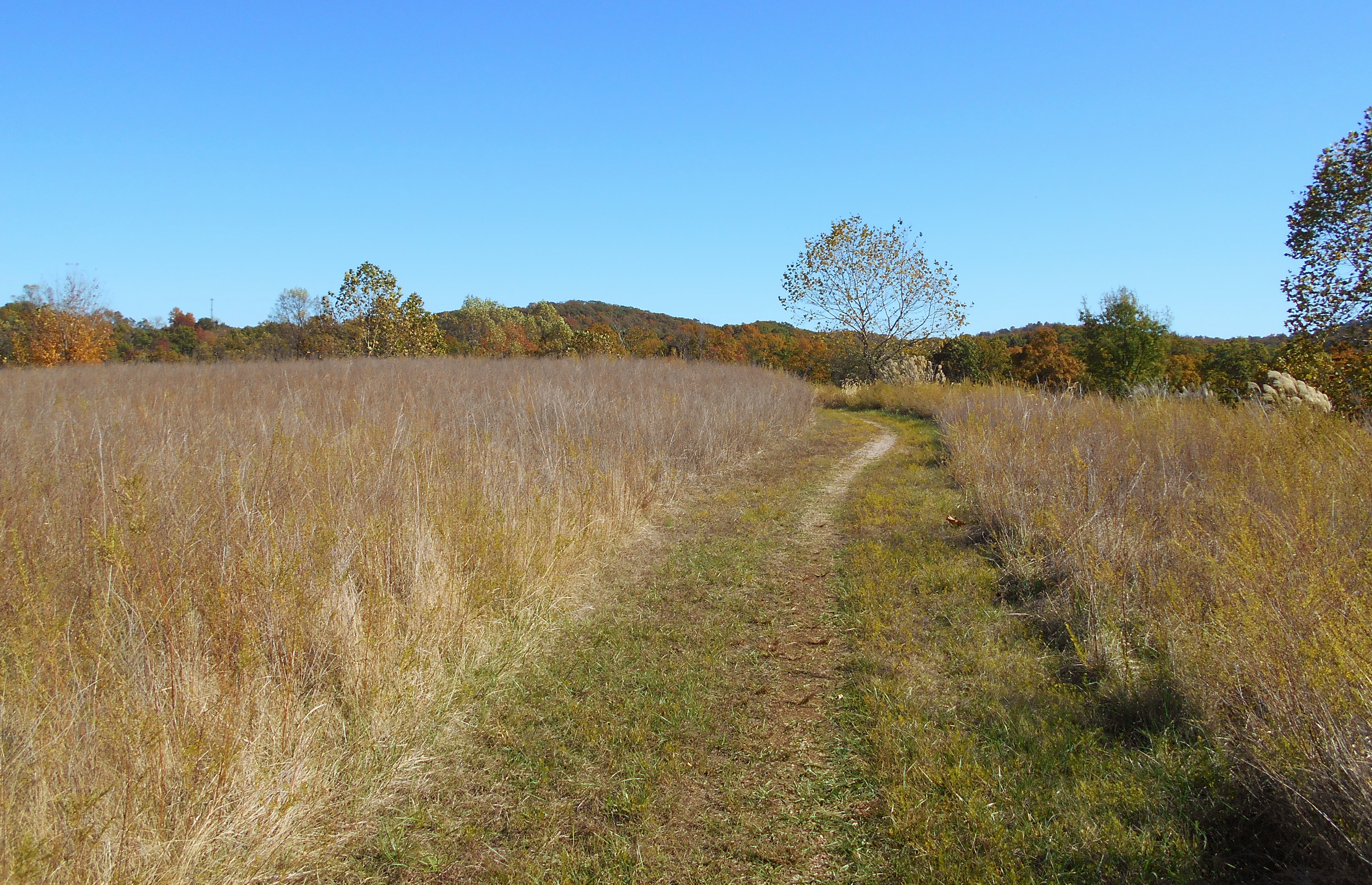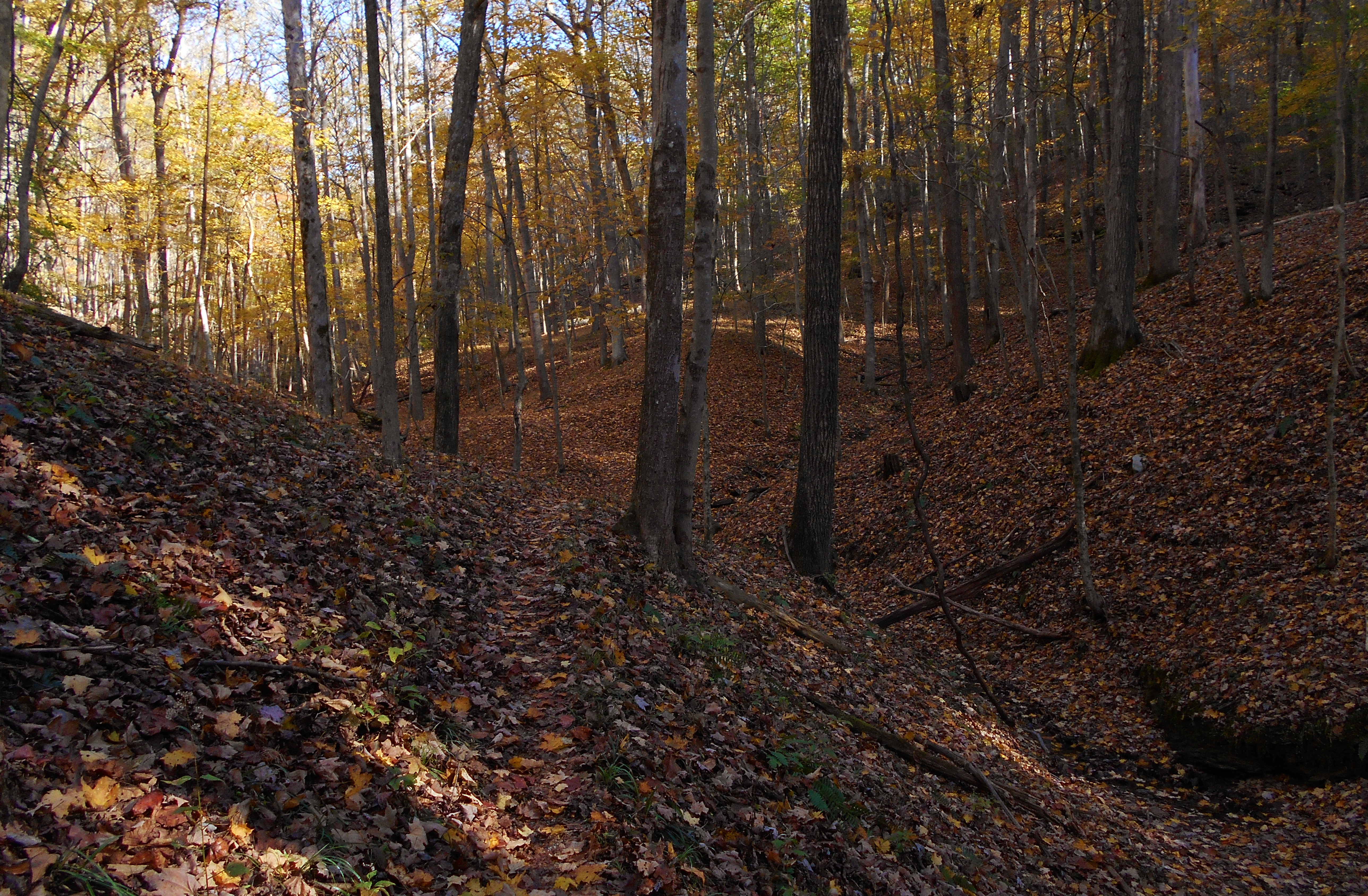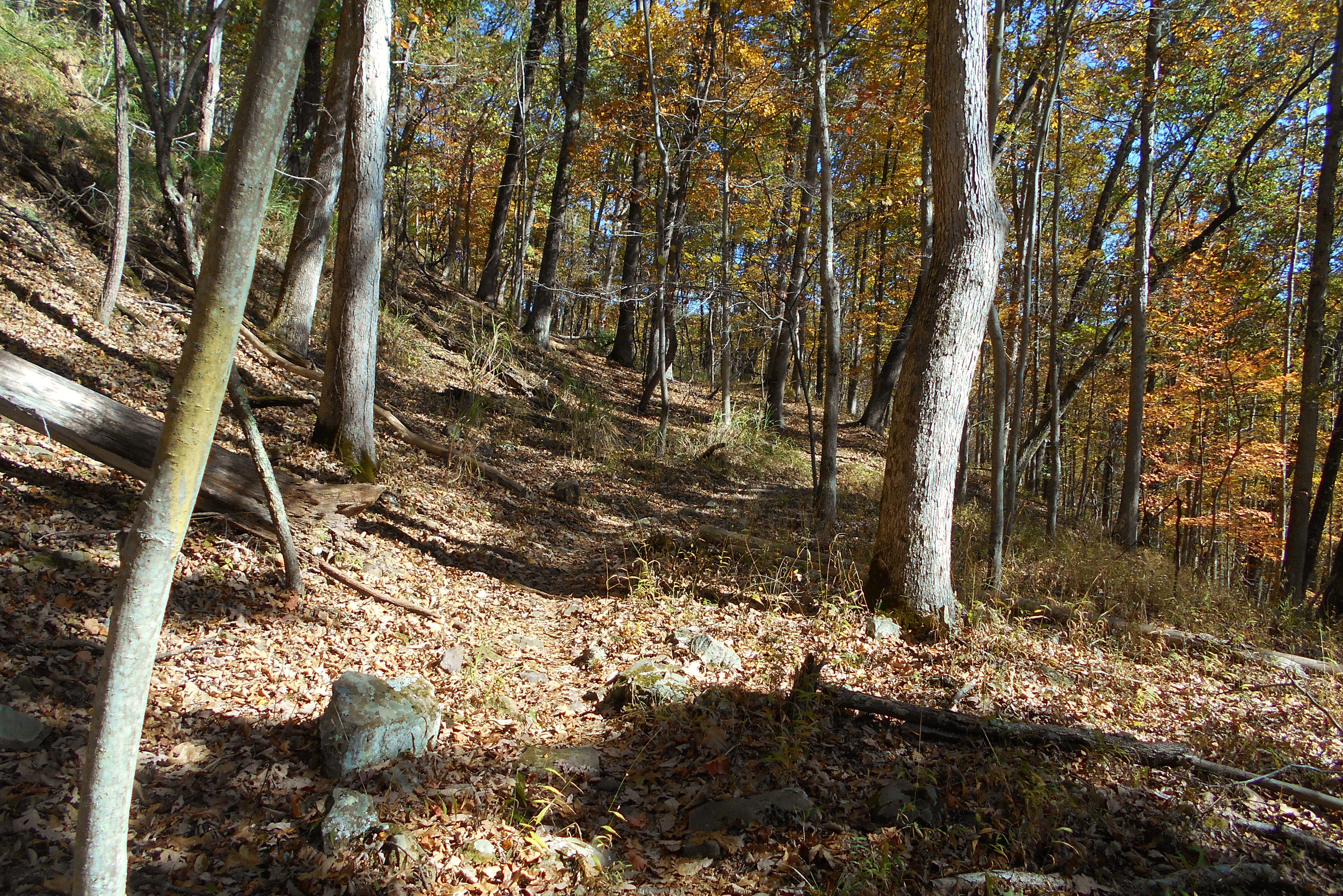 Today I parked where the boat docks and boat ramp are. You'll see them alongside the lake on your right after you make the second right turn into a fairly large parking lot. Then, if you're looking out upon the lake from the boat ramp, you'll see the Copperhead Trail on your right at about 2 to 3 o'clock on the dial. Carefully walk across the road to begin the trail which angles up to the right. It'll look like this (beautiful in either Fall or Spring)...