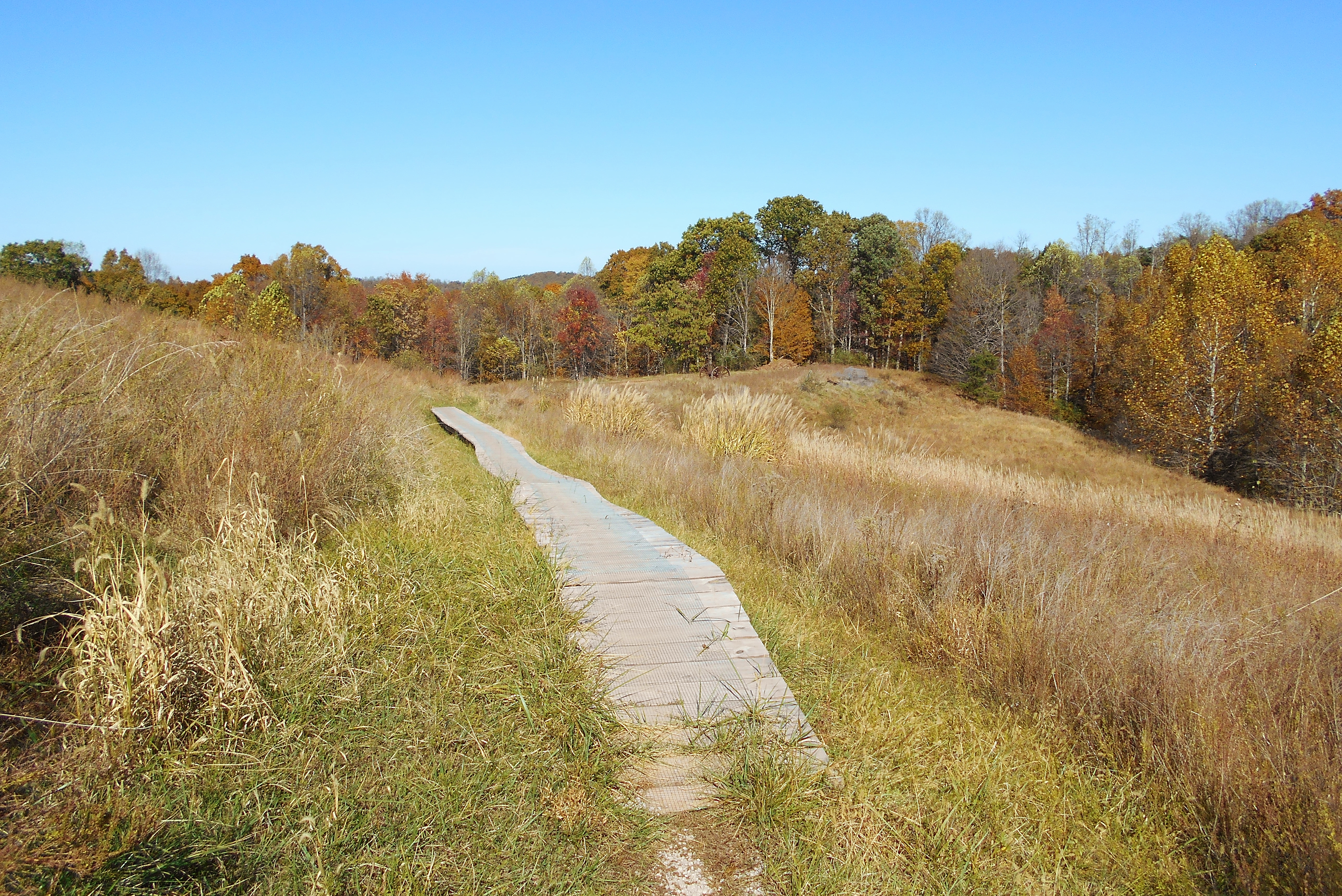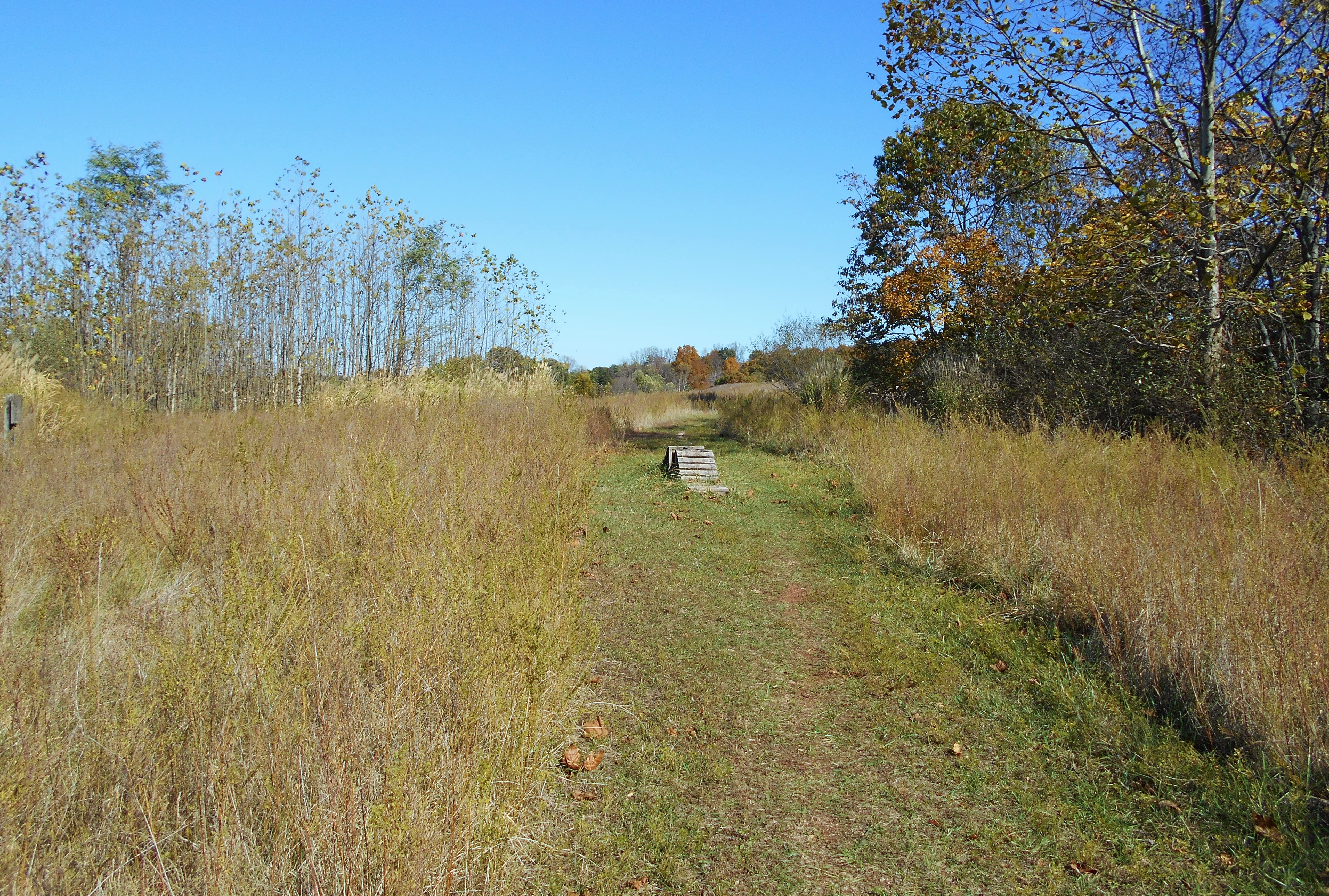 Savannah begins with a fairly steep climb along some switchbacks as you begin flirting with the top of a hill. You'll soon spot some grassy areas up and to your right as you gradually ascend higher and higher toward them along a long right curve. What you'll eventually meet up with is the cleared out, grassy area you see below. That little wooden bridge ahead of you in the first photo is for the bikes, believe it or not. Mountwood is an extremely popular park for mountain biking.