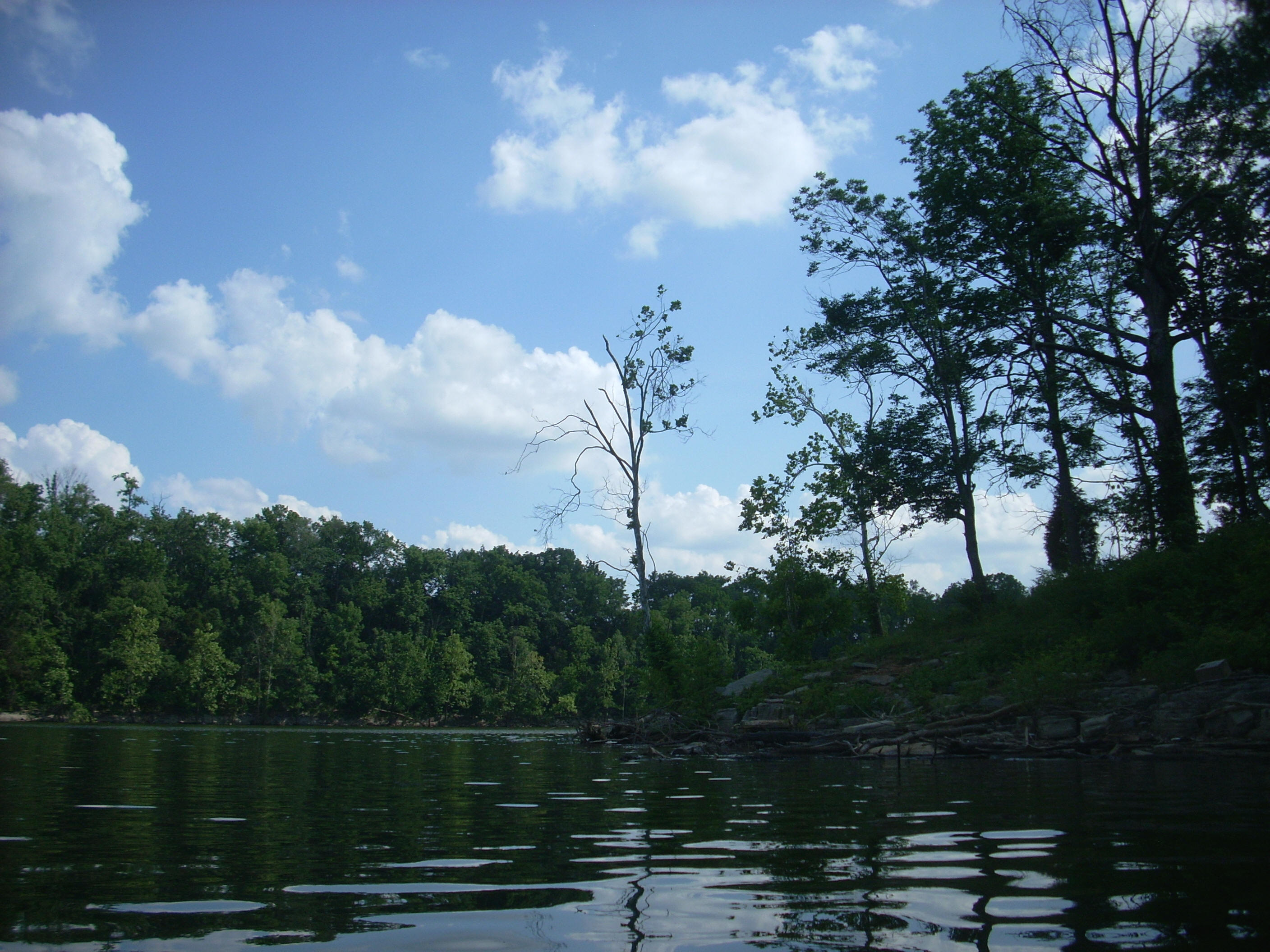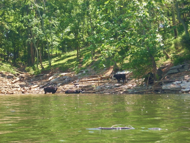 Upon passing this cove, you’ll enter into a long, fairly straight section of the lake where you’ll progress from one “M” to the next, essentially entering into the second half of the trip. This half is a little longer and you’ll paddle in the opposite direction as it pertains to the letter itself, following it from right to left instead of left to right. The left bank is almost all farmland from this point, and in one spot I noticed a few cows, one of which looked like it was doing some rock climbing and one of which was staring at me face deep in the water. What posers!