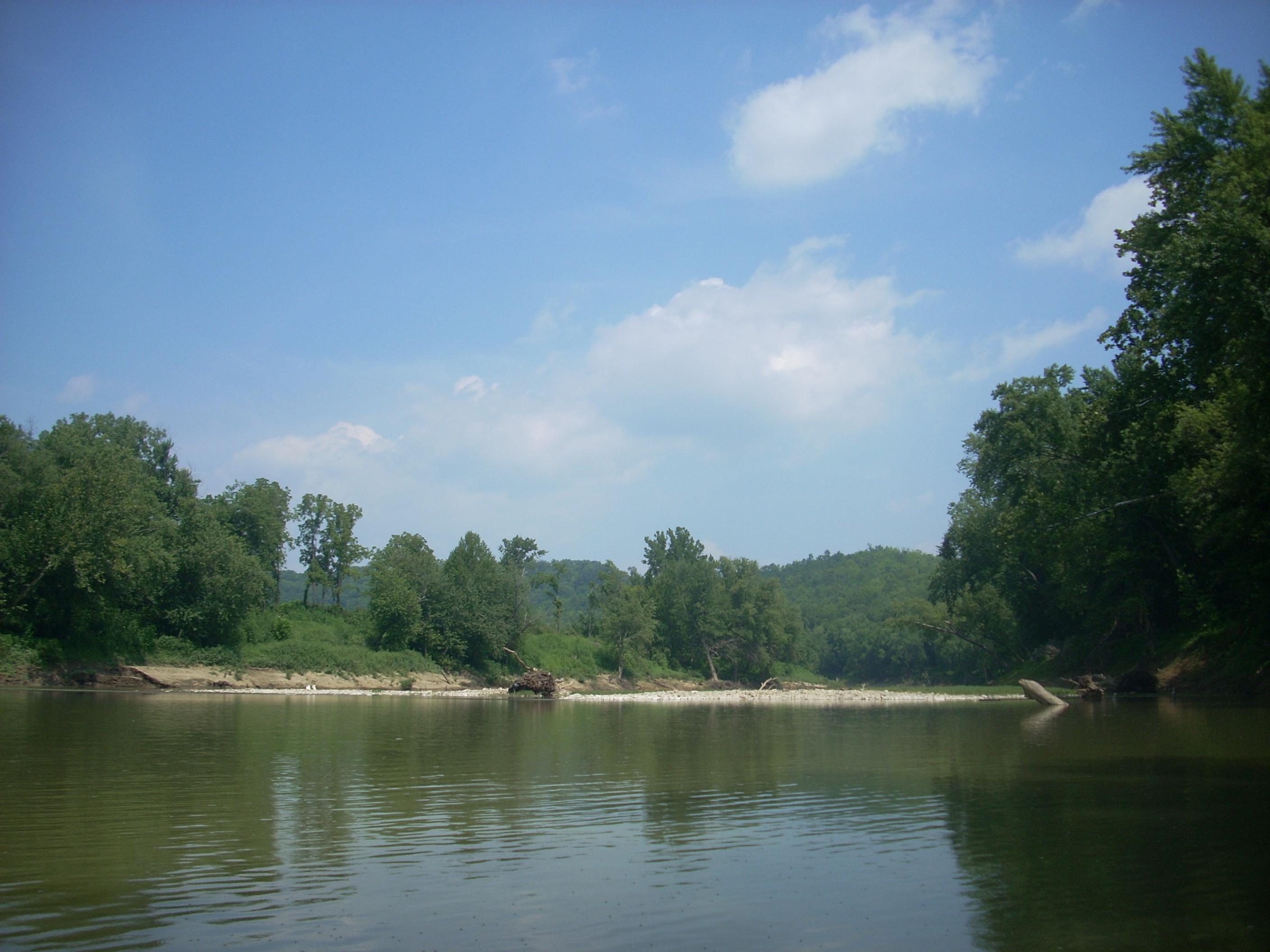 This area of the river was predominantly farmland on both sides, and at the end of the “C” was the first instance of moving water I’d have today. Looking at a map, this was at a point where 2 streams came in from either side to form a large shoal in the middle of the river. On my return paddle I met with an awesome sight here. There were about 4 guys hanging out in lounge chairs over a barbeque grill. What a great idea! This was the second of a couple things I’d seen in consecutive weeks that I wish I could have joined in on – this and the cliff jumpers at Laurel River Lake.