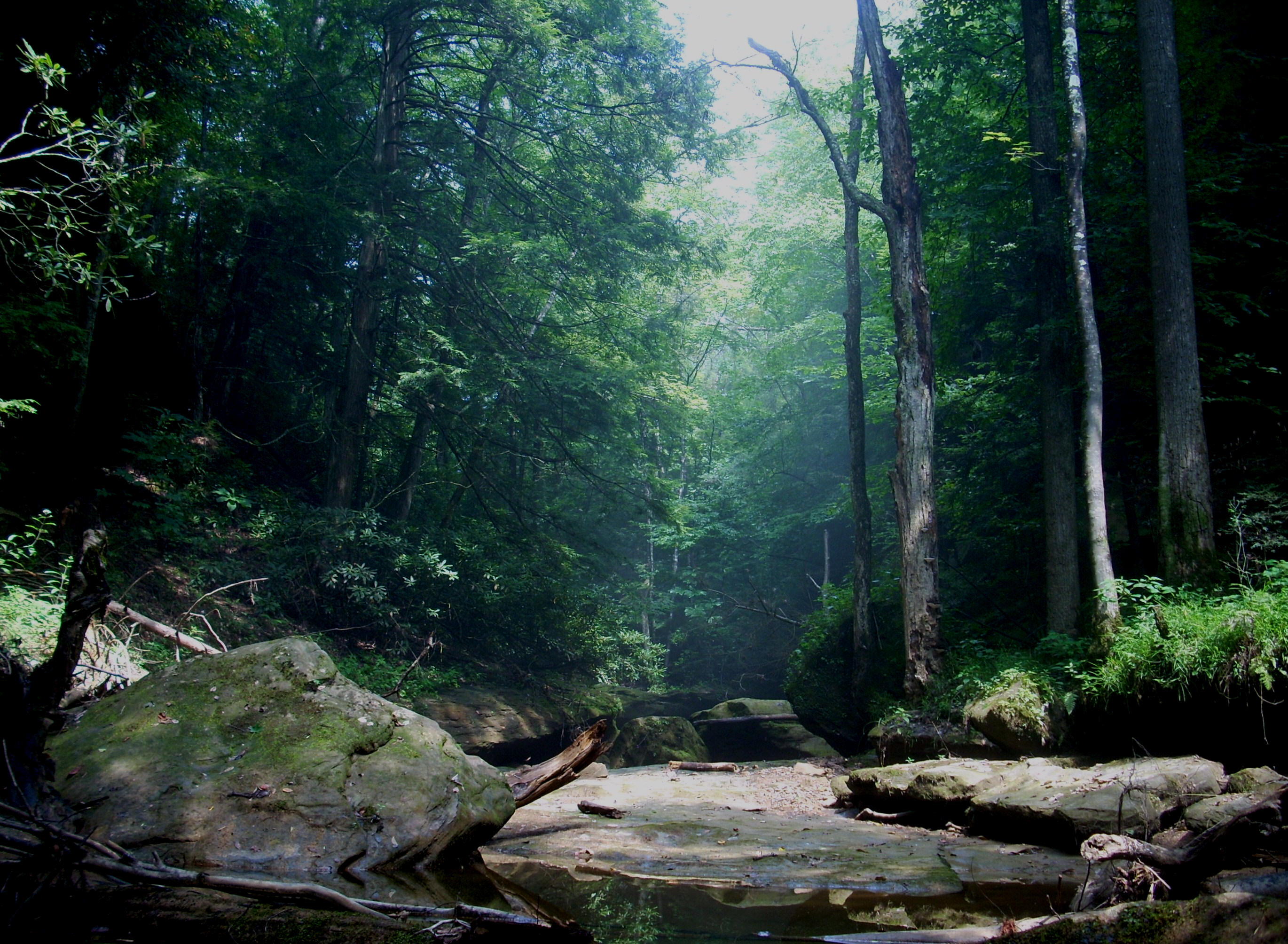 Your entry into this cove is a particularly beautiful one, by the way, with palisades that just seem to envelop you. I felt pretty small. Of interest, too, is that this cove is formed by the merging of 2 streams. The Little Gimlet is the main one, but the Lick Branch and it's falls are back here too (see below)…