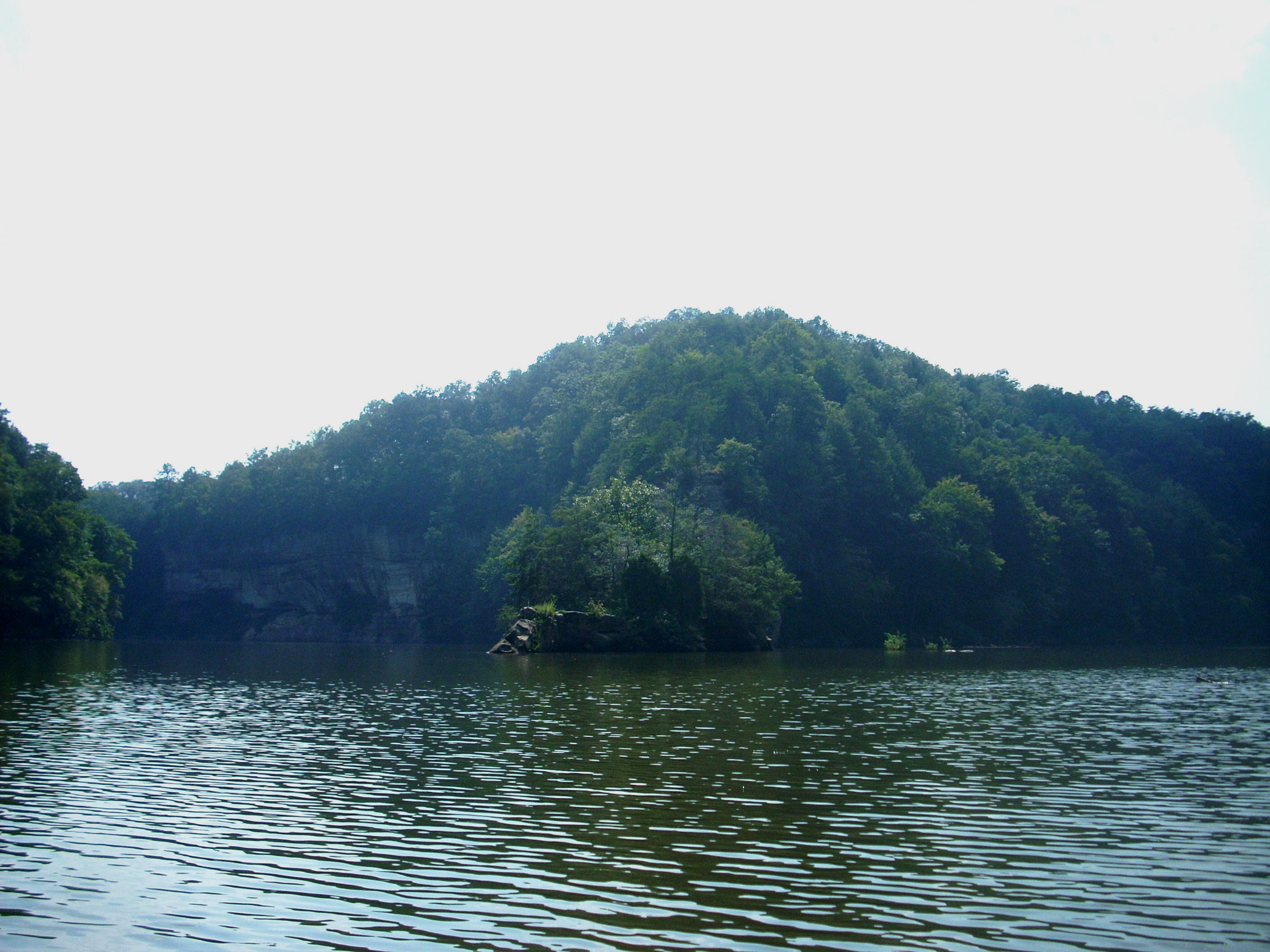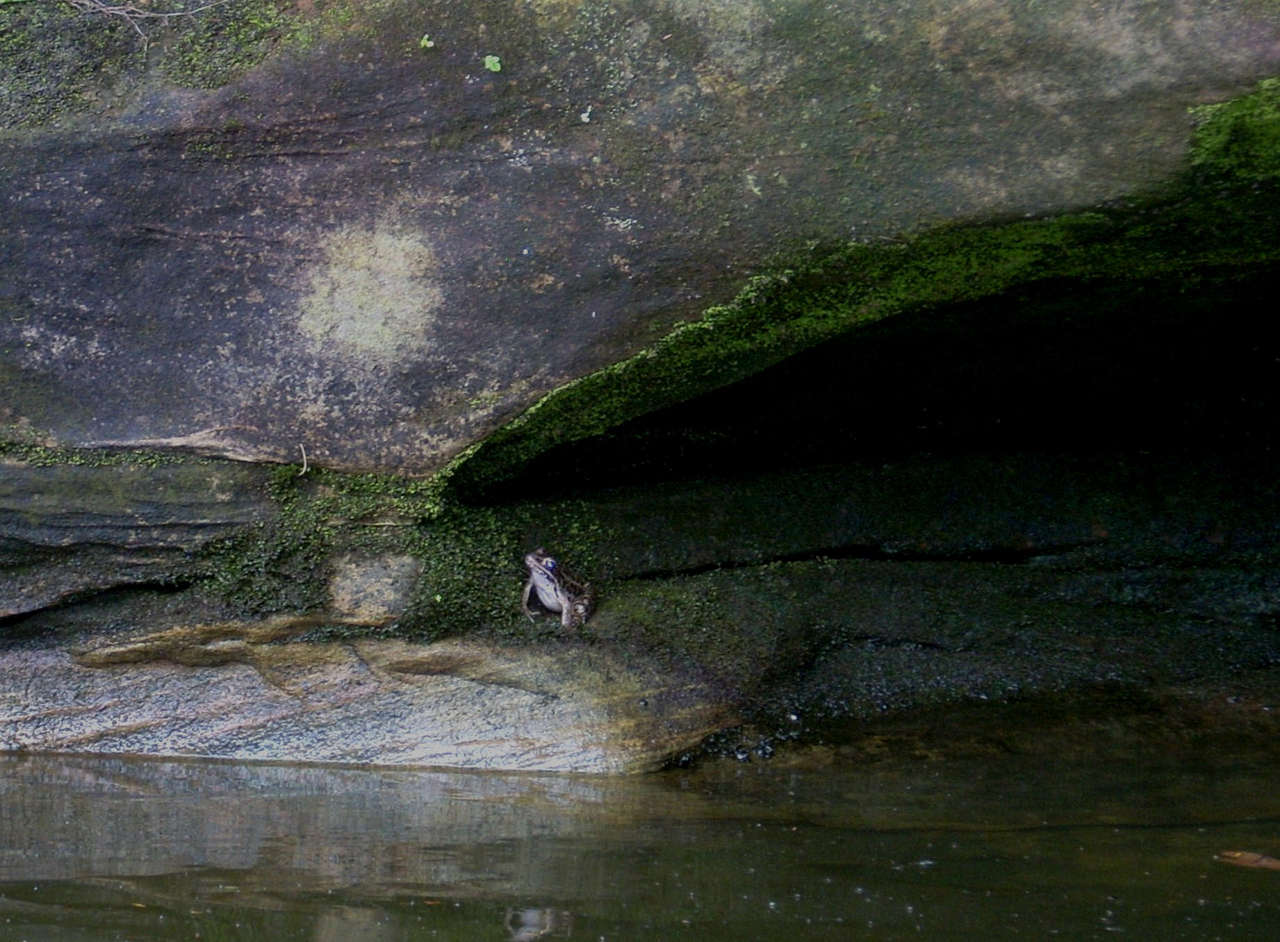 Also of note out here are all the little coves, although many are simply waterfall carved “indentations” in the rock, some of which were still dripping today. I must have passed a couple dozen. After a rain it would really be sweet to paddle out here! That not to say, however, that there aren’t any paddle-able coves. In fact, there’s one that comes in along the first straight. I was able to explore about 250 yards and when I emergedI had an encounter with the frog below. It was hanging out in the back of a little rock overhang. I'd noticed some movement as I went by, you see, and then I saw a pair of eyes…