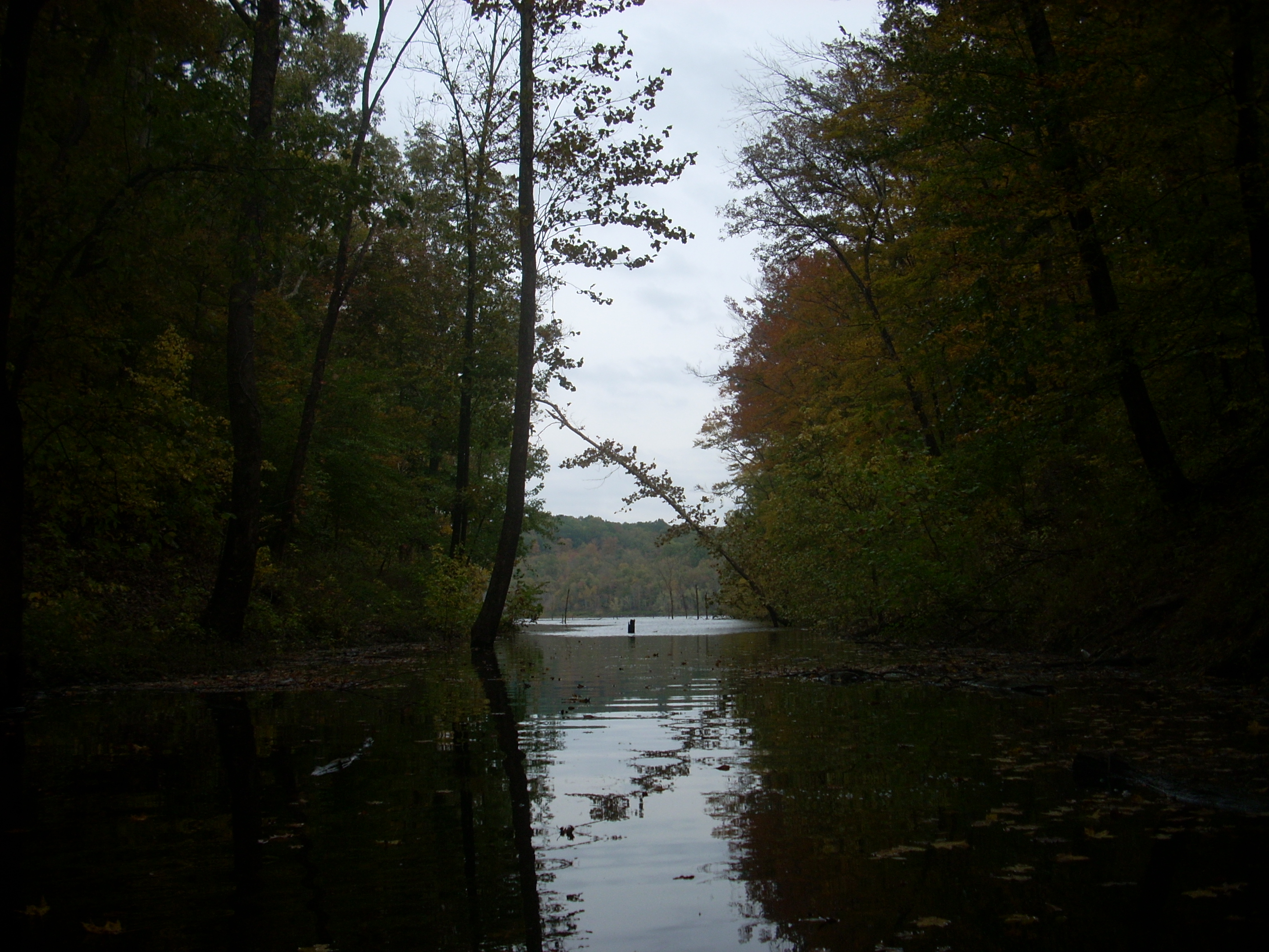 This “M” shape I’d be paddling today actually looks more like a “W” on the map (see http://www.lrl.usace.army.mil/tay/article.asp?id=190), but I turned the map upside down in order to see the lake from the perspective of the Van Buren Ramp. Anyway, when I reached the middle of the letter there was a flooded cove which essentially took the edge off the curve here and provided a kind of short cut. As I paddled through the flooded trees I met with my first view of the Chowning Lane Boat Ramp. At least as large as Van Buren, this one is also very nicely done and has many spots off the parking lot where one can come down to the water and fish. I didn’t see any facilities, however.
