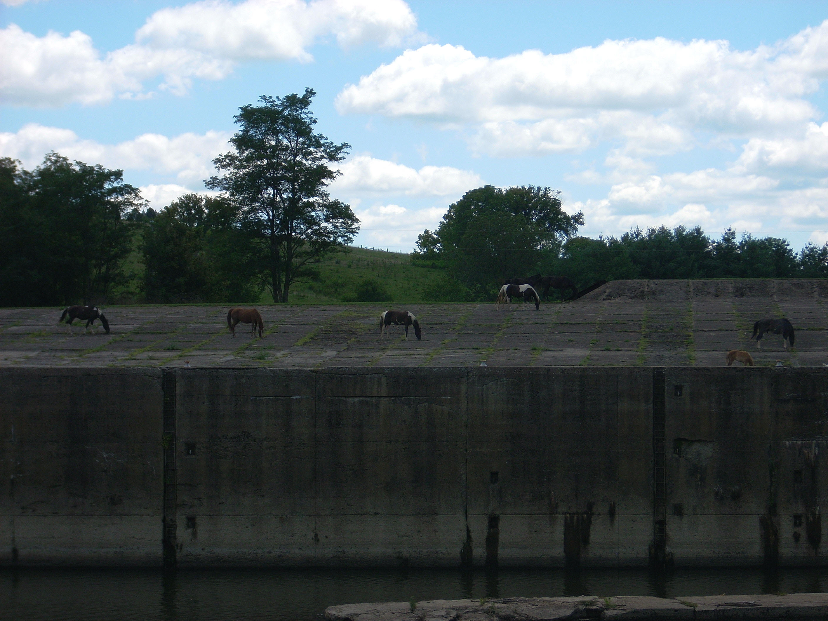 When I walked up on the beach to take some pictures I got a chuckle. There were actually some horses grazing across the way on top of the lock! There couldn’t have been much grass over there between the concrete, but there they were - about a half dozen of them! This was something else that made me want to just throw up my hands and laugh! What a great sight! I climbed as far up the rocks above the beach as I could, but was unable to get high enough to get a good, all encompassing view.