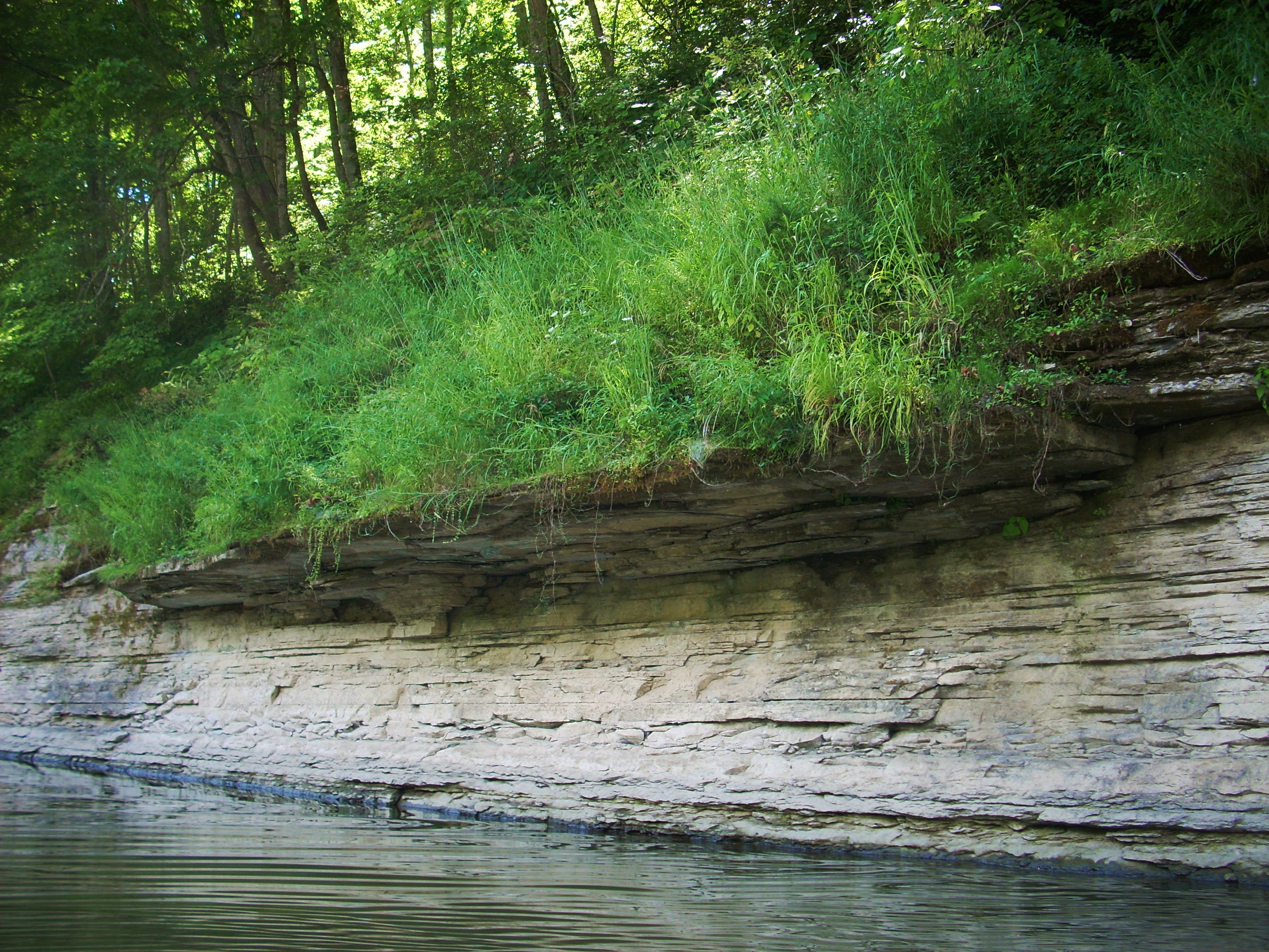 Back to my slide shape - as you go down the ladder the scenery shifts. The rocky side is on the left now with the farmland on the right and a few things interested me in this section. As per the picture below, some of the rock overhangs look almost like the planters you’d see on a window ledge. Also at a few points you’ll see a kind of alley all the way down the mountain where a little unnamed stream has come down and taken out everything but the rock face. There was also a fallen tree protruding up from the water at one point in here that a considerate boater had painted bright orange in order to make it stand out. People on the river almost always seem to be very considerate.