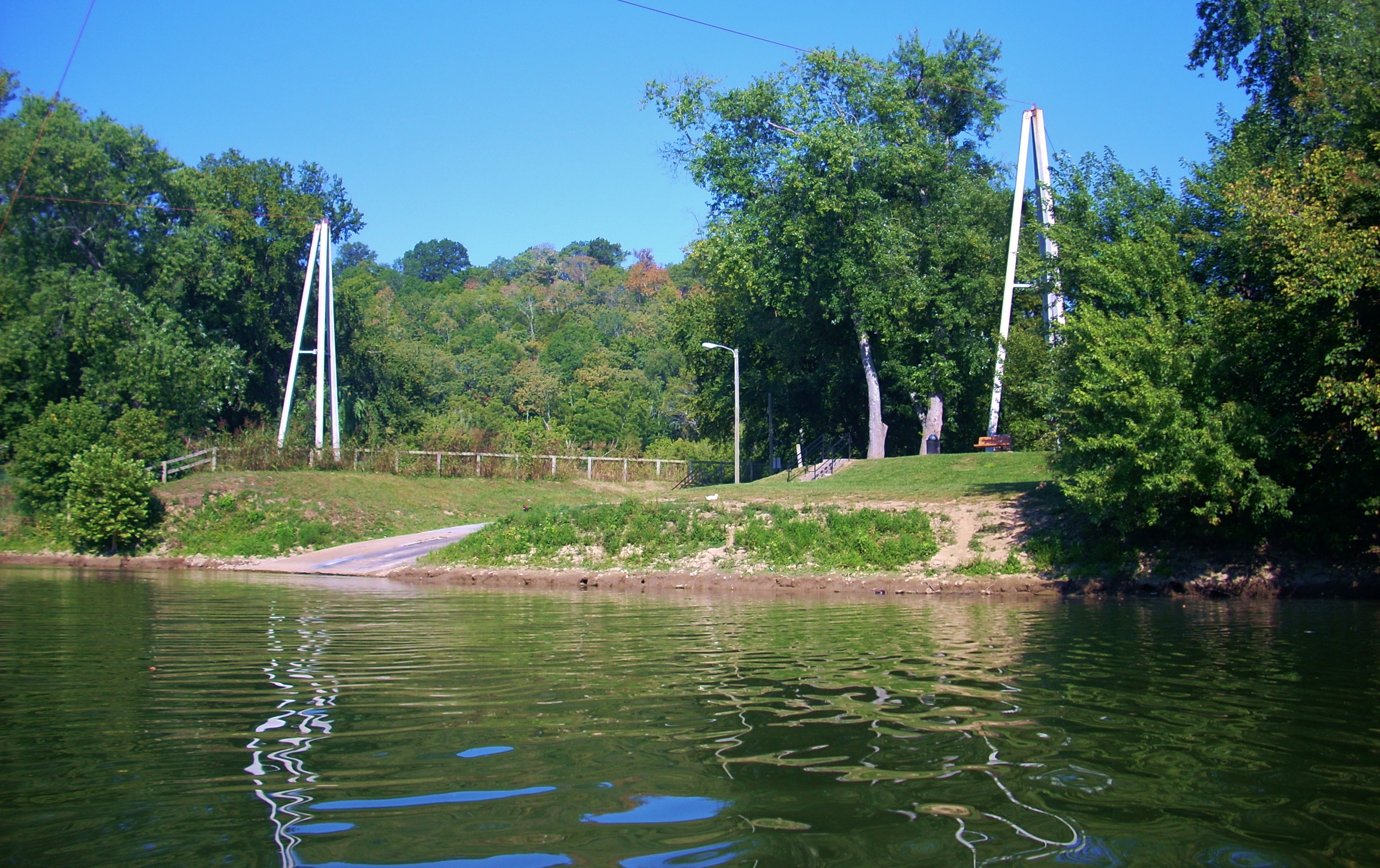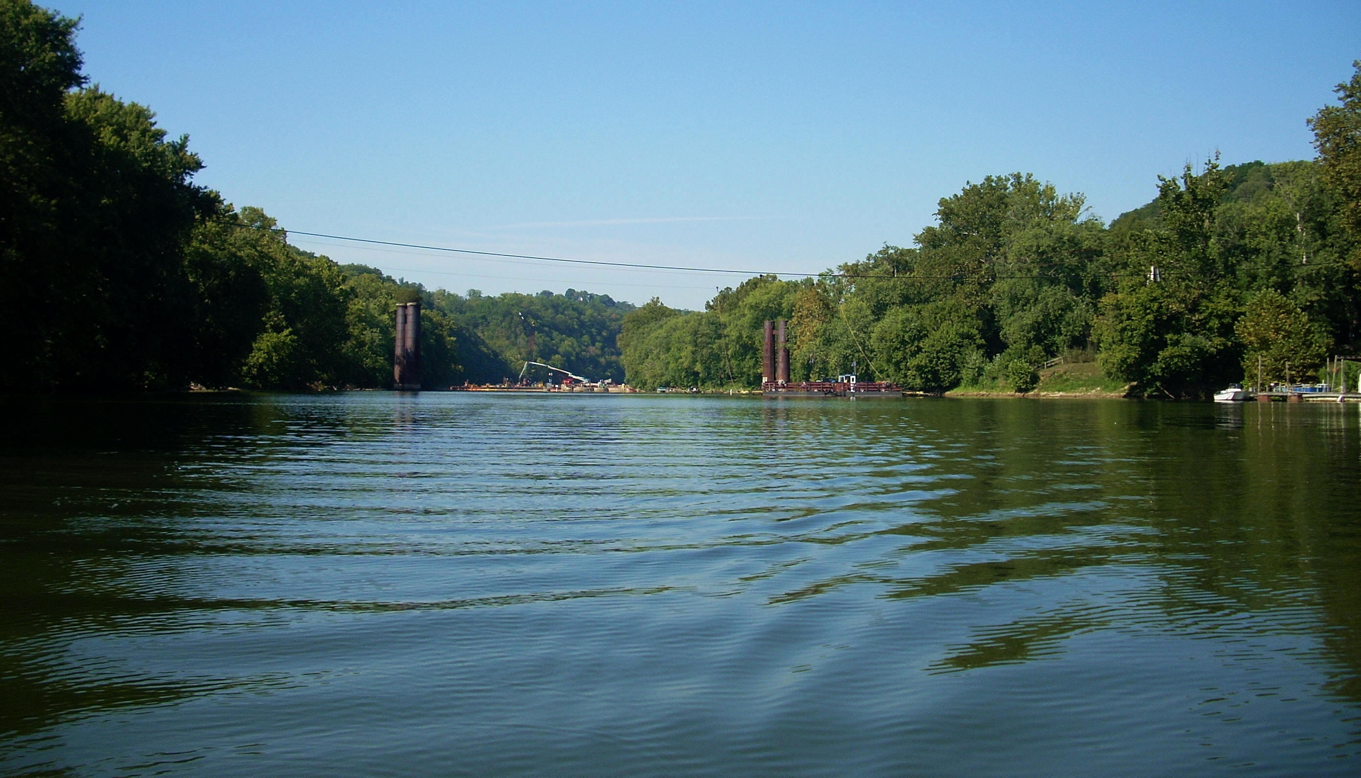 Anyway, downriver from Tate’s Creek things get pretty interesting. There’s a private boat dock and ramp on the right and the aforementioned Valley View Ferry runs over the river as well. Today they were doing some work on dam 9 which was visible in the distance and there were also some more of those old bridge piers here - the same kind that I’d been seeing on the river ever since Heidelberg. I'd surmised that these were remnants of old railroad bridges, but the guide I mentioned provided the last clue to the mystery for me.