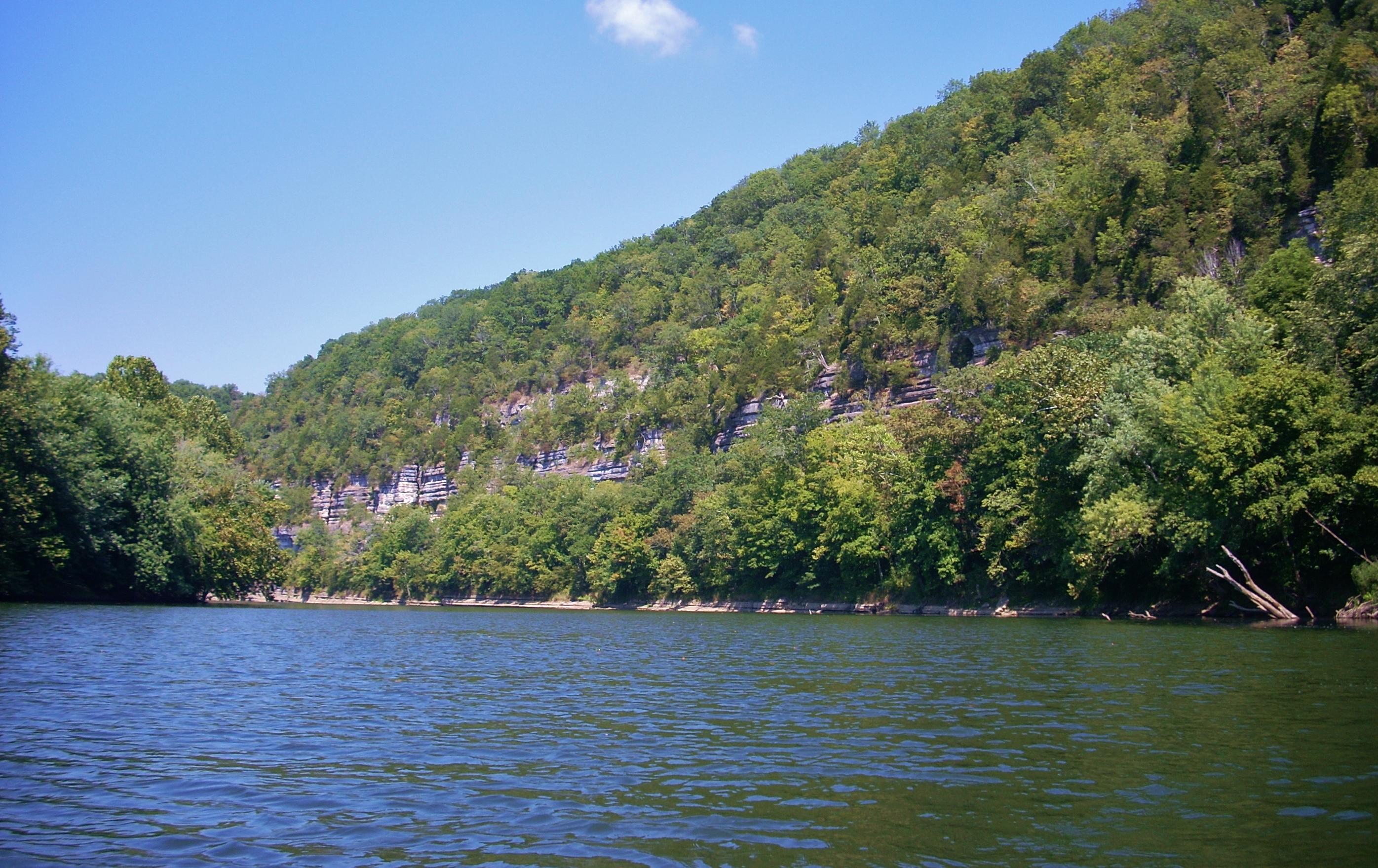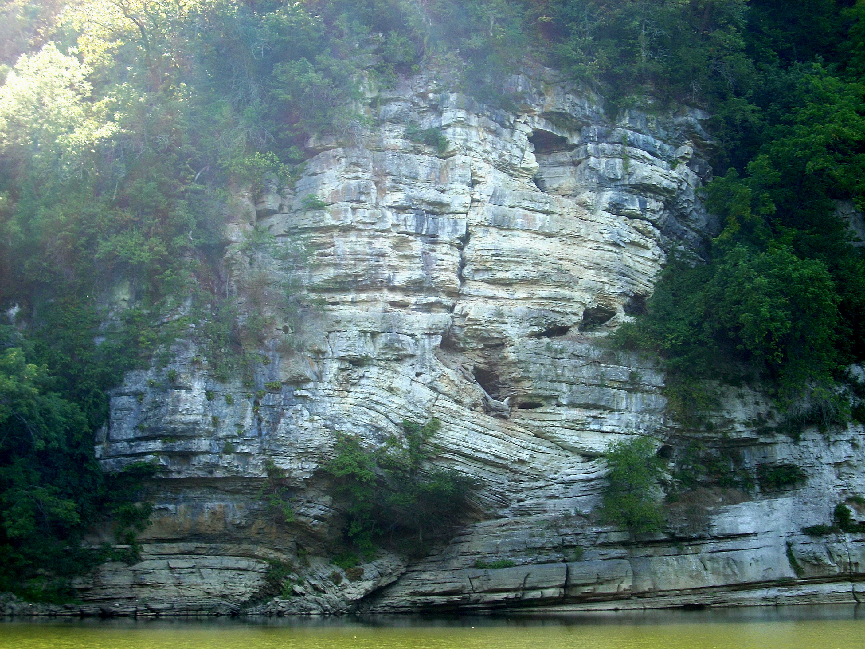 Anyhow, as you start out from the bridge the rocky bank will be the left one. It’ll begin with just a rocky bottom but it’ll end at a full palisade which contains a fault line. Yes, a fault line! Check out the curves the rocks make – especially at the bottom center! They seem to arch downward at a 90 degree angle. This is called the Bull Hell Cliff. For that matter, you’ll know you’re fully in the palisades region on this trip because a rock face will come in perfectly from a different side at just about every mile mark from mile 169 to mile 165. After this, you'll find a rocky side alternating for the next 3 miles though there’s no palisade. Mile 161 is then skipped, but a full mile of palisades follows. What can I say? This place rocks! Of note, too, is that the community of Clays Ferry will be on your right as you make the curve here. .