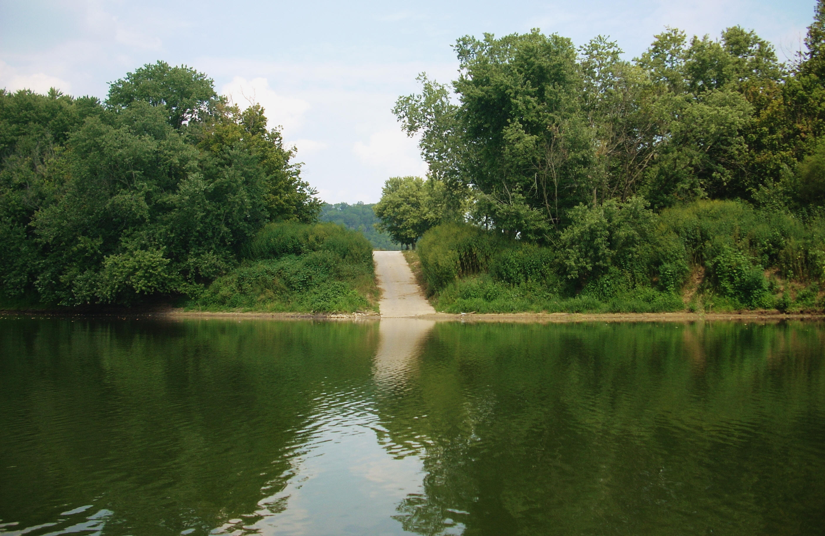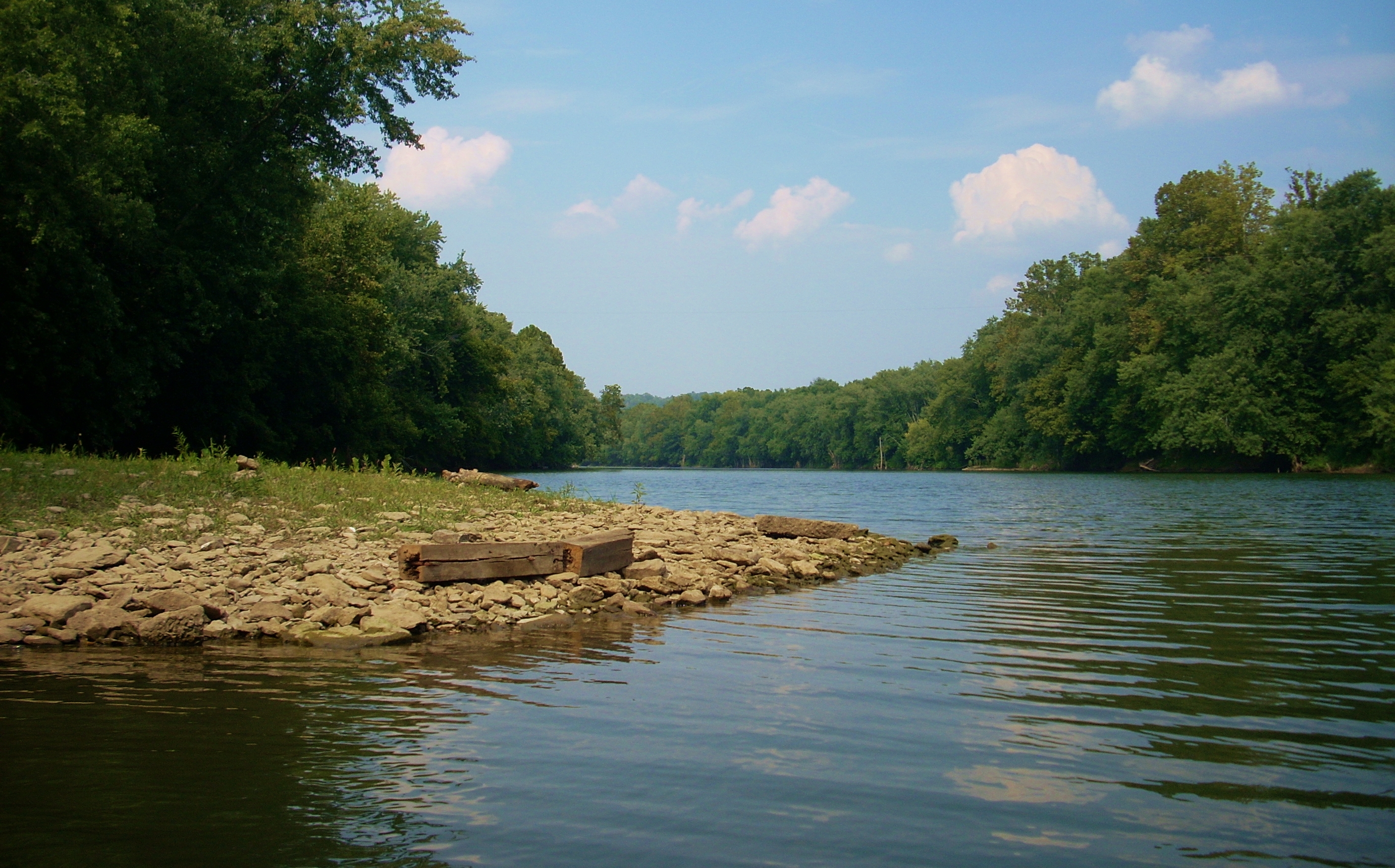 Anyway, after the water intake the river is pretty much straight for almost 4 miles from mile 154 to mile 151. The palisades are gone for the most part, although they will crop in briefly from time to time during the remainder of the trip. Sea Lion Branch and Boone's Run come in from opposite sides directly across from each other over shoals at mile 153, and it was here that 2 ferries once operated side by side - the Boone ferry and the Carver ferry.