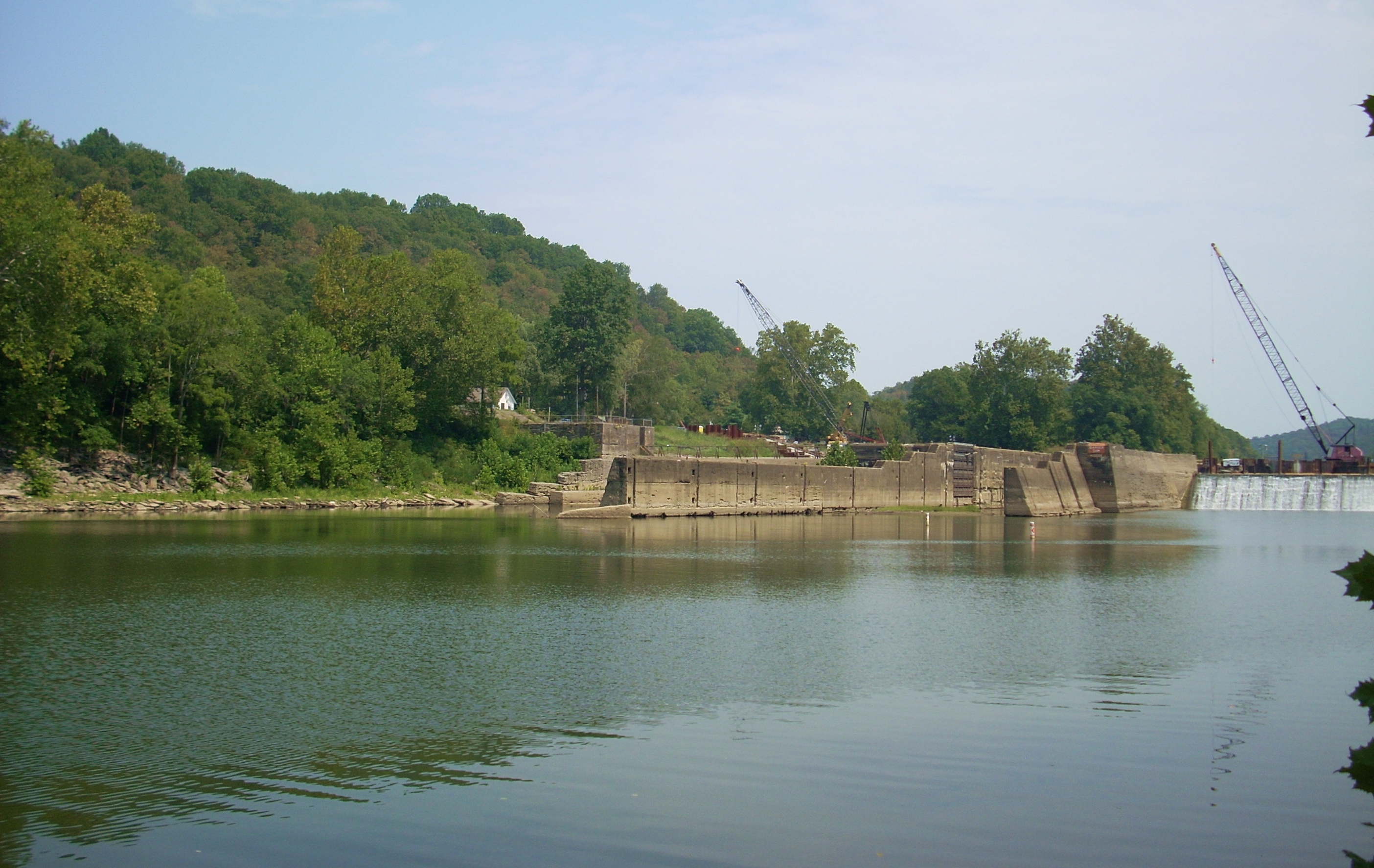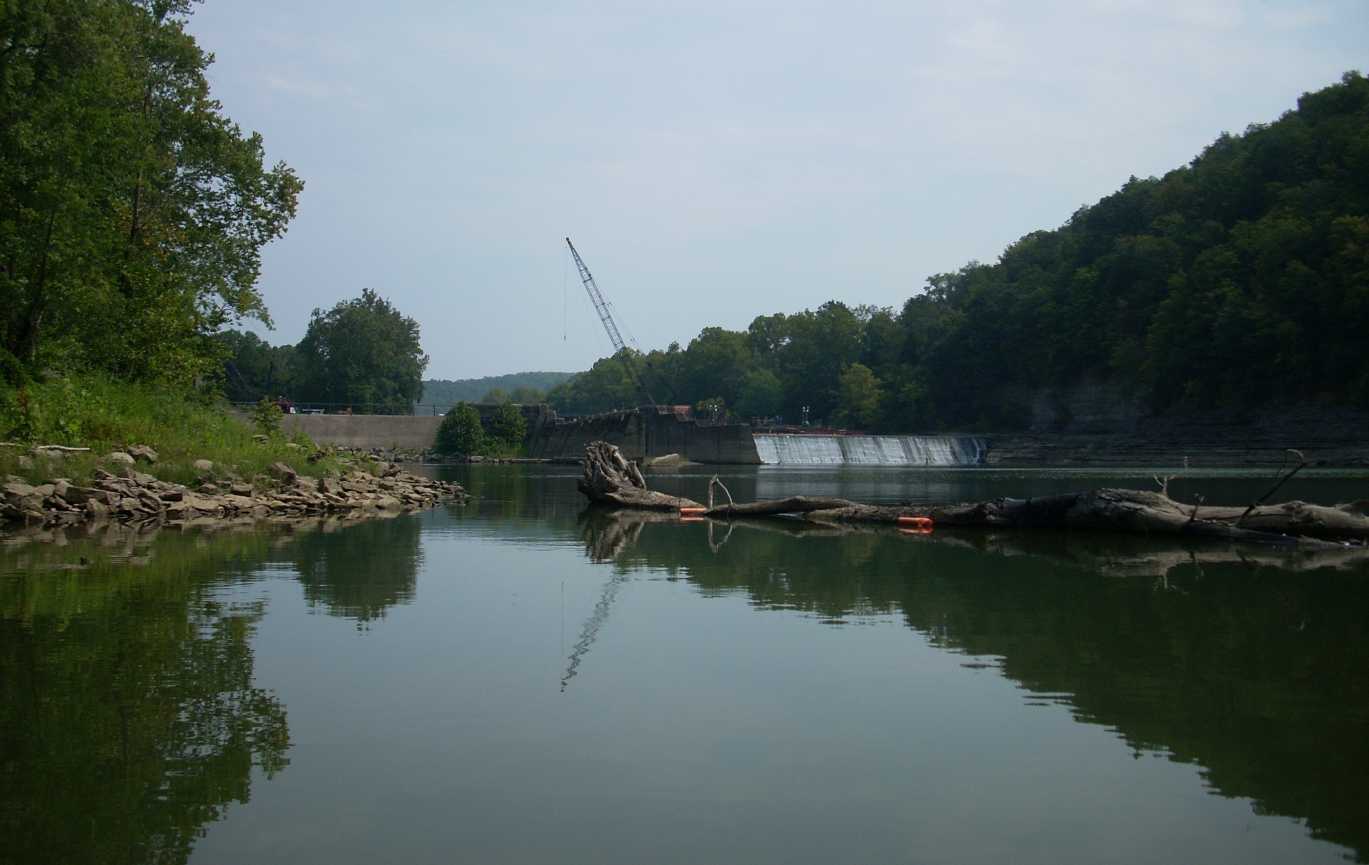 Once I got up to Lock and dam 9 (about 8 miles upriver from the ramp I used at mile 157.5) I technically began the trip. This lock and dam still had a lot of work being done to it, and it looked like they were reconstructing it with a totally new design. It had the appearance of a string of large metal cylinders filled in with concrete. As mentioned in a previous entry, this lock used to be directly onshore, but the 1905 flood essentially put it in the middle of the river and a new wall then had to be built to reach back to it. I saw what could have been a lock house atop the bank here, but I wasn’t sure if it was part of an actual lock house or just something new.