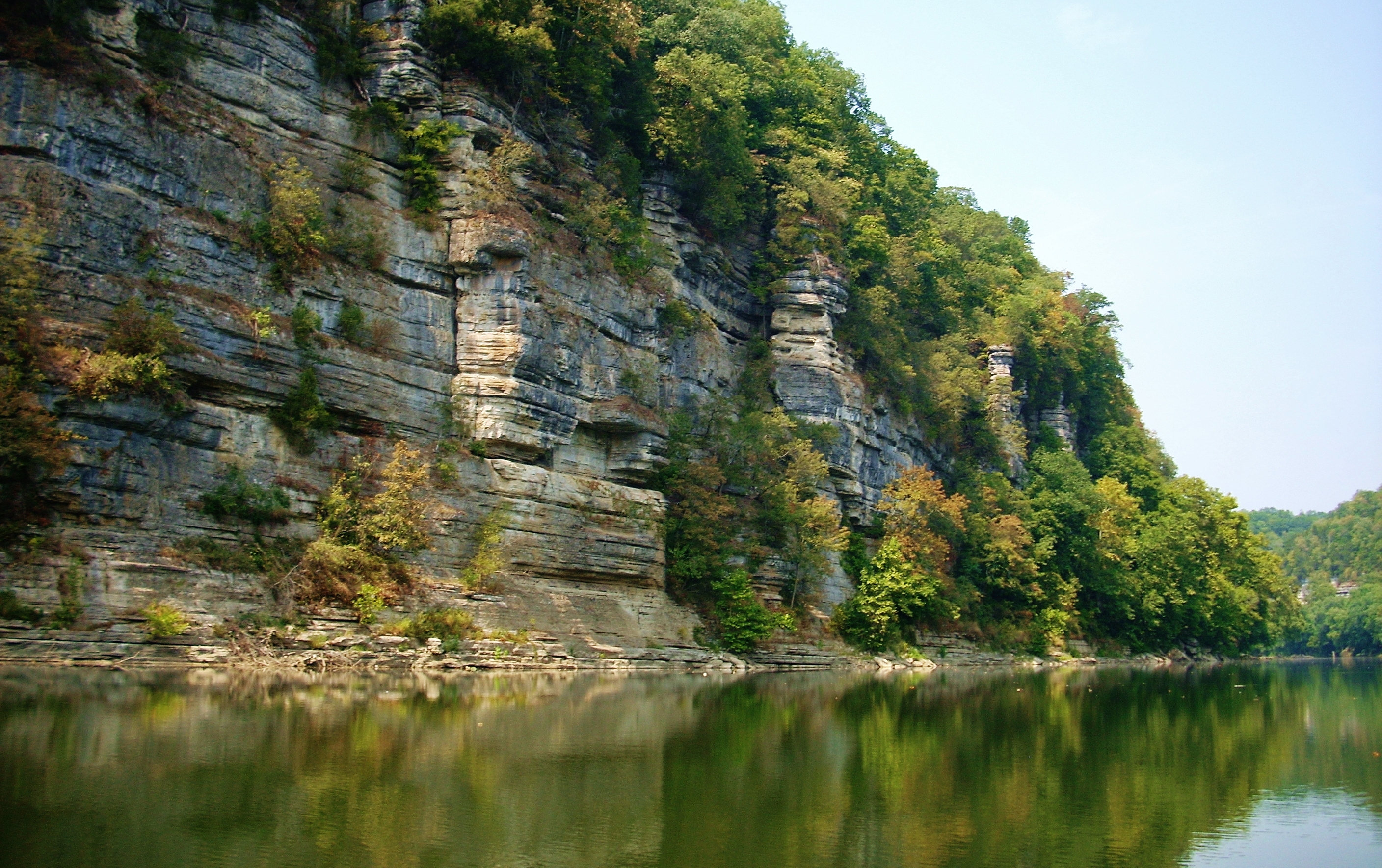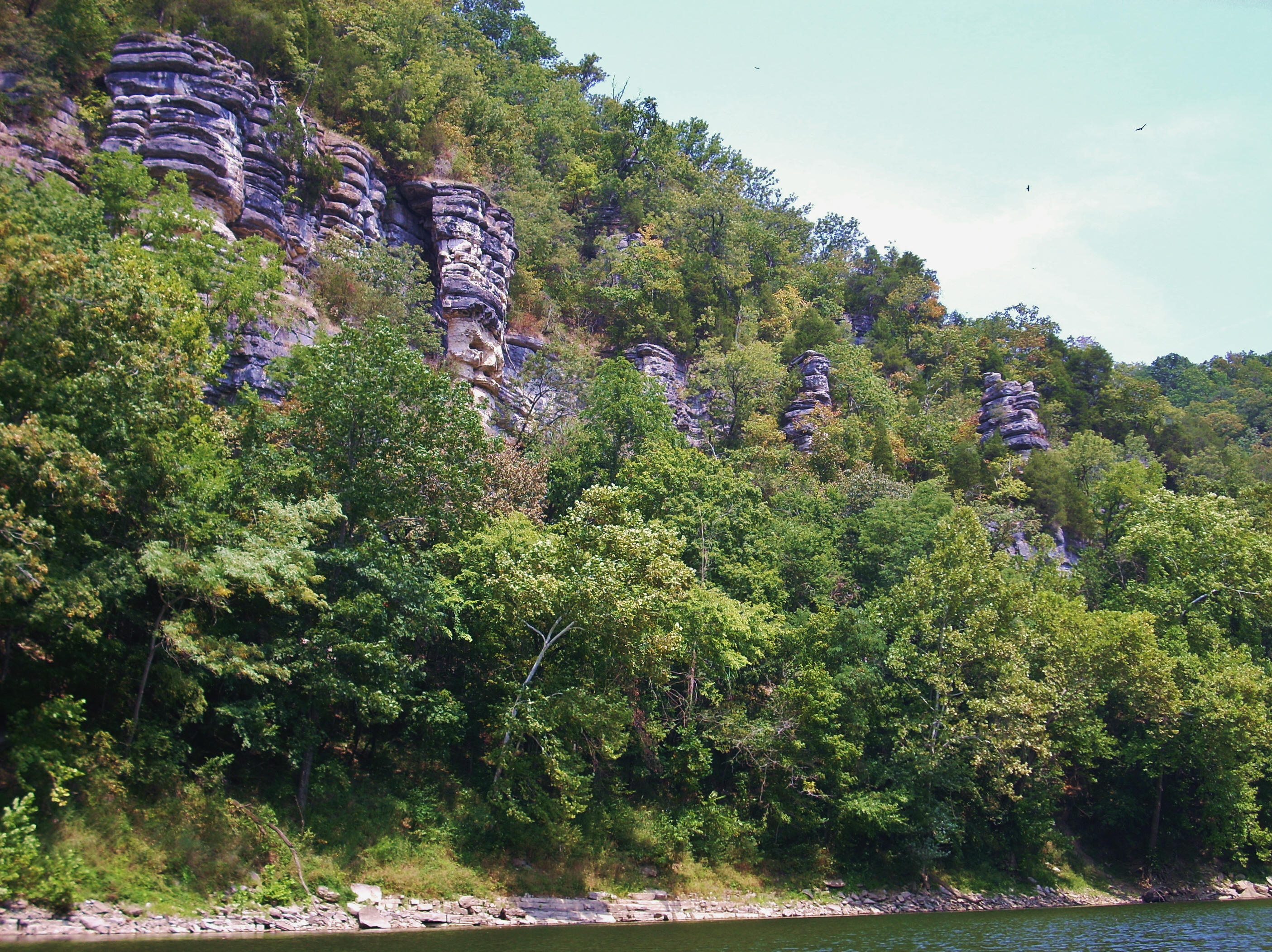 Anyway, after the old camp the rocky shorelines rise quickly and significantly on the left side to form the tallest palisades I’d seen yet (first picture below) and at a curve left at mile 155 these rock walls will switch to the right side as the Devil’s Pulpit comes into view (second picture to the left of center). Now, honestly… life must have looked pretty bleak indeed for people to have named such beautiful things with such ghastly names! So far I’ve paddled into one Hell Creek, curved around a Devil’s Backbone, rounded Bull Hell Cliff, gone under the Devil’s Meat House Cave, and now I’ve reached the Devil’s Pulpit rock formation! There’s a great picture of this formation in the Boating Guide too. The pulpit is said to be free standing and it was said to have been first noted by none other than Daniel Boone himself.