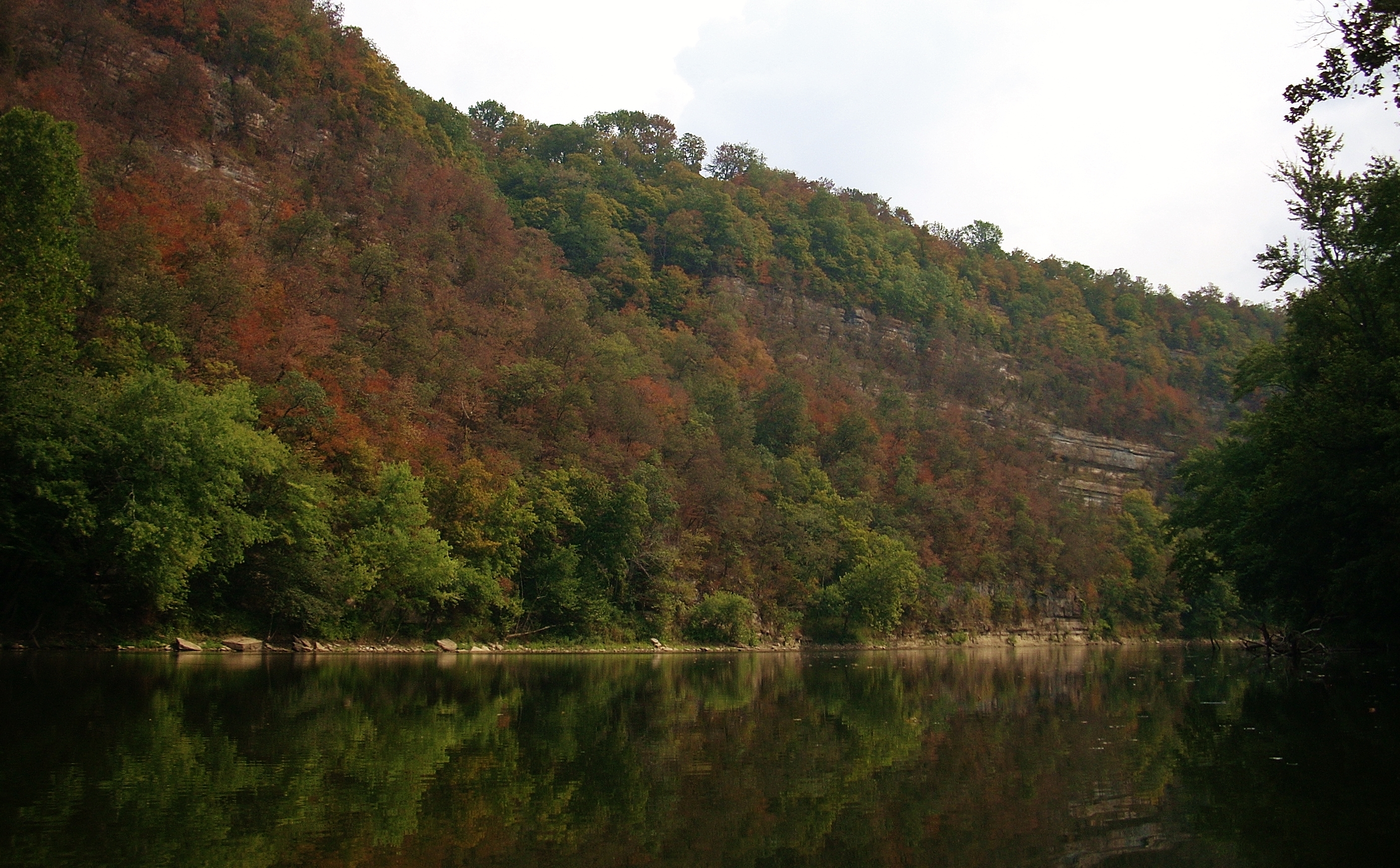 Boat Hollow is a stream which came in dry at mile 124, while the Twin Branch came in (also dry today) at mile 122.5. It was between these that I noticed a huge tower of some kind on the same (left) side. It was thin and looked to climb ½ mile high – possibly a cell phone tower? At mile 122 the rock palisades attempted a comeback on the right side, but the left held its ground for another half mile. It wasn’t done showing off yet! The leaves, too, start to change color on the river at this time of year (late August/early September) so along with the grey palisades you can add all the other colors of autumn! The effect is simply wonderful, and in some places there’s a color progression down the mountain with the leaves changing color at the top, while the middle is almost completely defoliated and it's green at the bottom!