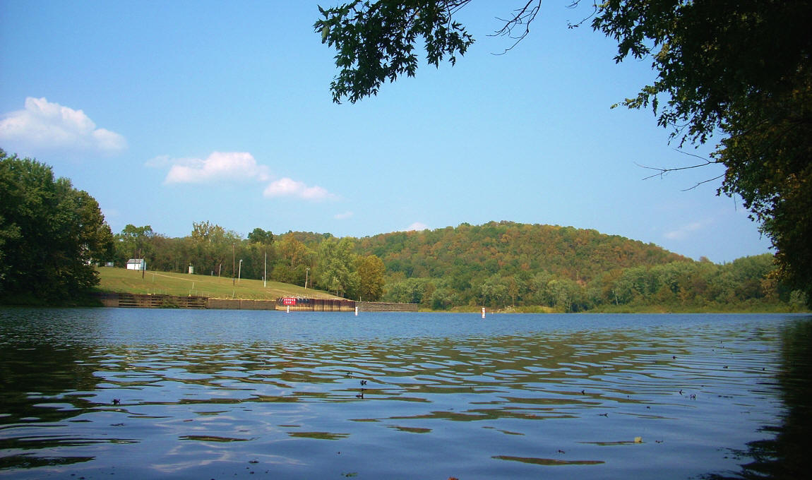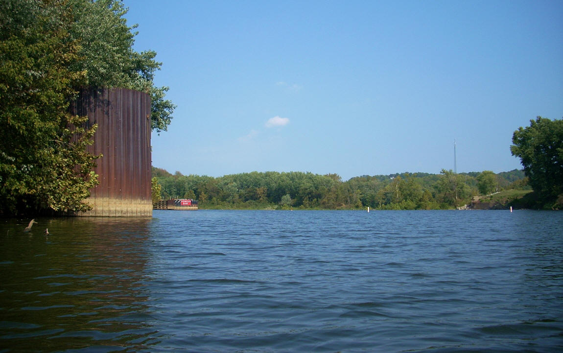 In the midst of all these streams I saw more houses on the left side - and more than I'd seen back at Polsgrove. It had me thinking that this area was more "Polsgrovish" than Polsgrove! OK, maybe I’ve completely lost it now… From this point you’ll begin to see Lock and Dam 3 after a nice looking farm in a clearing on the right (although you'll want to be well to the left, lock side, of the river now). You'll notice some more dwellings amid the rolling hills just past the dam (that's Monterey, Kentucky), and just before reaching the lock you'll pass a massive mooring cylinder – the largest I’d yet seen.