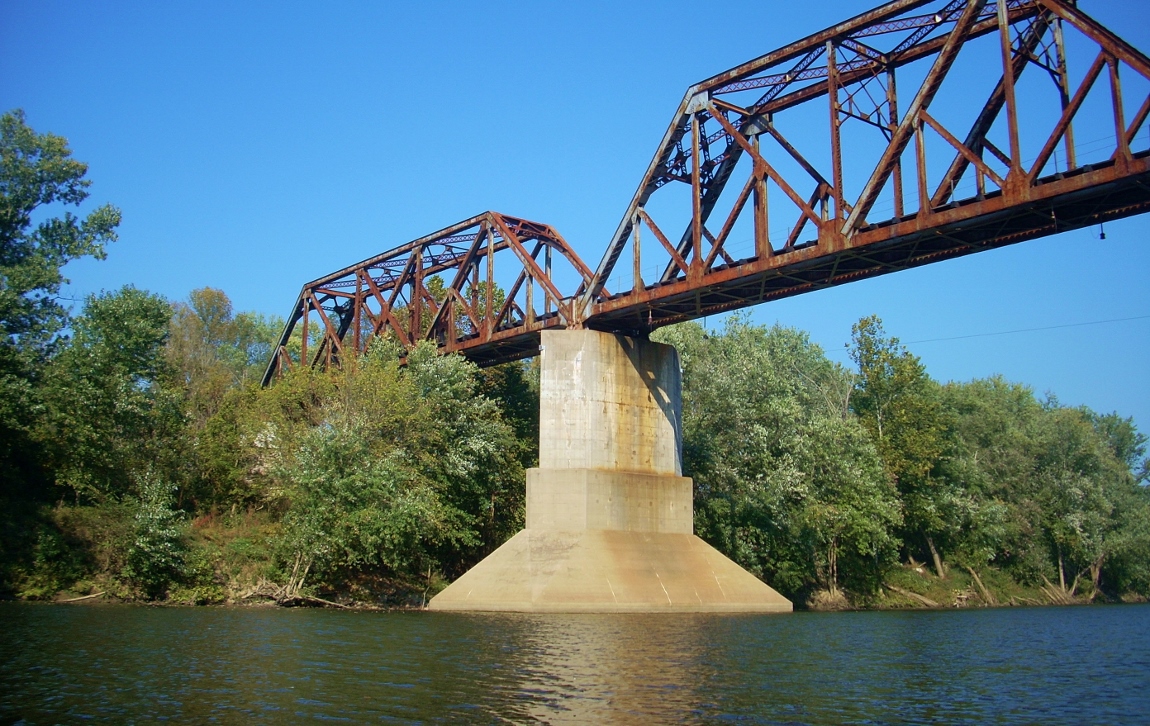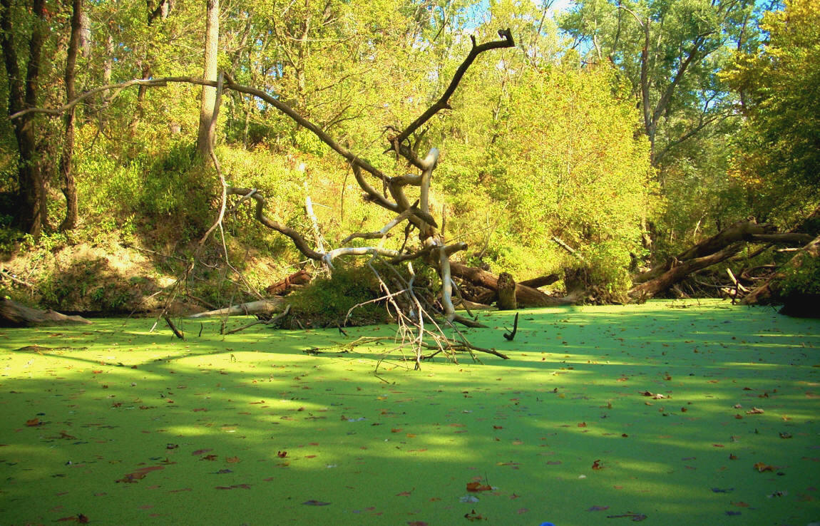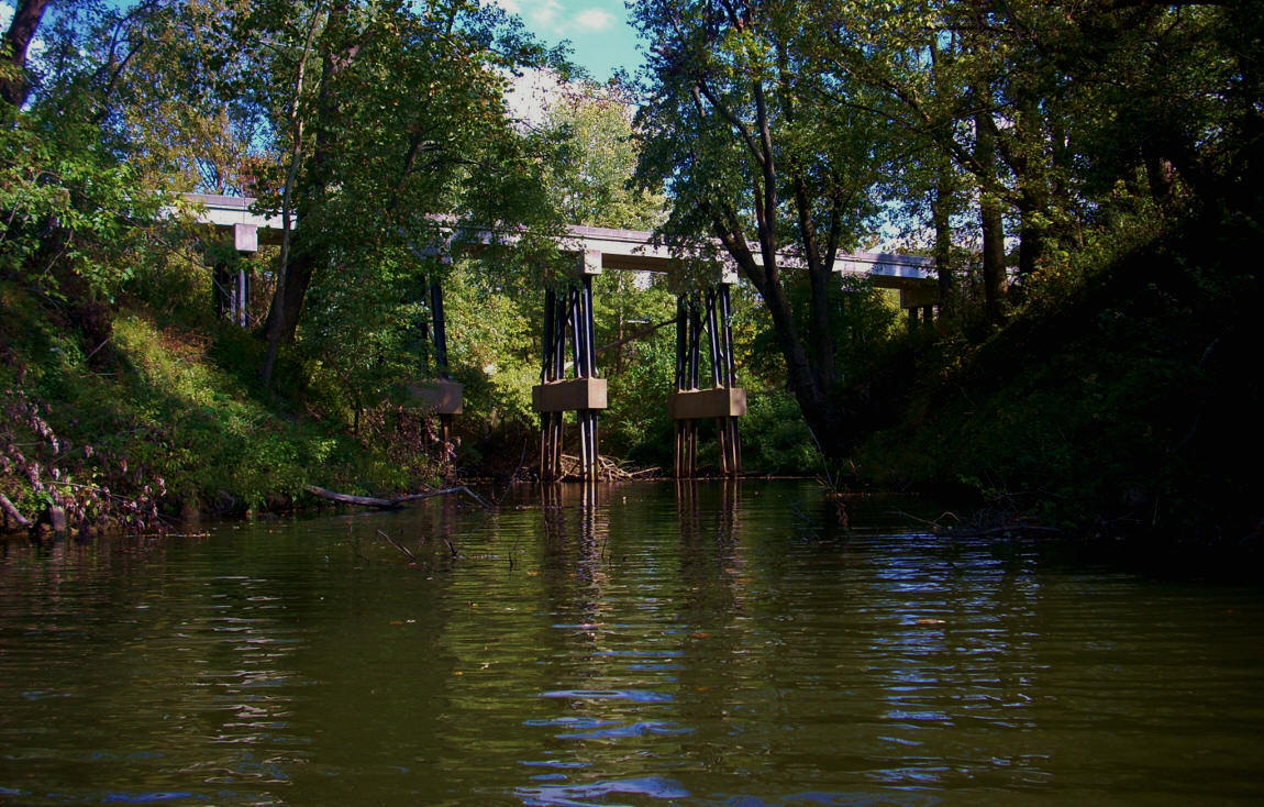 A two mile straight will now greet you with an Interstate 71 bridge visible up in the distance. There's also a stream on the right side that you might be familiar with - White’s Run at mile 6.5. This was where I'd driven over all the underbrush in search of a put-in! The stream itself is nice, and you'll pass under a couple bridges, one of which was of a different construction than any I'd seen before (see second photo below). I also encountered more of that green alphabet soup alga at the back - the kind that I'd encountered before in some of the upriver sections (third photo). I guess it's more common than I thought, and that's OK. I think it's pretty cool to look at!