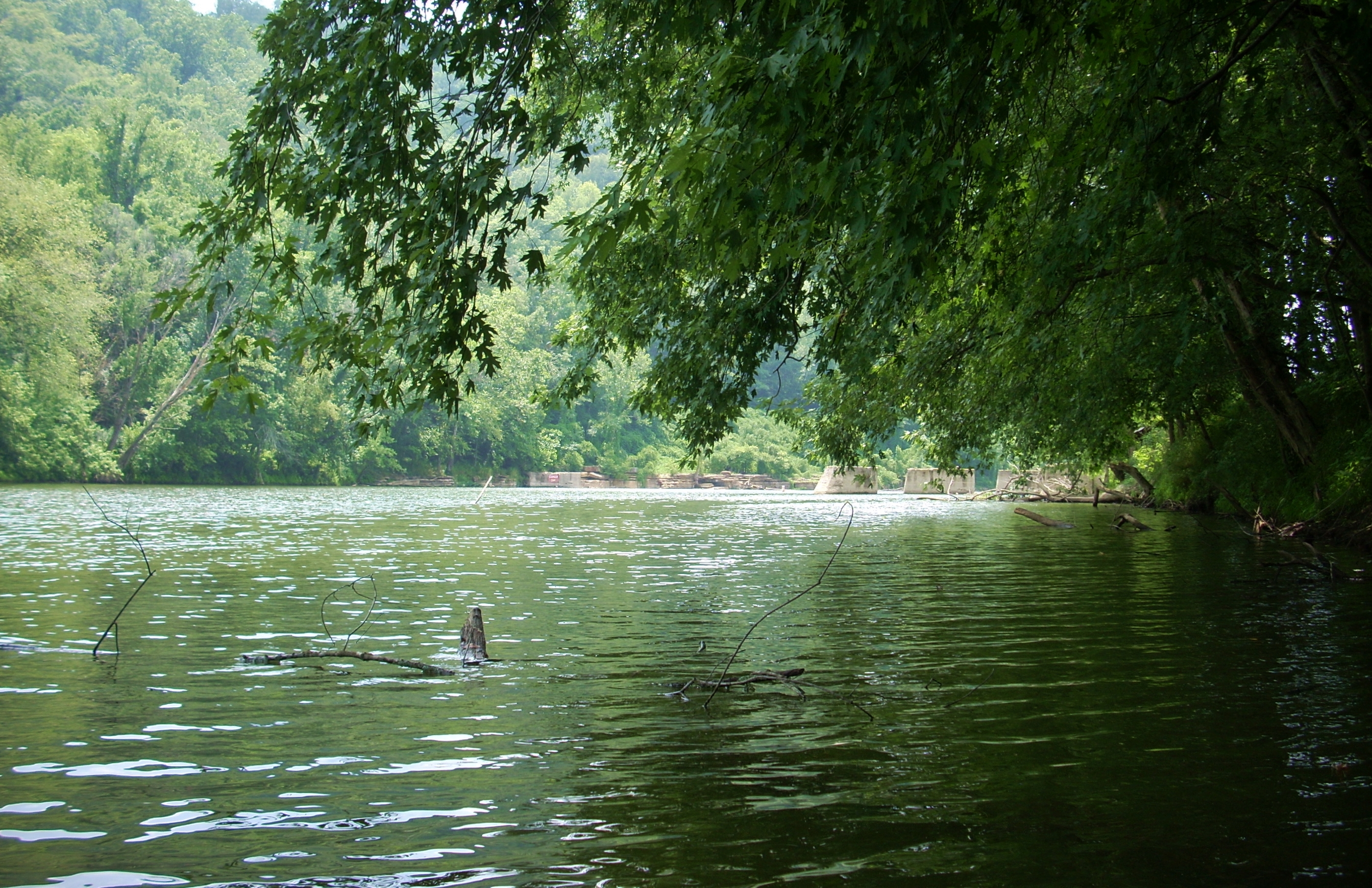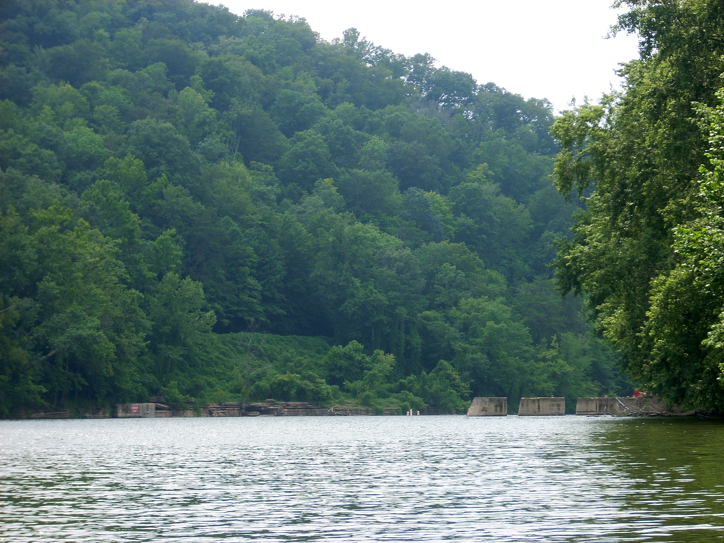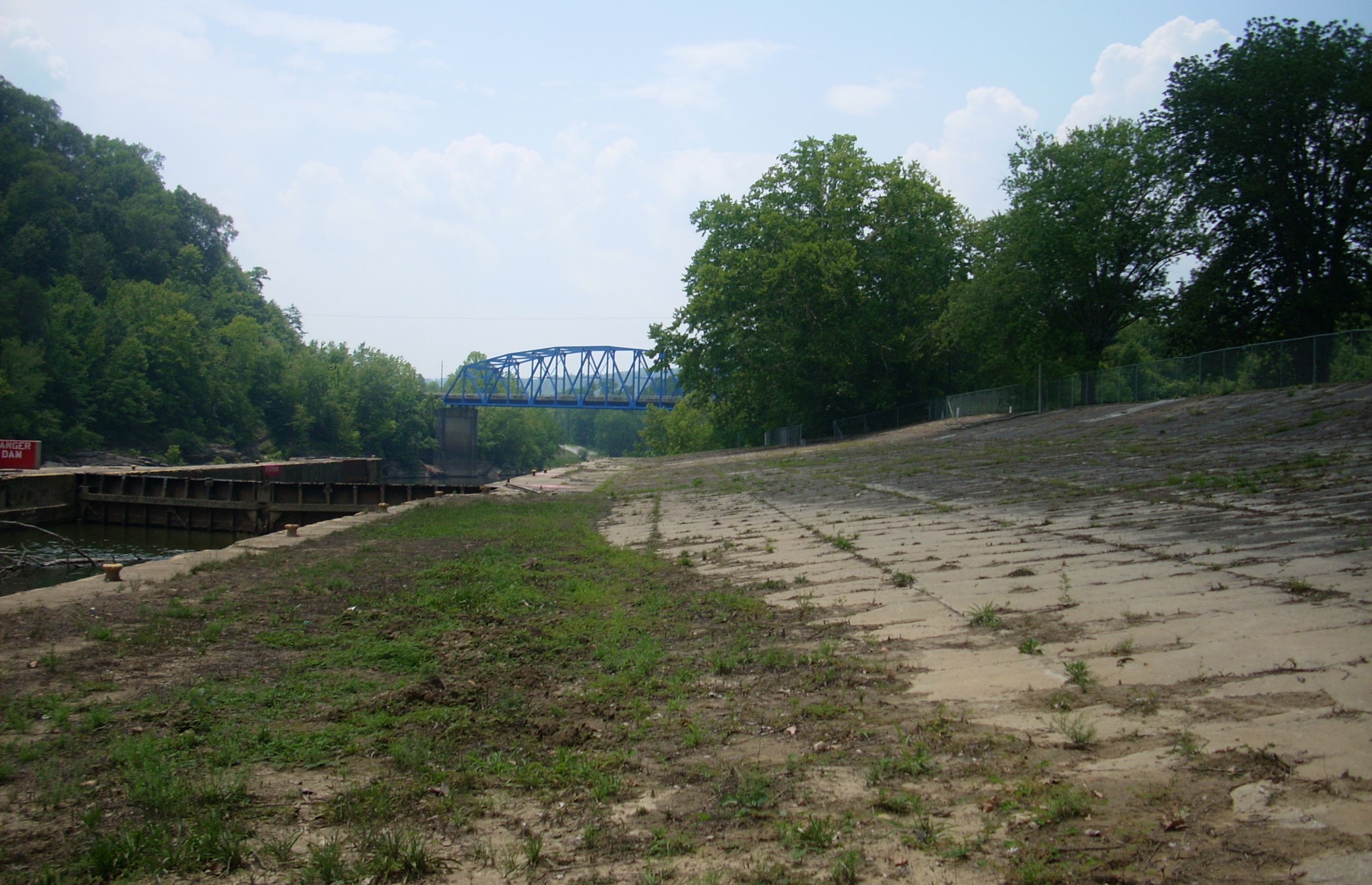 Upon reaching the top I observed that there was a chain link fence surrounding the area. Someone had knocked this particular section down, however, and I decided to go a little way in to take some pictures. Doing so, I discovered that there was a park here too. Well, thus distracted, I didn’t properly negotiate the fence which had a bottom portion that protruded a little bit upwards. I tripped over it and fell hard onto the fence and the pavement beneath. My hands had been on the camera so I wasn’t able to break much of my fall. El Clutzo strikes again! :) The picture below was taken looking downstream. That's the bridge at Heidelberg, Kentucky in the background and that's where I'll be starting from next time.