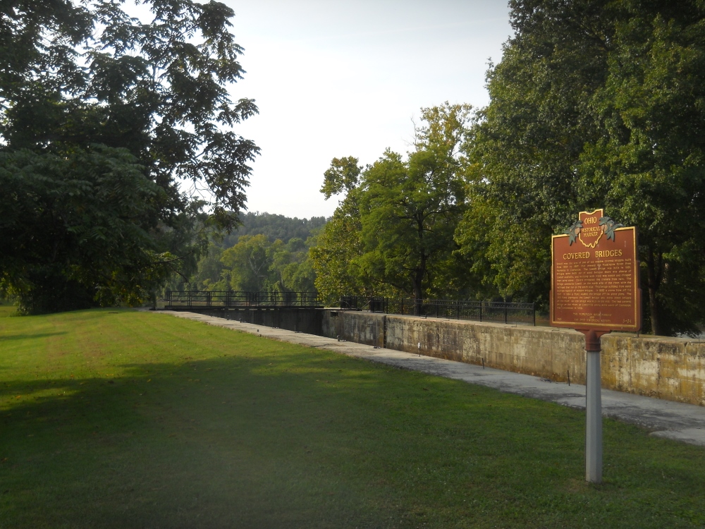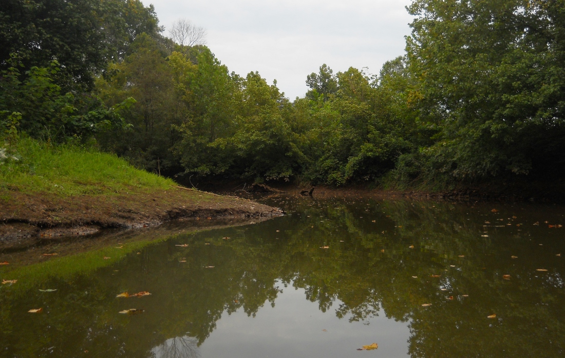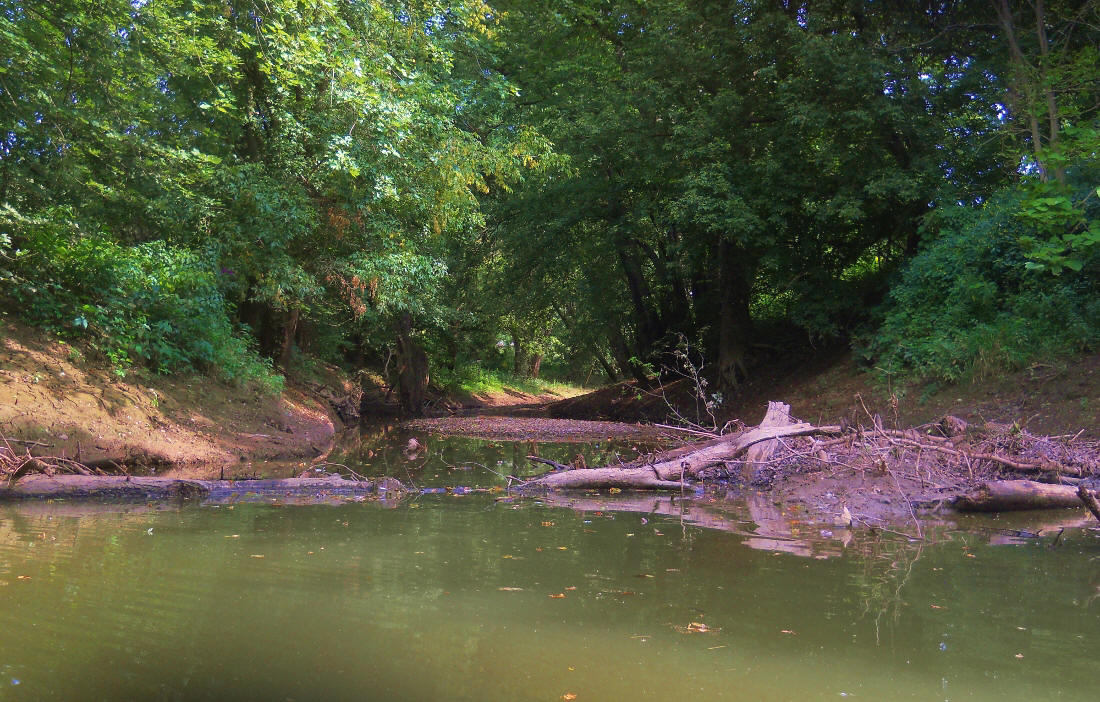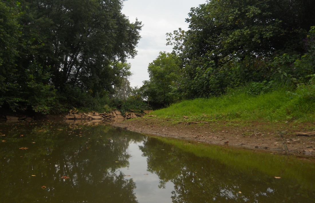 About a mile downstream from the lock wall you'll make a left curve which will be followed by a long, 5 mile right curve which roughly takes the shape of your right ear. This entire area is all wonderful farmland which is overall quite peaceful despite the fact that Ohio Route 60 runs alongside you almost all the way. Two streams come in about 2 miles down, one on either side - Bear Creek and another unnamed stream. Neither were navigable. Bear Creek is below...