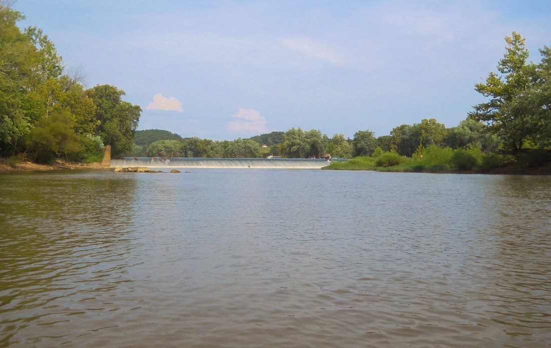 ...and below are some scenes from the dam. There are some really nice areas to beach here amid a couple little islands, although they're usually soiled by geese. One thing I noticed is that as I paddled up the chute on the far left side of the photo below I noticed a large, round millstone just under the water near the dam.
