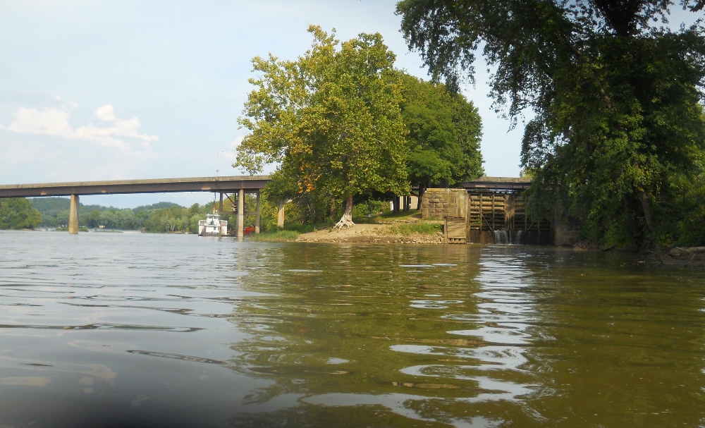 Once on the water I saw that the dam was just in view upriver so I decided to go ahead and paddle up there instead of doing it later. Below is the scene from the water once I put in. You can see the dam upriver along with a boat, the William Marshall, assisting with some work being done on the bridge... I think the views are incredible here!