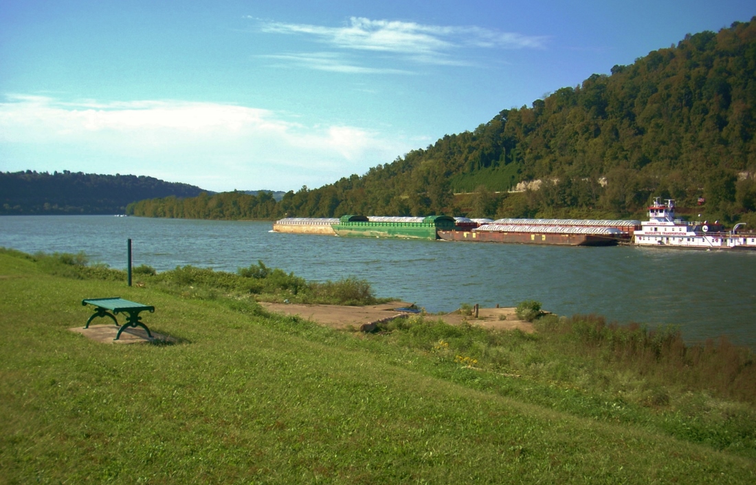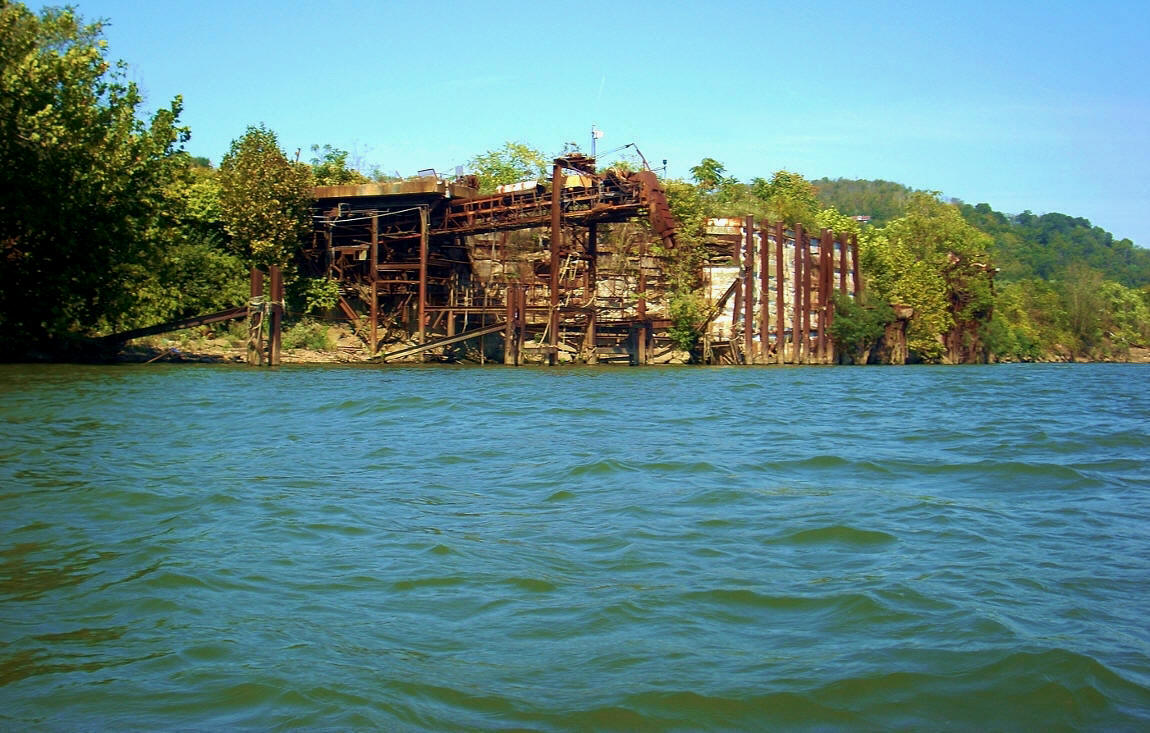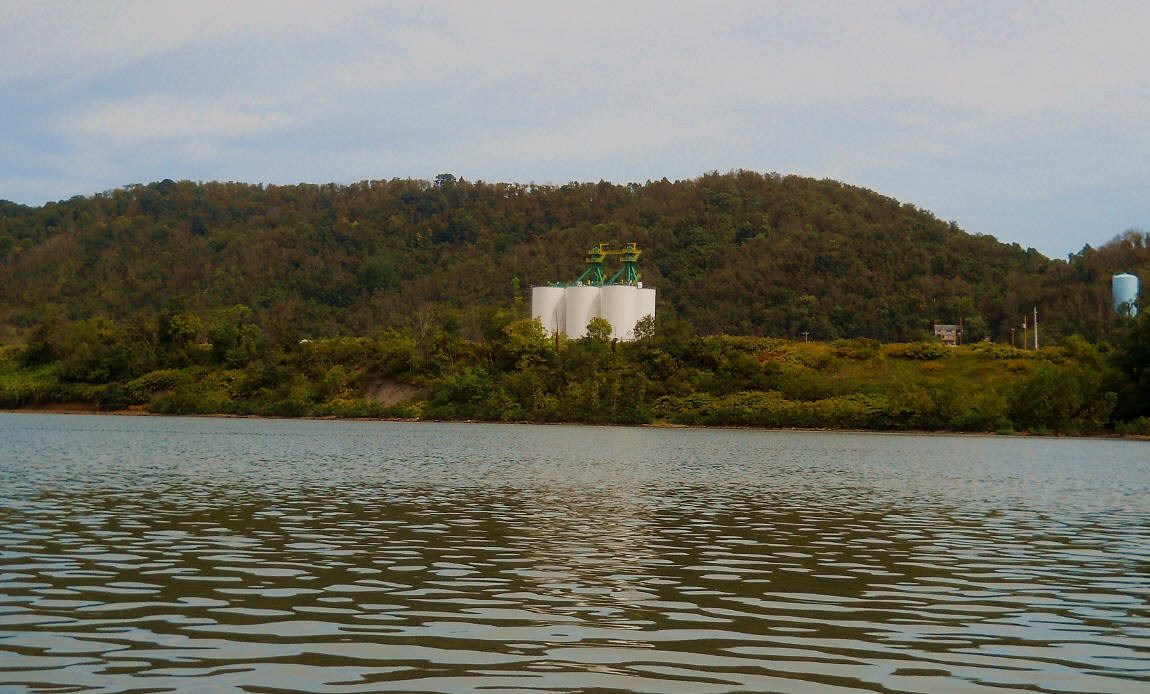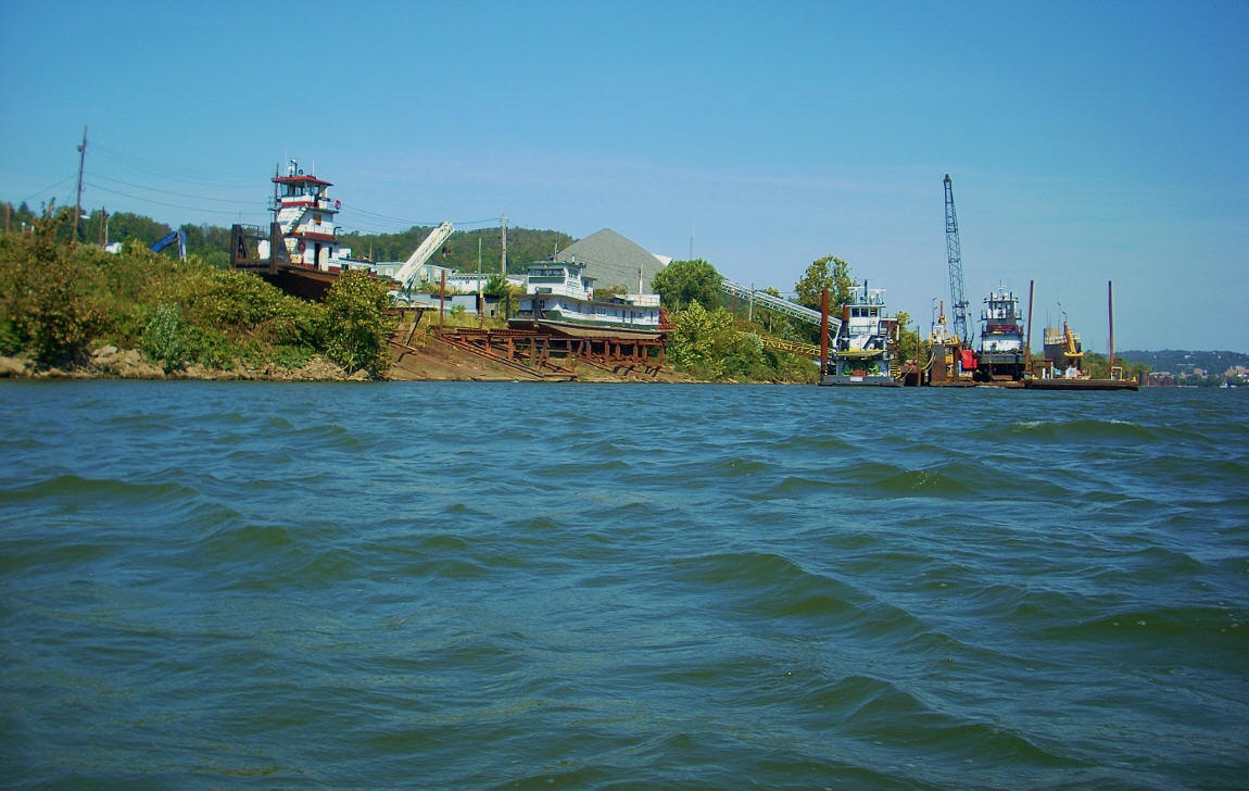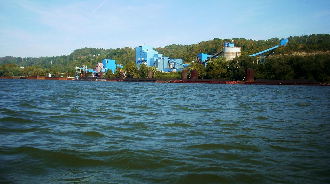 Now you're at about mile 94 and this is when you'll want to start being really careful. Both times I've been here there's been a very busy push boat on the right side at a business colored blue. This is actually a river port that supports a coal mine up there, and you can actually see the pipe that carries the coal down. This operation was first operated by Consolidated Energy as the Shoemaker Coal Mine, but it's currently known as Ohio County Coal Resources and it's run by American Consolidated Natural Resources Inc.