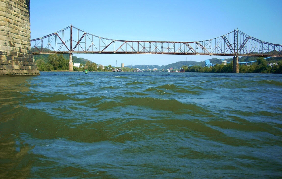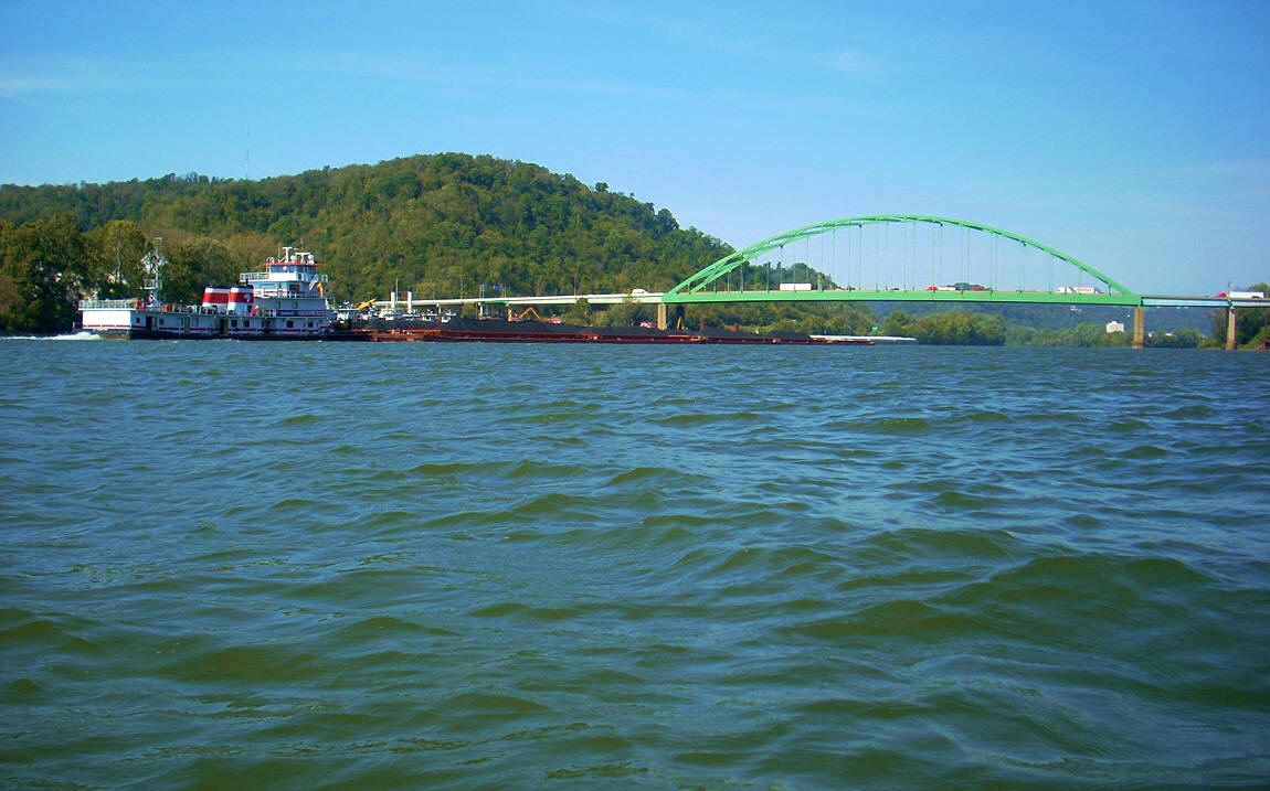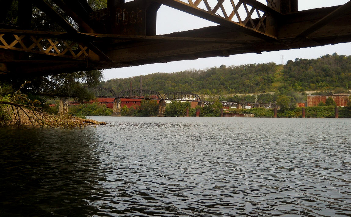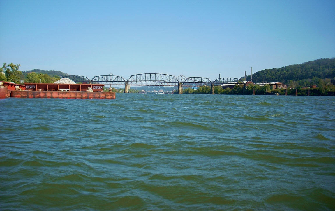 The shot below was taken on the Ohio side just before I reached Bellaire at mile 95. McMahon Creek comes in between the barge and the first bridge you see in the photo...