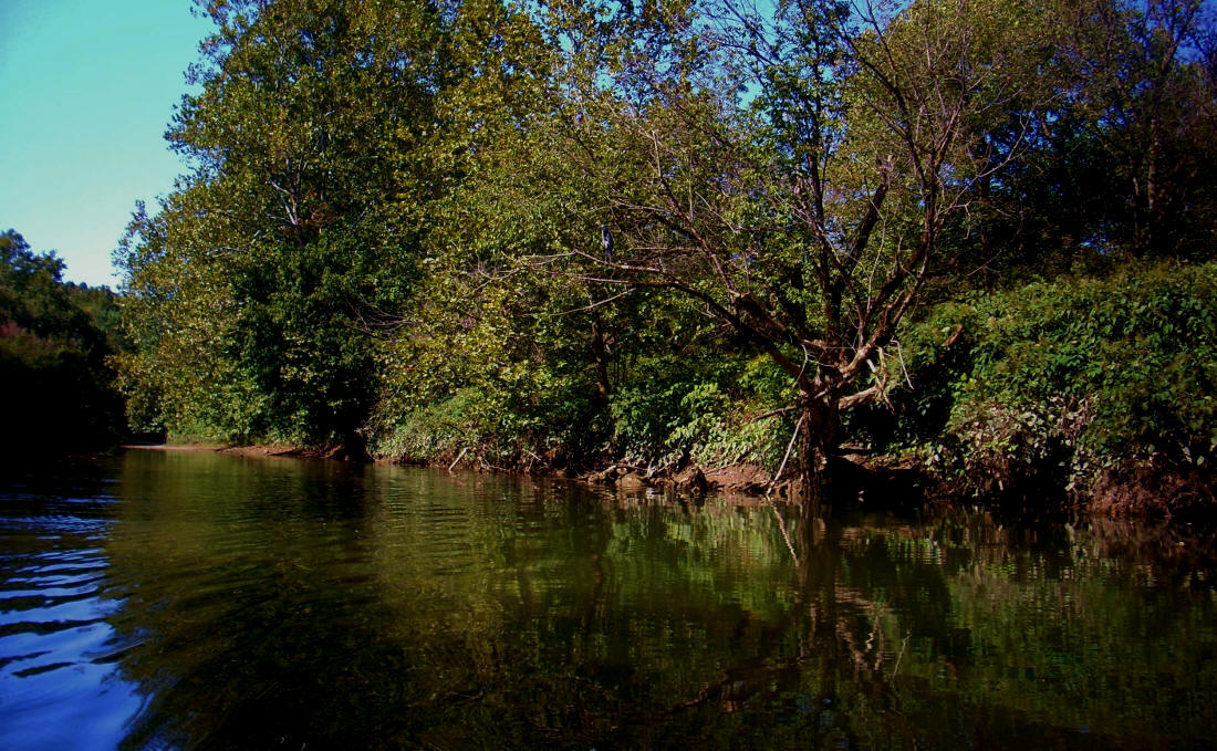 As I was coming out I was REALLY spooked by a blue heron, though! These birds are always down along the shoreline hunting fish, but as I was paddling underneath a tree an odd shadow caught the corner of my eye. Something was different... Well, I looked up to my left and not 5 yards away up in a tree was an utterly silent heron, beak open to look as menacing as possible. Normally the birds are passive and quiet, but when the season turns to Fall I've found them to be a little more standoffish, presumably wanting to concentrate on catching as much as possible before the temperatures get much colder. Do you see the bird just above center in the photo below? I had just paddled almost right under it! I thought about going back to get a closer picture, but heron beaks are long and sharp. I presume they could do a paddler a good bit of damage. I continued on my way.