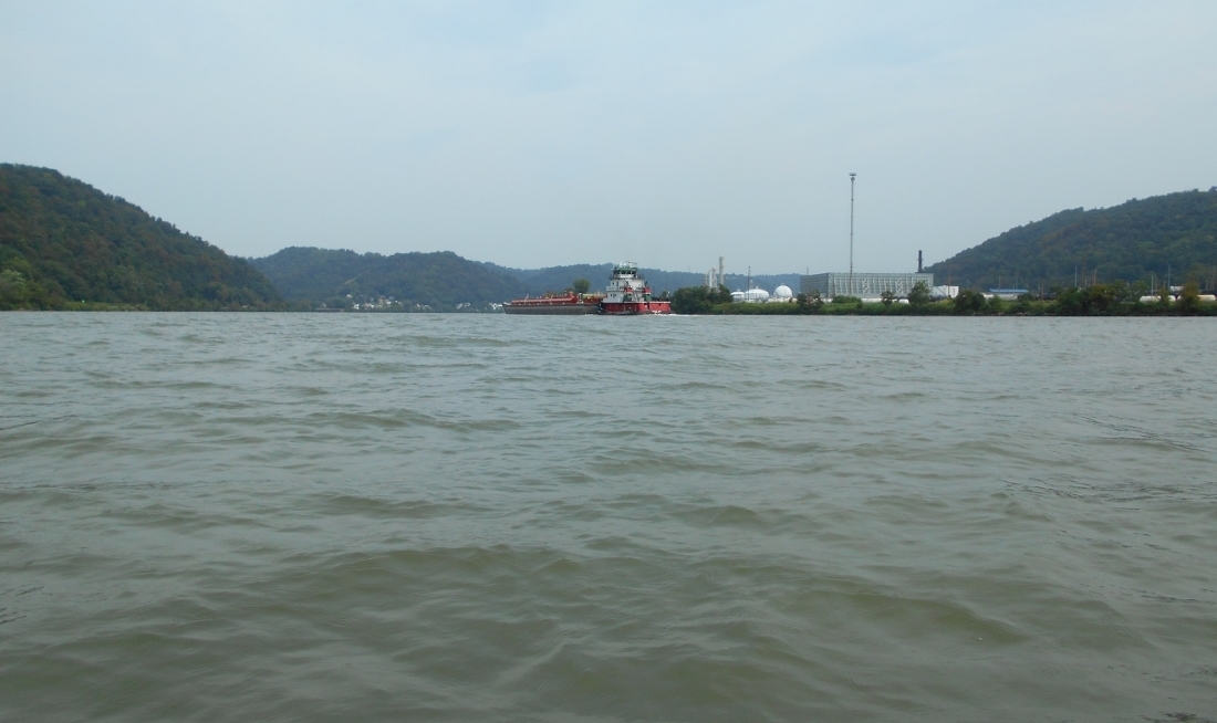 What follows here is a straight stretch of nearly 4 miles. The picture below will give you something of a perspective of this area with 2 more mile-long facilities on your right and Clarington, Ohio way down there at the end. Covestro which used to be Bayer Material Science) comes first and another mile later comes Westlake Chemical (formerly Axiall). Between these you'll find Opossum Creek on the left at about mile 120.
