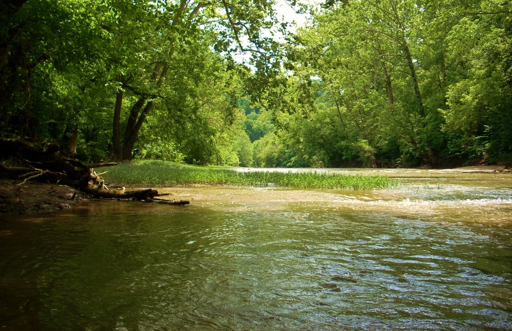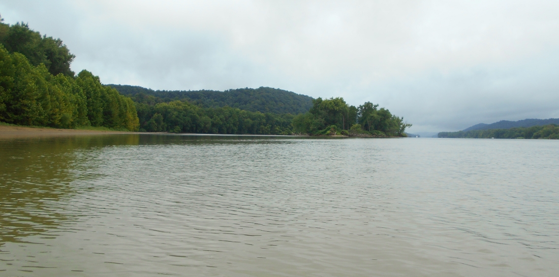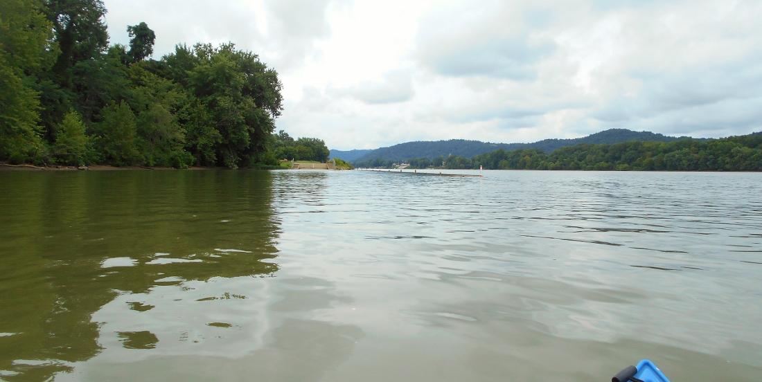 From this point on you'll mostly be in the midst of a left curve in the river on up to the dam. There's clearly some nice farmland on the Ohio side that you'll occasionally be able to spot glimpses of (in fact, it appears there's a golf course up there - Fairway's Riverside Golf Course). There will also be a couple rocky shoals where little streams come in.